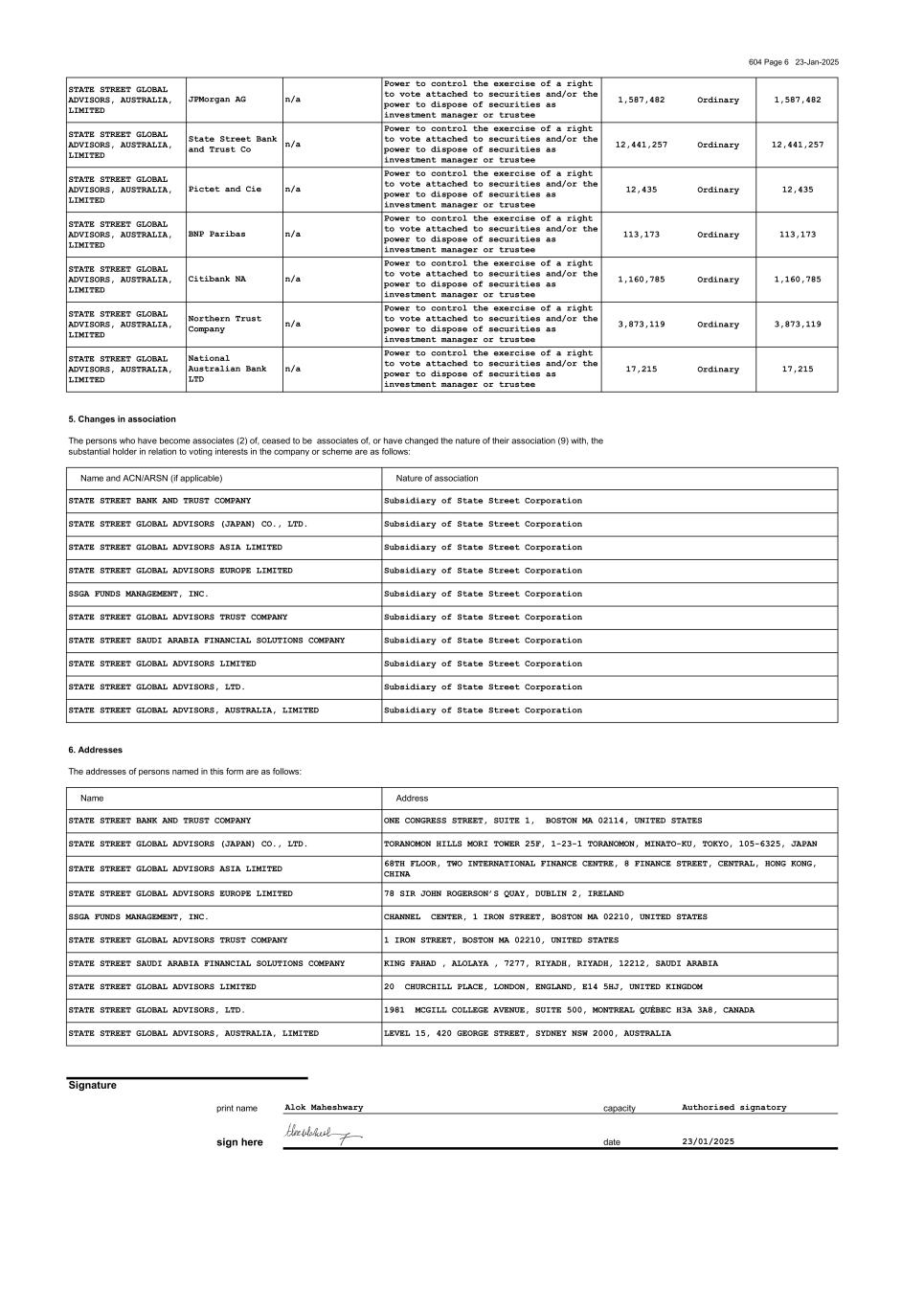 604 Page 6 23-Jan-2025 STATE STREET GLOBAL ADVISORS, AUSTRALIA, LIMITED 1,587,482 Ordinary 1,587,482 STATE STREET GLOBAL ADVISORS, AUSTRALIA, LIMITED 12,441,257 Ordinary 12,441,257 STATE STREET GLOBAL ADVISORS, AUSTRALIA, LIMITED 12,435 Ordinary 12,435 STATE STREET GLOBAL ADVISORS, AUSTRALIA, LIMITED 113,173 Ordinary 113,173 STATE STREET GLOBAL ADVISORS, AUSTRALIA, LIMITED 1,160,785 Ordinary 1,160,785 STATE STREET GLOBAL ADVISORS, AUSTRALIA, LIMITED 3,873,119 Ordinary 3,873,119 STATE STREET GLOBAL ADVISORS, AUSTRALIA, LIMITED 17,215 Ordinary 17,215 5. Changes in association The persons who have become associates (2) of, ceased to be associates of, or have changed the nature of their association (9) with, the substantial holder in relation to voting interests in the company or scheme are as follows: 6. Addresses The addresses of persons named in this form are as follows: Signature print name capacity sign here date 23/01/2025 Authorised signatory 68TH FLOOR, TWO INTERNATIONAL FINANCE CENTRE, 8 FINANCE STREET, CENTRAL, HONG KONG, CHINA n/a Subsidiary of State Street Corporation STATE STREET GLOBAL ADVISORS (JAPAN) CO., LTD. STATE STREET GLOBAL ADVISORS, AUSTRALIA, LIMITED STATE STREET BANK AND TRUST COMPANY STATE STREET GLOBAL ADVISORS (JAPAN) CO., LTD. STATE STREET GLOBAL ADVISORS ASIA LIMITED STATE STREET GLOBAL ADVISORS EUROPE LIMITED SSGA FUNDS MANAGEMENT, INC. STATE STREET GLOBAL ADVISORS TRUST COMPANY STATE STREET SAUDI ARABIA FINANCIAL SOLUTIONS COMPANY STATE STREET SAUDI ARABIA FINANCIAL SOLUTIONS COMPANY Power to control the exercise of a right to vote attached to securities and/or the power to dispose of securities as investment manager or trustee STATE STREET BANK AND TRUST COMPANY 20 CHURCHILL PLACE, LONDON, ENGLAND, E14 5HJ, UNITED KINGDOM Power to control the exercise of a right to vote attached to securities and/or the power to dispose of securities as investment manager or trustee n/a 1981 MCGILL COLLEGE AVENUE, SUITE 500, MONTREAL QUÉBEC H3A 3A8, CANADA Subsidiary of State Street Corporation STATE STREET GLOBAL ADVISORS LIMITED Power to control the exercise of a right to vote attached to securities and/or the power to dispose of securities as investment manager or trustee n/a LEVEL 15, 420 GEORGE STREET, SYDNEY NSW 2000, AUSTRALIA Power to control the exercise of a right to vote attached to securities and/or the power to dispose of securities as investment manager or trustee 78 SIR JOHN ROGERSON’S QUAY, DUBLIN 2, IRELAND Subsidiary of State Street Corporation Subsidiary of State Street Corporation National Australian Bank LTD Northern Trust Company Pictet and Cie JPMorgan AG n/a Address STATE STREET GLOBAL ADVISORS ASIA LIMITED STATE STREET GLOBAL ADVISORS LIMITED STATE STREET GLOBAL ADVISORS, LTD. n/a CHANNEL CENTER, 1 IRON STREET, BOSTON MA 02210, UNITED STATES Subsidiary of State Street Corporation State Street Bank and Trust Co KING FAHAD , ALOLAYA , 7277, RIYADH, RIYADH, 12212, SAUDI ARABIA n/a Power to control the exercise of a right to vote attached to securities and/or the power to dispose of securities as investment manager or trustee Alok Maheshwary Subsidiary of State Street Corporation STATE STREET GLOBAL ADVISORS EUROPE LIMITED Nature of association STATE STREET GLOBAL ADVISORS, LTD. STATE STREET GLOBAL ADVISORS, AUSTRALIA, LIMITED 1 IRON STREET, BOSTON MA 02210, UNITED STATES ONE CONGRESS STREET, SUITE 1, BOSTON MA 02114, UNITED STATES Subsidiary of State Street Corporation Power to control the exercise of a right to vote attached to securities and/or the power to dispose of securities as investment manager or trustee TORANOMON HILLS MORI TOWER 25F, 1-23-1 TORANOMON, MINATO-KU, TOKYO, 105-6325, JAPAN Power to control the exercise of a right to vote attached to securities and/or the power to dispose of securities as investment manager or trustee Subsidiary of State Street Corporation Subsidiary of State Street Corporation Name and ACN/ARSN (if applicable) BNP Paribas n/a STATE STREET GLOBAL ADVISORS TRUST COMPANY Citibank NA Name Subsidiary of State Street Corporation SSGA FUNDS MANAGEMENT, INC.
