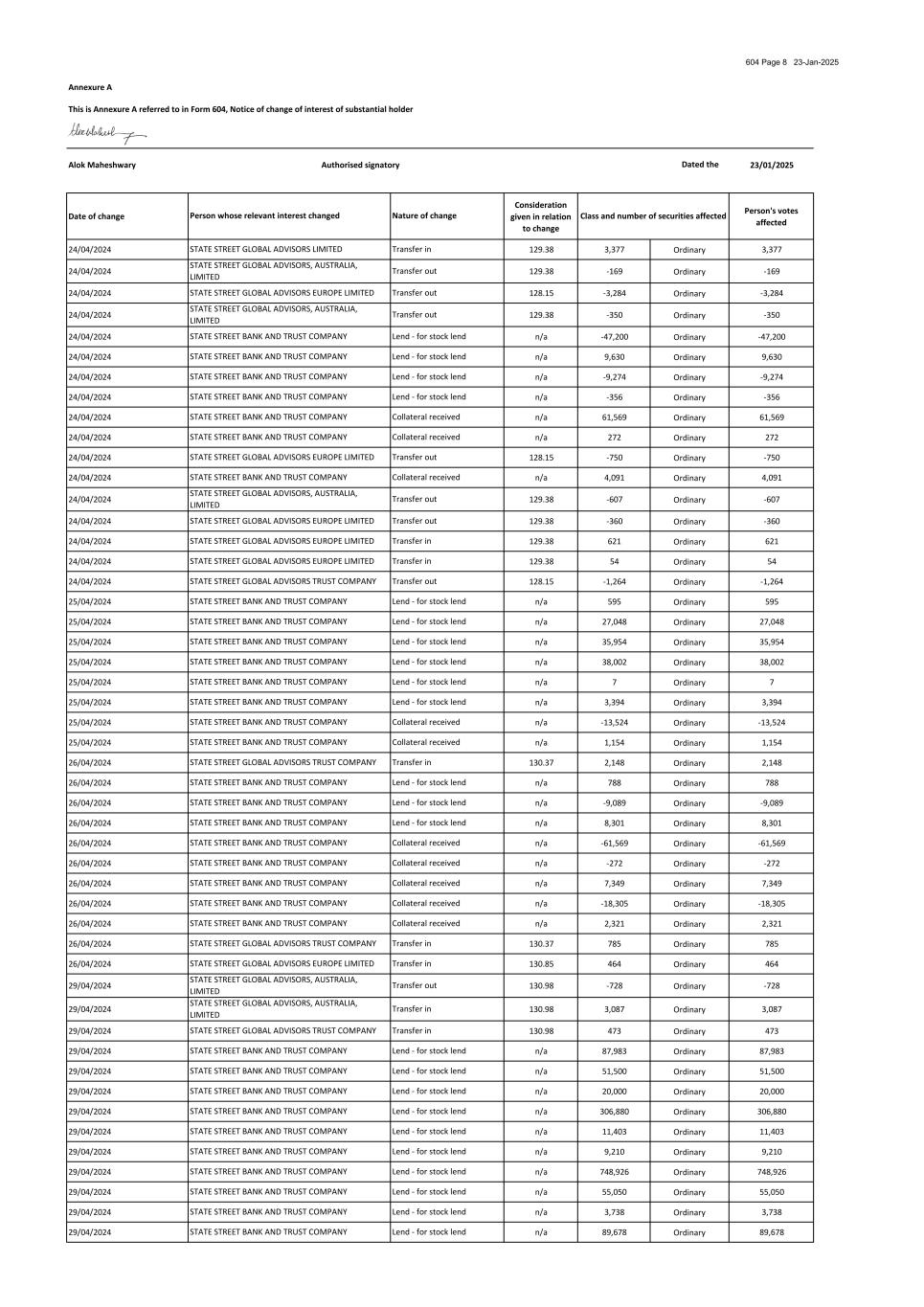 604 Page 8 23-Jan-2025 Annexure A This is Annexure A referred to in Form 604, Notice of change of interest of substantial holder 23/01/2025 Date of change Consideration given in relation to change Person's votes affected 24/04/2024 129.38 3,377 Ordinary 3,377 24/04/2024 129.38 -169 Ordinary -169 24/04/2024 128.15 -3,284 Ordinary -3,284 24/04/2024 129.38 -350 Ordinary -350 24/04/2024 n/a -47,200 Ordinary -47,200 24/04/2024 n/a 9,630 Ordinary 9,630 24/04/2024 n/a -9,274 Ordinary -9,274 24/04/2024 n/a -356 Ordinary -356 24/04/2024 n/a 61,569 Ordinary 61,569 24/04/2024 n/a 272 Ordinary 272 24/04/2024 128.15 -750 Ordinary -750 24/04/2024 n/a 4,091 Ordinary 4,091 24/04/2024 129.38 -607 Ordinary -607 24/04/2024 129.38 -360 Ordinary -360 24/04/2024 129.38 621 Ordinary 621 24/04/2024 129.38 54 Ordinary 54 24/04/2024 128.15 -1,264 Ordinary -1,264 25/04/2024 n/a 595 Ordinary 595 25/04/2024 n/a 27,048 Ordinary 27,048 25/04/2024 n/a 35,954 Ordinary 35,954 25/04/2024 n/a 38,002 Ordinary 38,002 25/04/2024 n/a 7 Ordinary 7 25/04/2024 n/a 3,394 Ordinary 3,394 25/04/2024 n/a -13,524 Ordinary -13,524 25/04/2024 n/a 1,154 Ordinary 1,154 26/04/2024 130.37 2,148 Ordinary 2,148 26/04/2024 n/a 788 Ordinary 788 26/04/2024 n/a -9,089 Ordinary -9,089 26/04/2024 n/a 8,301 Ordinary 8,301 26/04/2024 n/a -61,569 Ordinary -61,569 26/04/2024 n/a -272 Ordinary -272 26/04/2024 n/a 7,349 Ordinary 7,349 26/04/2024 n/a -18,305 Ordinary -18,305 26/04/2024 n/a 2,321 Ordinary 2,321 26/04/2024 130.37 785 Ordinary 785 26/04/2024 130.85 464 Ordinary 464 29/04/2024 130.98 -728 Ordinary -728 29/04/2024 130.98 3,087 Ordinary 3,087 29/04/2024 130.98 473 Ordinary 473 29/04/2024 n/a 87,983 Ordinary 87,983 29/04/2024 n/a 51,500 Ordinary 51,500 29/04/2024 n/a 20,000 Ordinary 20,000 29/04/2024 n/a 306,880 Ordinary 306,880 29/04/2024 n/a 11,403 Ordinary 11,403 29/04/2024 n/a 9,210 Ordinary 9,210 29/04/2024 n/a 748,926 Ordinary 748,926 29/04/2024 n/a 55,050 Ordinary 55,050 29/04/2024 n/a 3,738 Ordinary 3,738 29/04/2024 n/a 89,678 Ordinary 89,678 Dated the Transfer in STATE STREET BANK AND TRUST COMPANY STATE STREET BANK AND TRUST COMPANY Lend - for stock lend STATE STREET BANK AND TRUST COMPANY Collateral received Person whose relevant interest changed Lend - for stock lend STATE STREET GLOBAL ADVISORS TRUST COMPANY Lend - for stock lend STATE STREET GLOBAL ADVISORS EUROPE LIMITED Lend - for stock lend Transfer in STATE STREET BANK AND TRUST COMPANY Collateral received STATE STREET BANK AND TRUST COMPANY Lend - for stock lend STATE STREET GLOBAL ADVISORS TRUST COMPANY Transfer out STATE STREET BANK AND TRUST COMPANY Transfer out STATE STREET BANK AND TRUST COMPANY Lend - for stock lend STATE STREET BANK AND TRUST COMPANY STATE STREET BANK AND TRUST COMPANY Lend - for stock lend STATE STREET BANK AND TRUST COMPANY Collateral received STATE STREET GLOBAL ADVISORS LIMITED Lend - for stock lend STATE STREET BANK AND TRUST COMPANY Collateral received STATE STREET BANK AND TRUST COMPANY STATE STREET BANK AND TRUST COMPANY Lend - for stock lend STATE STREET BANK AND TRUST COMPANY Transfer in STATE STREET BANK AND TRUST COMPANY Lend - for stock lend STATE STREET GLOBAL ADVISORS, AUSTRALIA, LIMITED Transfer out Transfer out STATE STREET GLOBAL ADVISORS TRUST COMPANY Collateral received STATE STREET BANK AND TRUST COMPANY STATE STREET BANK AND TRUST COMPANY Lend - for stock lend Lend - for stock lend STATE STREET GLOBAL ADVISORS, AUSTRALIA, LIMITED STATE STREET BANK AND TRUST COMPANY Transfer in Collateral received STATE STREET BANK AND TRUST COMPANY Transfer in Authorised signatory STATE STREET BANK AND TRUST COMPANY Transfer out STATE STREET BANK AND TRUST COMPANY Lend - for stock lend STATE STREET GLOBAL ADVISORS EUROPE LIMITED Alok Maheshwary Collateral received Transfer out STATE STREET GLOBAL ADVISORS EUROPE LIMITED Collateral received STATE STREET BANK AND TRUST COMPANY Lend - for stock lend STATE STREET GLOBAL ADVISORS EUROPE LIMITED Lend - for stock lend STATE STREET BANK AND TRUST COMPANY Lend - for stock lend Transfer in STATE STREET BANK AND TRUST COMPANY STATE STREET BANK AND TRUST COMPANY Class and number of securities affected Transfer in STATE STREET BANK AND TRUST COMPANY STATE STREET GLOBAL ADVISORS EUROPE LIMITED Collateral received STATE STREET GLOBAL ADVISORS, AUSTRALIA, LIMITED Lend - for stock lend STATE STREET GLOBAL ADVISORS TRUST COMPANY Lend - for stock lend STATE STREET BANK AND TRUST COMPANY Nature of change Lend - for stock lend STATE STREET GLOBAL ADVISORS, AUSTRALIA, LIMITED Transfer out STATE STREET BANK AND TRUST COMPANY Transfer out Transfer in STATE STREET BANK AND TRUST COMPANY STATE STREET BANK AND TRUST COMPANY STATE STREET BANK AND TRUST COMPANY STATE STREET GLOBAL ADVISORS, AUSTRALIA, LIMITED Lend - for stock lend STATE STREET GLOBAL ADVISORS EUROPE LIMITED Collateral received STATE STREET BANK AND TRUST COMPANY Lend - for stock lend Lend - for stock lend STATE STREET BANK AND TRUST COMPANY Lend - for stock lend