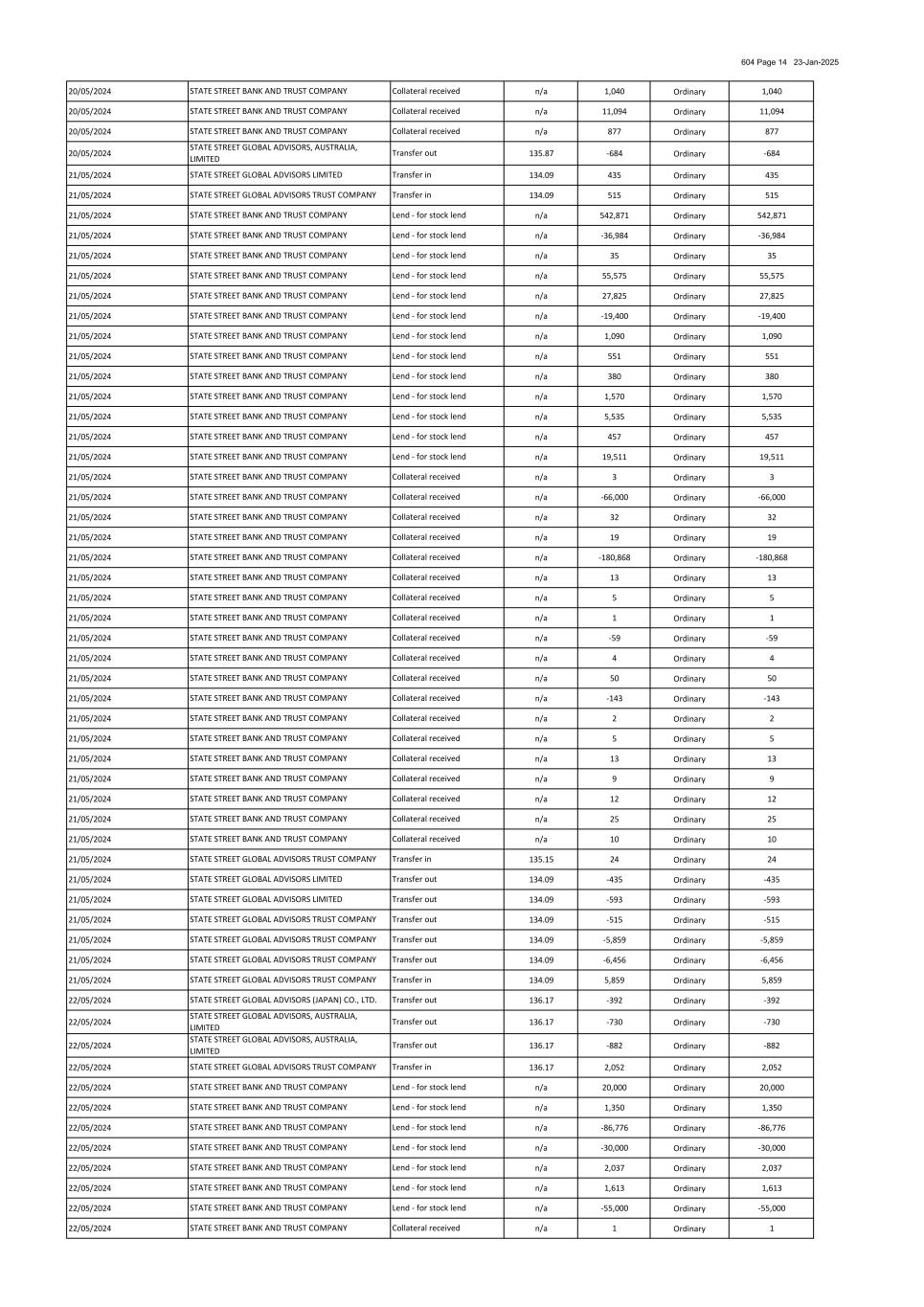 604 Page 13 23-Jan-2025 15/05/2024 n/a 16,357 Ordinary 16,357 15/05/2024 n/a 2,108 Ordinary 2,108 15/05/2024 n/a 79,726 Ordinary 79,726 15/05/2024 n/a -27,726 Ordinary -27,726 15/05/2024 129.48 826 Ordinary 826 15/05/2024 129.48 558 Ordinary 558 15/05/2024 129.48 60,154 Ordinary 60,154 15/05/2024 129.48 -208 Ordinary -208 16/05/2024 130.39 -38,361 Ordinary -38,361 16/05/2024 130.46 -190 Ordinary -190 16/05/2024 130.99 -163 Ordinary -163 16/05/2024 n/a 764 Ordinary 764 16/05/2024 n/a -31,799 Ordinary -31,799 16/05/2024 n/a 806 Ordinary 806 16/05/2024 n/a -3,140 Ordinary -3,140 16/05/2024 n/a 1,570 Ordinary 1,570 16/05/2024 n/a 72,000 Ordinary 72,000 16/05/2024 n/a 12,828 Ordinary 12,828 16/05/2024 130.46 -257 Ordinary -257 17/05/2024 n/a -188,933 Ordinary -188,933 17/05/2024 n/a -304,000 Ordinary -304,000 17/05/2024 n/a 137,335 Ordinary 137,335 17/05/2024 131.10 336 Ordinary 336 17/05/2024 132.15 -9 Ordinary -9 17/05/2024 132.15 -2,079 Ordinary -2,079 17/05/2024 n/a 8,032 Ordinary 8,032 20/05/2024 134.13 224 Ordinary 224 20/05/2024 135.77 -5,893 Ordinary -5,893 20/05/2024 135.87 1,128 Ordinary 1,128 20/05/2024 n/a 3,228 Ordinary 3,228 20/05/2024 n/a -185,000 Ordinary -185,000 20/05/2024 n/a 3,738 Ordinary 3,738 20/05/2024 n/a 8,067 Ordinary 8,067 20/05/2024 n/a 347 Ordinary 347 20/05/2024 n/a 31 Ordinary 31 20/05/2024 n/a 443 Ordinary 443 20/05/2024 n/a 21 Ordinary 21 20/05/2024 n/a 14,125 Ordinary 14,125 20/05/2024 n/a 508 Ordinary 508 20/05/2024 n/a 122 Ordinary 122 20/05/2024 n/a -56,000 Ordinary -56,000 20/05/2024 n/a 2,750 Ordinary 2,750 20/05/2024 n/a 8,140 Ordinary 8,140 20/05/2024 n/a 26 Ordinary 26 20/05/2024 n/a 43,533 Ordinary 43,533 20/05/2024 n/a 8,061 Ordinary 8,061 20/05/2024 n/a 400 Ordinary 400 20/05/2024 n/a 69 Ordinary 69 20/05/2024 n/a 19 Ordinary 19 20/05/2024 n/a 11,725 Ordinary 11,725 20/05/2024 n/a 1,717 Ordinary 1,717 20/05/2024 n/a 5,017 Ordinary 5,017 20/05/2024 n/a 996 Ordinary 996 20/05/2024 n/a 48 Ordinary 48 20/05/2024 n/a 434 Ordinary 434 20/05/2024 n/a 723 Ordinary 723 20/05/2024 n/a 745 Ordinary 745 Collateral received STATE STREET GLOBAL ADVISORS, LTD. Lend - for stock lend Collateral received STATE STREET BANK AND TRUST COMPANY Collateral received Collateral received STATE STREET BANK AND TRUST COMPANY STATE STREET BANK AND TRUST COMPANY STATE STREET BANK AND TRUST COMPANY Transfer out STATE STREET BANK AND TRUST COMPANY Lend - for stock lend Lend - for stock lend Collateral received STATE STREET BANK AND TRUST COMPANY STATE STREET GLOBAL ADVISORS TRUST COMPANY STATE STREET BANK AND TRUST COMPANY Lend - for stock lend STATE STREET GLOBAL ADVISORS, AUSTRALIA, LIMITED Collateral received SSGA FUNDS MANAGEMENT, INC. STATE STREET BANK AND TRUST COMPANY Lend - for stock lend STATE STREET BANK AND TRUST COMPANY Lend - for stock lend Collateral received Collateral received Transfer out STATE STREET BANK AND TRUST COMPANY Collateral received STATE STREET BANK AND TRUST COMPANY STATE STREET BANK AND TRUST COMPANY Collateral received STATE STREET BANK AND TRUST COMPANY STATE STREET BANK AND TRUST COMPANY STATE STREET GLOBAL ADVISORS EUROPE LIMITED Lend - for stock lend Transfer in Lend - for stock lend STATE STREET BANK AND TRUST COMPANY STATE STREET BANK AND TRUST COMPANY STATE STREET BANK AND TRUST COMPANY Lend - for stock lend Collateral received Collateral received STATE STREET BANK AND TRUST COMPANY STATE STREET BANK AND TRUST COMPANY Collateral received STATE STREET BANK AND TRUST COMPANY Transfer in Transfer out STATE STREET BANK AND TRUST COMPANY Collateral received STATE STREET BANK AND TRUST COMPANY STATE STREET BANK AND TRUST COMPANY Collateral received Collateral received STATE STREET GLOBAL ADVISORS, AUSTRALIA, LIMITED STATE STREET BANK AND TRUST COMPANY STATE STREET BANK AND TRUST COMPANY Collateral received Transfer out STATE STREET BANK AND TRUST COMPANY Lend - for stock lend STATE STREET BANK AND TRUST COMPANY Transfer in Collateral received SSGA FUNDS MANAGEMENT, INC. Lend - for stock lend Collateral received STATE STREET BANK AND TRUST COMPANY Collateral received STATE STREET BANK AND TRUST COMPANY STATE STREET BANK AND TRUST COMPANY SSGA FUNDS MANAGEMENT, INC. Transfer in Lend - for stock lend Collateral received STATE STREET BANK AND TRUST COMPANY STATE STREET BANK AND TRUST COMPANY Collateral received STATE STREET GLOBAL ADVISORS TRUST COMPANY STATE STREET BANK AND TRUST COMPANY Transfer in Transfer out STATE STREET GLOBAL ADVISORS EUROPE LIMITED Lend - for stock lend STATE STREET BANK AND TRUST COMPANY Collateral received STATE STREET GLOBAL ADVISORS (JAPAN) CO., LTD. Transfer in Lend - for stock lend STATE STREET GLOBAL ADVISORS TRUST COMPANY Collateral received Collateral received STATE STREET BANK AND TRUST COMPANY STATE STREET BANK AND TRUST COMPANY Lend - for stock lend STATE STREET BANK AND TRUST COMPANY STATE STREET BANK AND TRUST COMPANY Transfer out Transfer out Lend - for stock lend STATE STREET BANK AND TRUST COMPANY STATE STREET BANK AND TRUST COMPANY STATE STREET BANK AND TRUST COMPANY Transfer out STATE STREET GLOBAL ADVISORS, AUSTRALIA, LIMITED STATE STREET GLOBAL ADVISORS, AUSTRALIA, LIMITED Collateral received STATE STREET BANK AND TRUST COMPANY STATE STREET BANK AND TRUST COMPANY Lend - for stock lend