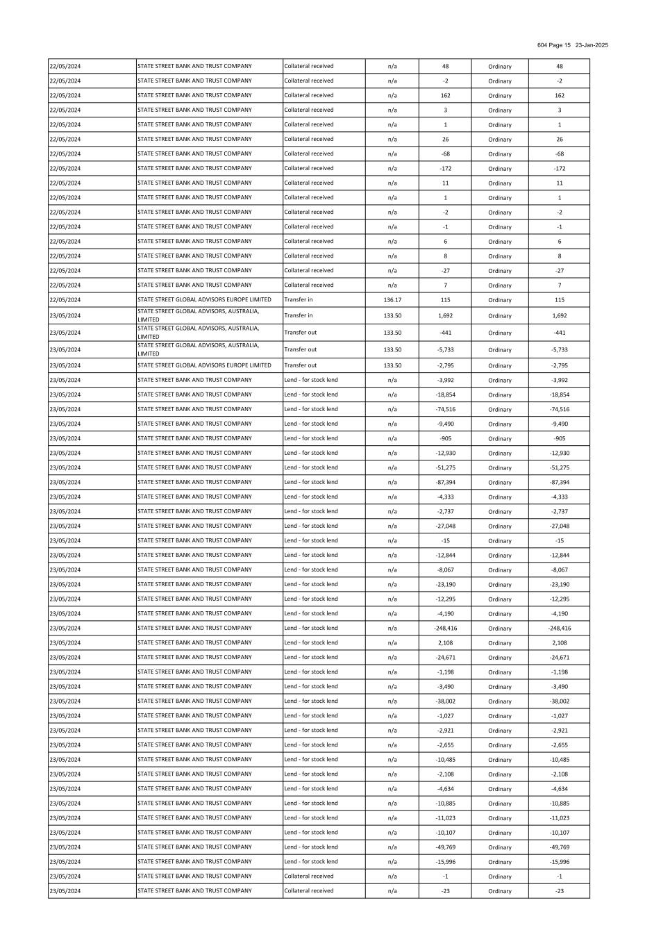 604 Page 15 23-Jan-2025 22/05/2024 n/a 48 Ordinary 48 22/05/2024 n/a -2 Ordinary -2 22/05/2024 n/a 162 Ordinary 162 22/05/2024 n/a 3 Ordinary 3 22/05/2024 n/a 1 Ordinary 1 22/05/2024 n/a 26 Ordinary 26 22/05/2024 n/a -68 Ordinary -68 22/05/2024 n/a -172 Ordinary -172 22/05/2024 n/a 11 Ordinary 11 22/05/2024 n/a 1 Ordinary 1 22/05/2024 n/a -2 Ordinary -2 22/05/2024 n/a -1 Ordinary -1 22/05/2024 n/a 6 Ordinary 6 22/05/2024 n/a 8 Ordinary 8 22/05/2024 n/a -27 Ordinary -27 22/05/2024 n/a 7 Ordinary 7 22/05/2024 136.17 115 Ordinary 115 23/05/2024 133.50 1,692 Ordinary 1,692 23/05/2024 133.50 -441 Ordinary -441 23/05/2024 133.50 -5,733 Ordinary -5,733 23/05/2024 133.50 -2,795 Ordinary -2,795 23/05/2024 n/a -3,992 Ordinary -3,992 23/05/2024 n/a -18,854 Ordinary -18,854 23/05/2024 n/a -74,516 Ordinary -74,516 23/05/2024 n/a -9,490 Ordinary -9,490 23/05/2024 n/a -905 Ordinary -905 23/05/2024 n/a -12,930 Ordinary -12,930 23/05/2024 n/a -51,275 Ordinary -51,275 23/05/2024 n/a -87,394 Ordinary -87,394 23/05/2024 n/a -4,333 Ordinary -4,333 23/05/2024 n/a -2,737 Ordinary -2,737 23/05/2024 n/a -27,048 Ordinary -27,048 23/05/2024 n/a -15 Ordinary -15 23/05/2024 n/a -12,844 Ordinary -12,844 23/05/2024 n/a -8,067 Ordinary -8,067 23/05/2024 n/a -23,190 Ordinary -23,190 23/05/2024 n/a -12,295 Ordinary -12,295 23/05/2024 n/a -4,190 Ordinary -4,190 23/05/2024 n/a -248,416 Ordinary -248,416 23/05/2024 n/a 2,108 Ordinary 2,108 23/05/2024 n/a -24,671 Ordinary -24,671 23/05/2024 n/a -1,198 Ordinary -1,198 23/05/2024 n/a -3,490 Ordinary -3,490 23/05/2024 n/a -38,002 Ordinary -38,002 23/05/2024 n/a -1,027 Ordinary -1,027 23/05/2024 n/a -2,921 Ordinary -2,921 23/05/2024 n/a -2,655 Ordinary -2,655 23/05/2024 n/a -10,485 Ordinary -10,485 23/05/2024 n/a -2,108 Ordinary -2,108 23/05/2024 n/a -4,634 Ordinary -4,634 23/05/2024 n/a -10,885 Ordinary -10,885 23/05/2024 n/a -11,023 Ordinary -11,023 23/05/2024 n/a -10,107 Ordinary -10,107 23/05/2024 n/a -49,769 Ordinary -49,769 23/05/2024 n/a -15,996 Ordinary -15,996 23/05/2024 n/a -1 Ordinary -1 23/05/2024 n/a -23 Ordinary -23 STATE STREET BANK AND TRUST COMPANY Lend - for stock lend STATE STREET BANK AND TRUST COMPANY Collateral received Lend - for stock lend STATE STREET BANK AND TRUST COMPANY Lend - for stock lend STATE STREET BANK AND TRUST COMPANY STATE STREET BANK AND TRUST COMPANY STATE STREET BANK AND TRUST COMPANY STATE STREET BANK AND TRUST COMPANY STATE STREET BANK AND TRUST COMPANY Lend - for stock lend STATE STREET GLOBAL ADVISORS EUROPE LIMITED Lend - for stock lend Collateral received STATE STREET BANK AND TRUST COMPANY Lend - for stock lend STATE STREET BANK AND TRUST COMPANY Collateral received Lend - for stock lend Transfer in STATE STREET BANK AND TRUST COMPANY Collateral received STATE STREET BANK AND TRUST COMPANY Lend - for stock lend Collateral received STATE STREET BANK AND TRUST COMPANY STATE STREET BANK AND TRUST COMPANY Lend - for stock lend Transfer in STATE STREET BANK AND TRUST COMPANY STATE STREET BANK AND TRUST COMPANY Lend - for stock lend STATE STREET BANK AND TRUST COMPANY STATE STREET BANK AND TRUST COMPANY Lend - for stock lend Lend - for stock lend STATE STREET GLOBAL ADVISORS EUROPE LIMITED STATE STREET BANK AND TRUST COMPANY STATE STREET BANK AND TRUST COMPANY STATE STREET BANK AND TRUST COMPANY Collateral received Lend - for stock lend Collateral received Collateral received STATE STREET BANK AND TRUST COMPANY Lend - for stock lend STATE STREET BANK AND TRUST COMPANY STATE STREET BANK AND TRUST COMPANY Lend - for stock lend STATE STREET BANK AND TRUST COMPANY Collateral received Transfer out STATE STREET BANK AND TRUST COMPANY Lend - for stock lend STATE STREET BANK AND TRUST COMPANY Lend - for stock lend STATE STREET BANK AND TRUST COMPANY Lend - for stock lend STATE STREET GLOBAL ADVISORS, AUSTRALIA, LIMITED STATE STREET BANK AND TRUST COMPANY STATE STREET BANK AND TRUST COMPANY Lend - for stock lend Collateral received STATE STREET BANK AND TRUST COMPANY Lend - for stock lend Lend - for stock lend STATE STREET BANK AND TRUST COMPANY Collateral received STATE STREET BANK AND TRUST COMPANY Lend - for stock lend Collateral received STATE STREET BANK AND TRUST COMPANY Collateral received Transfer out STATE STREET BANK AND TRUST COMPANY Lend - for stock lend STATE STREET BANK AND TRUST COMPANY STATE STREET BANK AND TRUST COMPANY STATE STREET BANK AND TRUST COMPANY Lend - for stock lend STATE STREET GLOBAL ADVISORS, AUSTRALIA, LIMITED Lend - for stock lend STATE STREET BANK AND TRUST COMPANY STATE STREET BANK AND TRUST COMPANY Lend - for stock lend STATE STREET BANK AND TRUST COMPANY Lend - for stock lend Collateral received Collateral received STATE STREET BANK AND TRUST COMPANY Lend - for stock lend STATE STREET BANK AND TRUST COMPANY STATE STREET BANK AND TRUST COMPANY Collateral received Transfer out STATE STREET BANK AND TRUST COMPANY STATE STREET BANK AND TRUST COMPANY Lend - for stock lend STATE STREET BANK AND TRUST COMPANY STATE STREET BANK AND TRUST COMPANY Lend - for stock lend STATE STREET BANK AND TRUST COMPANY Lend - for stock lend STATE STREET GLOBAL ADVISORS, AUSTRALIA, LIMITED STATE STREET BANK AND TRUST COMPANY Collateral received Lend - for stock lend STATE STREET BANK AND TRUST COMPANY Lend - for stock lend STATE STREET BANK AND TRUST COMPANY Lend - for stock lend Collateral received