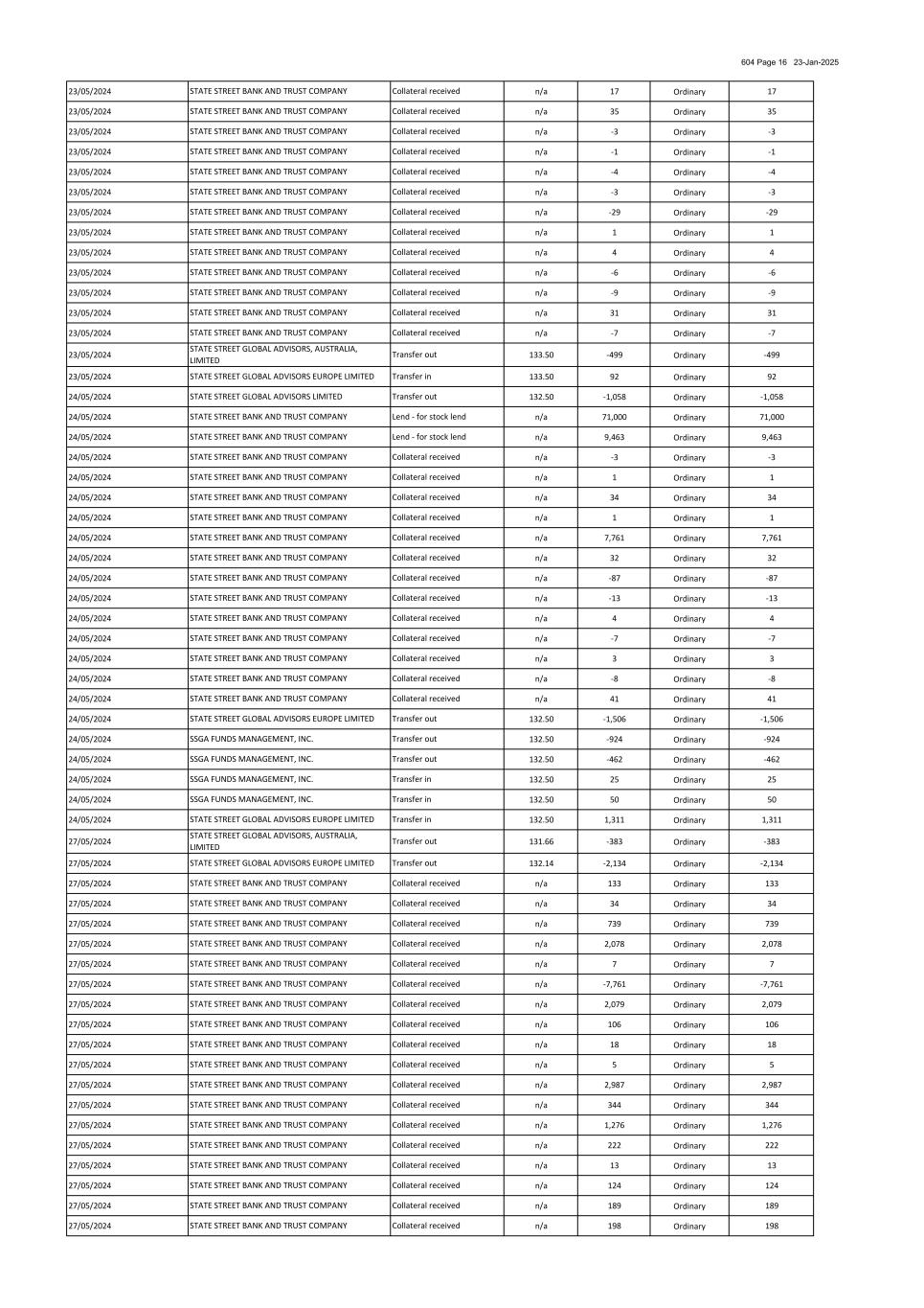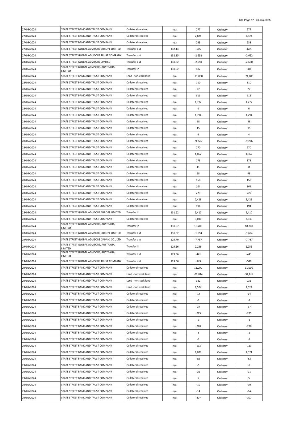 604 Page 16 23-Jan-2025 23/05/2024 n/a 17 Ordinary 17 23/05/2024 n/a 35 Ordinary 35 23/05/2024 n/a -3 Ordinary -3 23/05/2024 n/a -1 Ordinary -1 23/05/2024 n/a -4 Ordinary -4 23/05/2024 n/a -3 Ordinary -3 23/05/2024 n/a -29 Ordinary -29 23/05/2024 n/a 1 Ordinary 1 23/05/2024 n/a 4 Ordinary 4 23/05/2024 n/a -6 Ordinary -6 23/05/2024 n/a -9 Ordinary -9 23/05/2024 n/a 31 Ordinary 31 23/05/2024 n/a -7 Ordinary -7 23/05/2024 133.50 -499 Ordinary -499 23/05/2024 133.50 92 Ordinary 92 24/05/2024 132.50 -1,058 Ordinary -1,058 24/05/2024 n/a 71,000 Ordinary 71,000 24/05/2024 n/a 9,463 Ordinary 9,463 24/05/2024 n/a -3 Ordinary -3 24/05/2024 n/a 1 Ordinary 1 24/05/2024 n/a 34 Ordinary 34 24/05/2024 n/a 1 Ordinary 1 24/05/2024 n/a 7,761 Ordinary 7,761 24/05/2024 n/a 32 Ordinary 32 24/05/2024 n/a -87 Ordinary -87 24/05/2024 n/a -13 Ordinary -13 24/05/2024 n/a 4 Ordinary 4 24/05/2024 n/a -7 Ordinary -7 24/05/2024 n/a 3 Ordinary 3 24/05/2024 n/a -8 Ordinary -8 24/05/2024 n/a 41 Ordinary 41 24/05/2024 132.50 -1,506 Ordinary -1,506 24/05/2024 132.50 -924 Ordinary -924 24/05/2024 132.50 -462 Ordinary -462 24/05/2024 132.50 25 Ordinary 25 24/05/2024 132.50 50 Ordinary 50 24/05/2024 132.50 1,311 Ordinary 1,311 27/05/2024 131.66 -383 Ordinary -383 27/05/2024 132.14 -2,134 Ordinary -2,134 27/05/2024 n/a 133 Ordinary 133 27/05/2024 n/a 34 Ordinary 34 27/05/2024 n/a 739 Ordinary 739 27/05/2024 n/a 2,078 Ordinary 2,078 27/05/2024 n/a 7 Ordinary 7 27/05/2024 n/a -7,761 Ordinary -7,761 27/05/2024 n/a 2,079 Ordinary 2,079 27/05/2024 n/a 106 Ordinary 106 27/05/2024 n/a 18 Ordinary 18 27/05/2024 n/a 5 Ordinary 5 27/05/2024 n/a 2,987 Ordinary 2,987 27/05/2024 n/a 344 Ordinary 344 27/05/2024 n/a 1,276 Ordinary 1,276 27/05/2024 n/a 222 Ordinary 222 27/05/2024 n/a 13 Ordinary 13 27/05/2024 n/a 124 Ordinary 124 27/05/2024 n/a 189 Ordinary 189 27/05/2024 n/a 198 Ordinary 198 Collateral received STATE STREET BANK AND TRUST COMPANY Collateral received Collateral received STATE STREET BANK AND TRUST COMPANY SSGA FUNDS MANAGEMENT, INC. Collateral received Collateral received Collateral received Transfer out STATE STREET BANK AND TRUST COMPANY STATE STREET BANK AND TRUST COMPANY Collateral received Collateral received Collateral received SSGA FUNDS MANAGEMENT, INC. STATE STREET BANK AND TRUST COMPANY STATE STREET GLOBAL ADVISORS EUROPE LIMITED Transfer in STATE STREET BANK AND TRUST COMPANY STATE STREET BANK AND TRUST COMPANY STATE STREET BANK AND TRUST COMPANY STATE STREET BANK AND TRUST COMPANY Collateral received Collateral received STATE STREET BANK AND TRUST COMPANY Collateral received Transfer in Collateral received STATE STREET BANK AND TRUST COMPANY STATE STREET BANK AND TRUST COMPANY STATE STREET BANK AND TRUST COMPANY Lend - for stock lend Collateral received SSGA FUNDS MANAGEMENT, INC. Collateral received STATE STREET BANK AND TRUST COMPANY Collateral received STATE STREET GLOBAL ADVISORS LIMITED Collateral received STATE STREET BANK AND TRUST COMPANY Collateral received STATE STREET BANK AND TRUST COMPANY Transfer out STATE STREET BANK AND TRUST COMPANY Collateral received STATE STREET BANK AND TRUST COMPANY Collateral received Transfer out Collateral received Lend - for stock lend Collateral received STATE STREET BANK AND TRUST COMPANY STATE STREET BANK AND TRUST COMPANY Collateral received Collateral received Collateral received STATE STREET BANK AND TRUST COMPANY STATE STREET BANK AND TRUST COMPANY Collateral received STATE STREET BANK AND TRUST COMPANY Collateral received STATE STREET BANK AND TRUST COMPANY STATE STREET GLOBAL ADVISORS EUROPE LIMITED STATE STREET BANK AND TRUST COMPANY STATE STREET BANK AND TRUST COMPANY STATE STREET BANK AND TRUST COMPANY Transfer out Collateral received Collateral received STATE STREET BANK AND TRUST COMPANY STATE STREET GLOBAL ADVISORS EUROPE LIMITED Collateral received Transfer out Collateral received STATE STREET BANK AND TRUST COMPANY STATE STREET BANK AND TRUST COMPANY Collateral received Transfer out Collateral received Collateral received STATE STREET GLOBAL ADVISORS, AUSTRALIA, LIMITED STATE STREET BANK AND TRUST COMPANY STATE STREET BANK AND TRUST COMPANY STATE STREET BANK AND TRUST COMPANY Collateral received STATE STREET BANK AND TRUST COMPANY Collateral received STATE STREET BANK AND TRUST COMPANY STATE STREET BANK AND TRUST COMPANY Transfer out Collateral received STATE STREET BANK AND TRUST COMPANY Collateral received STATE STREET BANK AND TRUST COMPANY STATE STREET BANK AND TRUST COMPANY Collateral received SSGA FUNDS MANAGEMENT, INC. Collateral received Collateral received STATE STREET BANK AND TRUST COMPANY Transfer in Collateral received STATE STREET BANK AND TRUST COMPANY STATE STREET GLOBAL ADVISORS EUROPE LIMITED STATE STREET BANK AND TRUST COMPANY STATE STREET BANK AND TRUST COMPANY Collateral received STATE STREET GLOBAL ADVISORS, AUSTRALIA, LIMITED Collateral received STATE STREET BANK AND TRUST COMPANY STATE STREET BANK AND TRUST COMPANY STATE STREET BANK AND TRUST COMPANY Transfer in