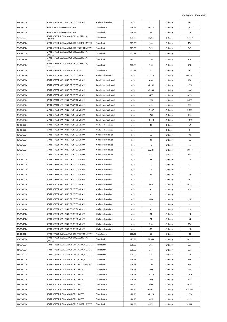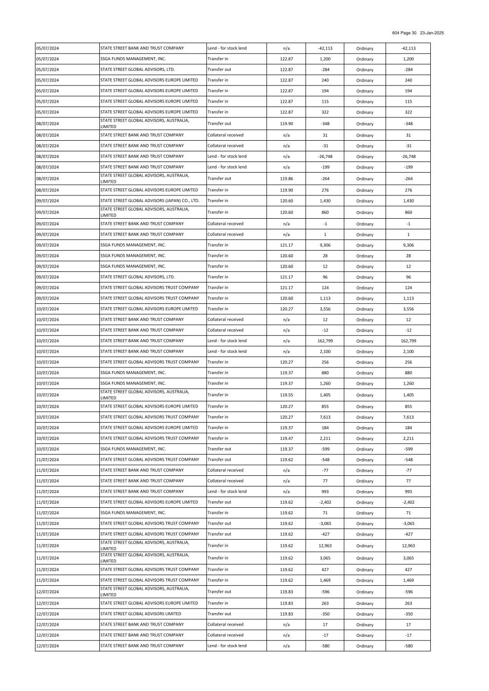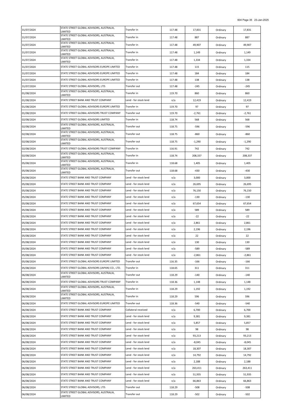 604 Page 34 23-Jan-2025 26/07/2024 n/a 52,827 Ordinary 52,827 26/07/2024 n/a 14,095 Ordinary 14,095 26/07/2024 n/a 952 Ordinary 952 26/07/2024 n/a 28,868 Ordinary 28,868 26/07/2024 n/a 1,563 Ordinary 1,563 26/07/2024 115.91 1,100 Ordinary 1,100 26/07/2024 115.91 184 Ordinary 184 29/07/2024 n/a -946 Ordinary -946 29/07/2024 n/a 598 Ordinary 598 29/07/2024 n/a 417 Ordinary 417 29/07/2024 n/a 1,929 Ordinary 1,929 29/07/2024 n/a -196 Ordinary -196 29/07/2024 n/a -417 Ordinary -417 29/07/2024 n/a 41,060 Ordinary 41,060 29/07/2024 n/a -598 Ordinary -598 29/07/2024 n/a 224 Ordinary 224 29/07/2024 116.56 -646 Ordinary -646 29/07/2024 115.87 -171 Ordinary -171 29/07/2024 115.87 2,640 Ordinary 2,640 29/07/2024 117.00 763 Ordinary 763 29/07/2024 115.87 24 Ordinary 24 29/07/2024 n/a 1,539 Ordinary 1,539 29/07/2024 115.87 97 Ordinary 97 29/07/2024 115.87 115 Ordinary 115 30/07/2024 114.72 46,290 Ordinary 46,290 30/07/2024 114.66 596 Ordinary 596 30/07/2024 114.66 -596 Ordinary -596 30/07/2024 114.66 -1,992 Ordinary -1,992 30/07/2024 n/a -470 Ordinary -470 30/07/2024 n/a -1,169 Ordinary -1,169 30/07/2024 n/a -137,447 Ordinary -137,447 30/07/2024 n/a -975 Ordinary -975 30/07/2024 n/a -361 Ordinary -361 30/07/2024 n/a 975 Ordinary 975 30/07/2024 114.01 155 Ordinary 155 30/07/2024 114.66 46 Ordinary 46 30/07/2024 114.66 1,992 Ordinary 1,992 31/07/2024 117.34 14,000 Ordinary 14,000 31/07/2024 117.48 1,290 Ordinary 1,290 31/07/2024 117.48 -1,149 Ordinary -1,149 31/07/2024 117.48 -1,334 Ordinary -1,334 31/07/2024 117.48 -887 Ordinary -887 31/07/2024 n/a 4,036 Ordinary 4,036 31/07/2024 n/a 470 Ordinary 470 31/07/2024 n/a 3,299 Ordinary 3,299 31/07/2024 n/a 65,486 Ordinary 65,486 31/07/2024 n/a 1,120 Ordinary 1,120 31/07/2024 n/a 13,978 Ordinary 13,978 31/07/2024 n/a 182 Ordinary 182 31/07/2024 n/a 284 Ordinary 284 31/07/2024 n/a 8,067 Ordinary 8,067 31/07/2024 n/a 31,951 Ordinary 31,951 31/07/2024 n/a 11,534 Ordinary 11,534 31/07/2024 n/a 3,822 Ordinary 3,822 31/07/2024 n/a -284 Ordinary -284 31/07/2024 n/a 7,022 Ordinary 7,022 31/07/2024 n/a 14,519 Ordinary 14,519 STATE STREET GLOBAL ADVISORS (JAPAN) CO., LTD. STATE STREET BANK AND TRUST COMPANY STATE STREET BANK AND TRUST COMPANY Transfer in STATE STREET BANK AND TRUST COMPANY Lend - for stock lend Lend - for stock lend Lend - for stock lend STATE STREET BANK AND TRUST COMPANY Transfer in STATE STREET GLOBAL ADVISORS, AUSTRALIA, LIMITED Lend - for stock lend Lend - for stock lend STATE STREET BANK AND TRUST COMPANY Lend - for stock lend STATE STREET GLOBAL ADVISORS TRUST COMPANY Lend - for stock lend Transfer in STATE STREET BANK AND TRUST COMPANY Transfer in STATE STREET GLOBAL ADVISORS EUROPE LIMITED Lend - for stock lend STATE STREET BANK AND TRUST COMPANY Transfer out STATE STREET BANK AND TRUST COMPANY Transfer out STATE STREET GLOBAL ADVISORS, AUSTRALIA, LIMITED Lend - for stock lend STATE STREET BANK AND TRUST COMPANY Lend - for stock lend STATE STREET BANK AND TRUST COMPANY STATE STREET BANK AND TRUST COMPANY STATE STREET BANK AND TRUST COMPANY STATE STREET GLOBAL ADVISORS TRUST COMPANY Transfer in Lend - for stock lend Transfer in SSGA FUNDS MANAGEMENT, INC. STATE STREET BANK AND TRUST COMPANY Lend - for stock lend STATE STREET GLOBAL ADVISORS EUROPE LIMITED Lend - for stock lend STATE STREET BANK AND TRUST COMPANY Lend - for stock lend Lend - for stock lend STATE STREET GLOBAL ADVISORS EUROPE LIMITED STATE STREET GLOBAL ADVISORS EUROPE LIMITED STATE STREET BANK AND TRUST COMPANY Transfer out Lend - for stock lend Transfer out Lend - for stock lend STATE STREET BANK AND TRUST COMPANY STATE STREET BANK AND TRUST COMPANY Lend - for stock lend Transfer in STATE STREET GLOBAL ADVISORS EUROPE LIMITED STATE STREET GLOBAL ADVISORS, LTD. SSGA FUNDS MANAGEMENT, INC. Transfer in Transfer in STATE STREET BANK AND TRUST COMPANY Lend - for stock lend STATE STREET BANK AND TRUST COMPANY Transfer in STATE STREET BANK AND TRUST COMPANY STATE STREET BANK AND TRUST COMPANY STATE STREET BANK AND TRUST COMPANY Lend - for stock lend Lend - for stock lend STATE STREET BANK AND TRUST COMPANY Transfer in STATE STREET GLOBAL ADVISORS TRUST COMPANY Transfer in Lend - for stock lend STATE STREET BANK AND TRUST COMPANY STATE STREET BANK AND TRUST COMPANY STATE STREET BANK AND TRUST COMPANY Lend - for stock lend STATE STREET BANK AND TRUST COMPANY Lend - for stock lend Lend - for stock lend STATE STREET GLOBAL ADVISORS EUROPE LIMITED STATE STREET GLOBAL ADVISORS TRUST COMPANY Lend - for stock lend Lend - for stock lend STATE STREET GLOBAL ADVISORS (JAPAN) CO., LTD. Lend - for stock lend Lend - for stock lend Lend - for stock lend Lend - for stock lend STATE STREET GLOBAL ADVISORS TRUST COMPANY STATE STREET BANK AND TRUST COMPANY STATE STREET GLOBAL ADVISORS, AUSTRALIA, LIMITED Lend - for stock lend Lend - for stock lend Transfer in SSGA FUNDS MANAGEMENT, INC. STATE STREET BANK AND TRUST COMPANY STATE STREET BANK AND TRUST COMPANY Transfer out Transfer in SSGA FUNDS MANAGEMENT, INC. Transfer out STATE STREET BANK AND TRUST COMPANY STATE STREET BANK AND TRUST COMPANY Collateral received Transfer out STATE STREET BANK AND TRUST COMPANY STATE STREET BANK AND TRUST COMPANY STATE STREET BANK AND TRUST COMPANY Lend - for stock lend STATE STREET BANK AND TRUST COMPANY Lend - for stock lend