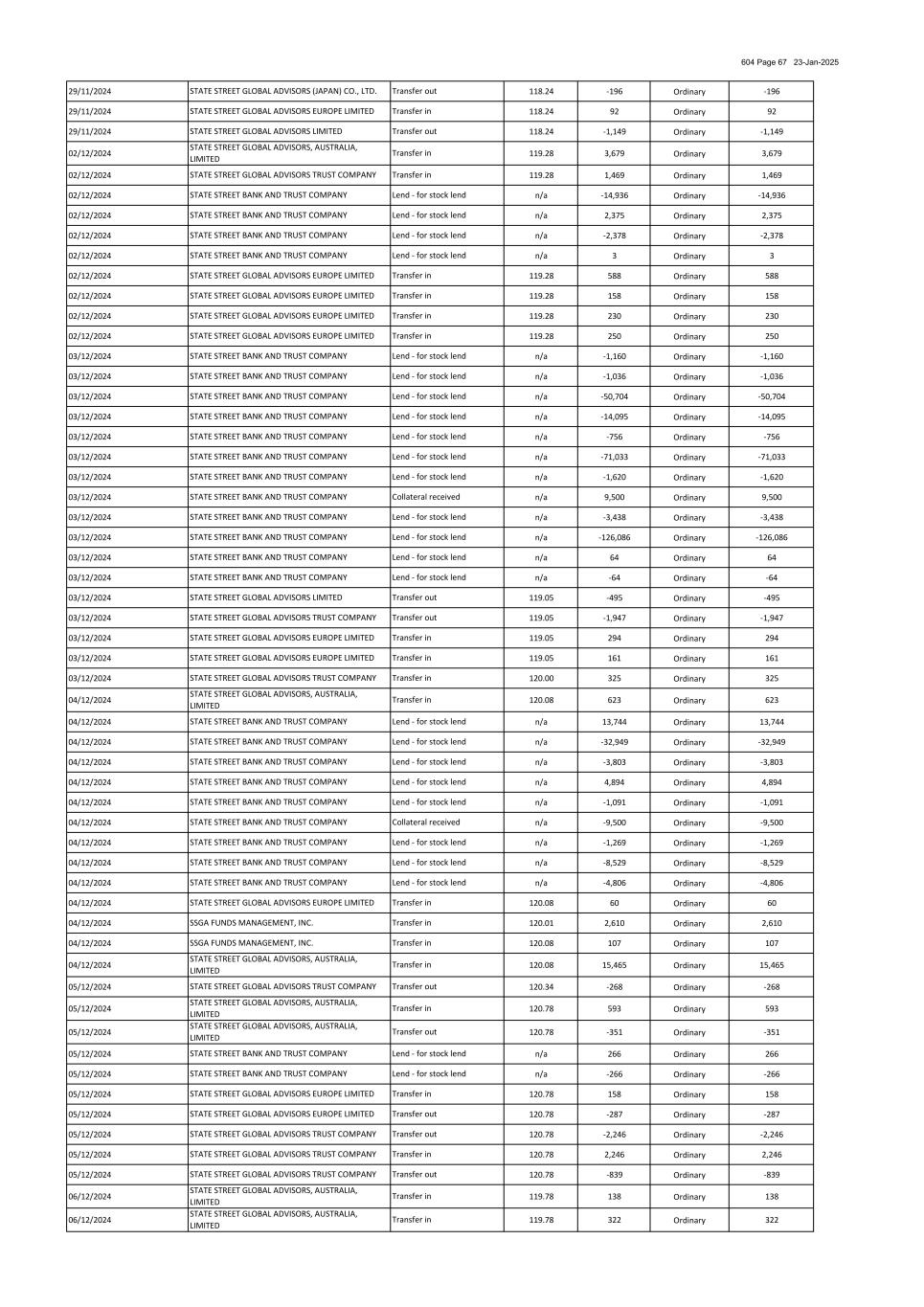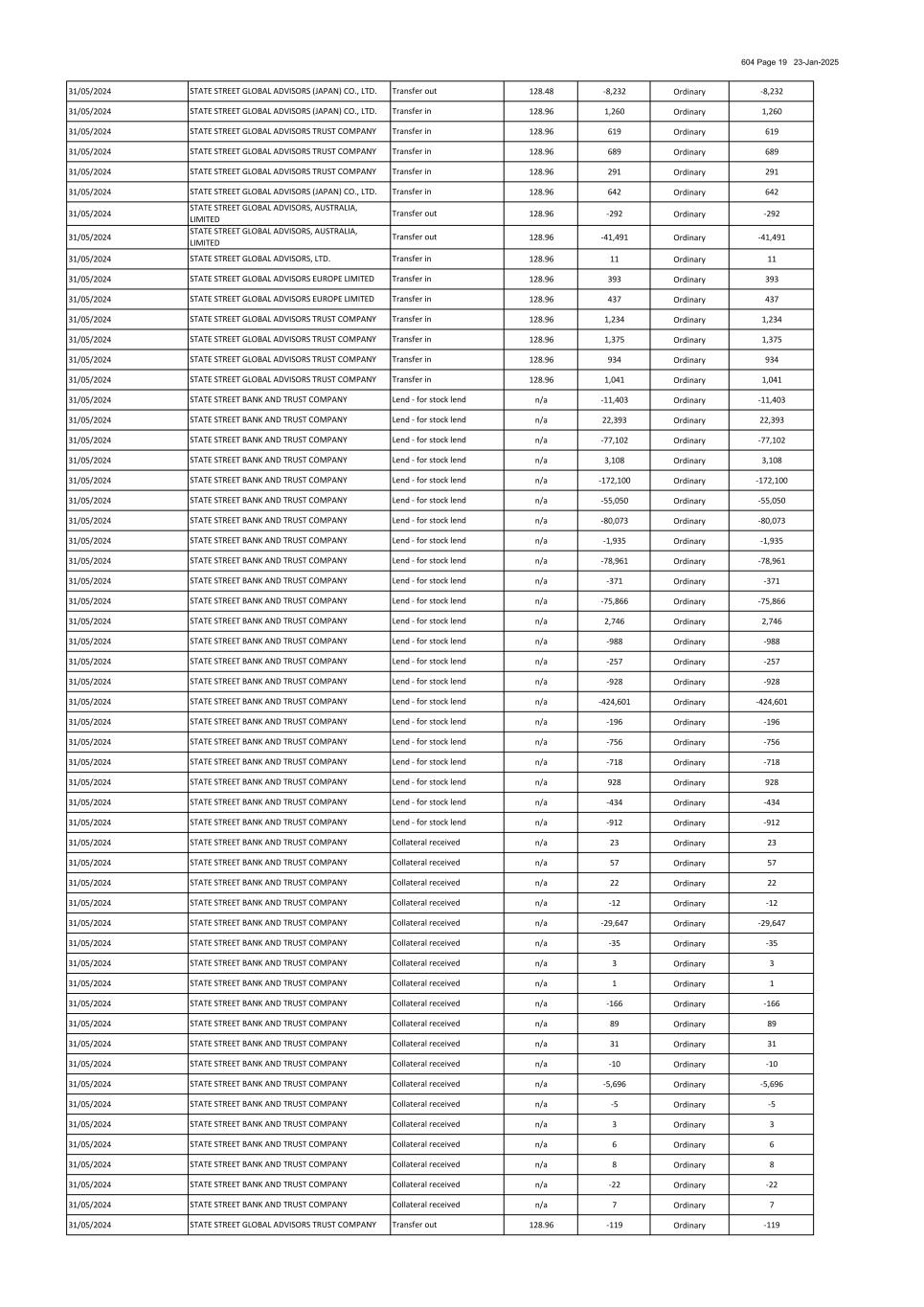 604 Page 18 23-Jan-2025 29/05/2024 n/a -12 Ordinary -12 29/05/2024 129.66 -1,617 Ordinary -1,617 29/05/2024 129.66 75 Ordinary 75 29/05/2024 129.75 26,258 Ordinary 26,258 29/05/2024 129.66 184 Ordinary 184 29/05/2024 129.66 549 Ordinary 549 30/05/2024 127.66 411 Ordinary 411 30/05/2024 127.66 730 Ordinary 730 30/05/2024 127.66 730 Ordinary 730 30/05/2024 127.66 -32 Ordinary -32 30/05/2024 n/a -11,000 Ordinary -11,000 30/05/2024 n/a 470 Ordinary 470 30/05/2024 n/a -1,350 Ordinary -1,350 30/05/2024 n/a -9,463 Ordinary -9,463 30/05/2024 n/a -470 Ordinary -470 30/05/2024 n/a 1,982 Ordinary 1,982 30/05/2024 n/a 255 Ordinary 255 30/05/2024 n/a -2,037 Ordinary -2,037 30/05/2024 n/a -255 Ordinary -255 30/05/2024 n/a -1,613 Ordinary -1,613 30/05/2024 n/a 19 Ordinary 19 30/05/2024 n/a 1 Ordinary 1 30/05/2024 n/a 90 Ordinary 90 30/05/2024 n/a -80 Ordinary -80 30/05/2024 n/a -1 Ordinary -1 30/05/2024 n/a 29,647 Ordinary 29,647 30/05/2024 n/a 151 Ordinary 151 30/05/2024 n/a 13 Ordinary 13 30/05/2024 n/a 2 Ordinary 2 30/05/2024 n/a -8 Ordinary -8 30/05/2024 n/a 84 Ordinary 84 30/05/2024 n/a 251 Ordinary 251 30/05/2024 n/a -822 Ordinary -822 30/05/2024 n/a -61 Ordinary -61 30/05/2024 n/a -1 Ordinary -1 30/05/2024 n/a 5,696 Ordinary 5,696 30/05/2024 n/a 4 Ordinary 4 30/05/2024 n/a 16 Ordinary 16 30/05/2024 n/a 24 Ordinary 24 30/05/2024 n/a 34 Ordinary 34 30/05/2024 n/a 254 Ordinary 254 30/05/2024 n/a 29 Ordinary 29 30/05/2024 127.66 -20 Ordinary -20 30/05/2024 127.85 39,387 Ordinary 39,387 31/05/2024 128.96 291 Ordinary 291 31/05/2024 128.96 277 Ordinary 277 31/05/2024 128.96 215 Ordinary 215 31/05/2024 128.96 199 Ordinary 199 31/05/2024 128.96 140 Ordinary 140 31/05/2024 128.96 -393 Ordinary -393 31/05/2024 128.96 -2,516 Ordinary -2,516 31/05/2024 128.96 -458 Ordinary -458 31/05/2024 128.96 -634 Ordinary -634 31/05/2024 128.96 -68,263 Ordinary -68,263 31/05/2024 128.96 -2,574 Ordinary -2,574 31/05/2024 128.96 -129 Ordinary -129 31/05/2024 128.35 4,972 Ordinary 4,972 Transfer in STATE STREET BANK AND TRUST COMPANY Transfer out STATE STREET GLOBAL ADVISORS (JAPAN) CO., LTD. Lend - for stock lend Lend - for stock lend STATE STREET GLOBAL ADVISORS, AUSTRALIA, LIMITED Collateral received STATE STREET BANK AND TRUST COMPANY STATE STREET GLOBAL ADVISORS LIMITED SSGA FUNDS MANAGEMENT, INC. STATE STREET BANK AND TRUST COMPANY STATE STREET BANK AND TRUST COMPANY Collateral received Collateral received STATE STREET GLOBAL ADVISORS, AUSTRALIA, LIMITED STATE STREET BANK AND TRUST COMPANY Collateral received STATE STREET BANK AND TRUST COMPANY Transfer in Transfer in Transfer in STATE STREET BANK AND TRUST COMPANY Transfer out STATE STREET BANK AND TRUST COMPANY Transfer out Lend - for stock lend Collateral received STATE STREET GLOBAL ADVISORS (JAPAN) CO., LTD. Transfer out STATE STREET BANK AND TRUST COMPANY SSGA FUNDS MANAGEMENT, INC. Collateral received STATE STREET GLOBAL ADVISORS LIMITED STATE STREET BANK AND TRUST COMPANY STATE STREET GLOBAL ADVISORS, AUSTRALIA, LIMITED Collateral received Collateral received Collateral received STATE STREET BANK AND TRUST COMPANY Transfer in STATE STREET BANK AND TRUST COMPANY STATE STREET BANK AND TRUST COMPANY Transfer in Transfer in STATE STREET BANK AND TRUST COMPANY Transfer out STATE STREET GLOBAL ADVISORS (JAPAN) CO., LTD. Lend - for stock lend Collateral received Collateral received STATE STREET GLOBAL ADVISORS TRUST COMPANY STATE STREET GLOBAL ADVISORS LIMITED STATE STREET GLOBAL ADVISORS, AUSTRALIA, LIMITED Collateral received STATE STREET BANK AND TRUST COMPANY STATE STREET GLOBAL ADVISORS TRUST COMPANY Collateral received STATE STREET GLOBAL ADVISORS, LTD. STATE STREET BANK AND TRUST COMPANY STATE STREET BANK AND TRUST COMPANY Transfer out Transfer in STATE STREET BANK AND TRUST COMPANY Collateral received STATE STREET BANK AND TRUST COMPANY Transfer out Transfer in Lend - for stock lend Transfer out STATE STREET BANK AND TRUST COMPANY Lend - for stock lend STATE STREET GLOBAL ADVISORS, AUSTRALIA, LIMITED STATE STREET GLOBAL ADVISORS EUROPE LIMITED Collateral received STATE STREET BANK AND TRUST COMPANY Collateral received STATE STREET GLOBAL ADVISORS LIMITED STATE STREET GLOBAL ADVISORS LIMITED STATE STREET BANK AND TRUST COMPANY Collateral received Collateral received STATE STREET BANK AND TRUST COMPANY Collateral received Collateral received Transfer in STATE STREET BANK AND TRUST COMPANY STATE STREET BANK AND TRUST COMPANY Transfer in Lend - for stock lend Transfer in STATE STREET BANK AND TRUST COMPANY STATE STREET BANK AND TRUST COMPANY Transfer out Transfer out Lend - for stock lend STATE STREET GLOBAL ADVISORS (JAPAN) CO., LTD. Collateral received STATE STREET GLOBAL ADVISORS TRUST COMPANY STATE STREET BANK AND TRUST COMPANY Lend - for stock lend Collateral received STATE STREET GLOBAL ADVISORS LIMITED STATE STREET GLOBAL ADVISORS LIMITED STATE STREET BANK AND TRUST COMPANY Collateral received STATE STREET BANK AND TRUST COMPANY Collateral received STATE STREET GLOBAL ADVISORS EUROPE LIMITED STATE STREET BANK AND TRUST COMPANY STATE STREET BANK AND TRUST COMPANY STATE STREET BANK AND TRUST COMPANY Transfer in Transfer in