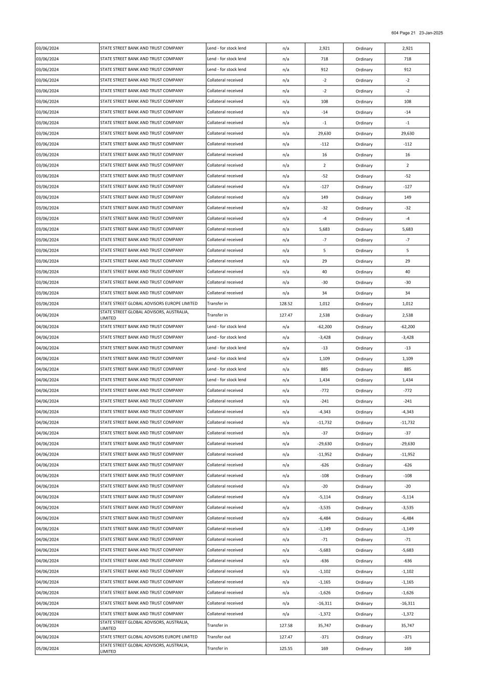 604 Page 21 23-Jan-2025 03/06/2024 n/a 2,921 Ordinary 2,921 03/06/2024 n/a 718 Ordinary 718 03/06/2024 n/a 912 Ordinary 912 03/06/2024 n/a -2 Ordinary -2 03/06/2024 n/a -2 Ordinary -2 03/06/2024 n/a 108 Ordinary 108 03/06/2024 n/a -14 Ordinary -14 03/06/2024 n/a -1 Ordinary -1 03/06/2024 n/a 29,630 Ordinary 29,630 03/06/2024 n/a -112 Ordinary -112 03/06/2024 n/a 16 Ordinary 16 03/06/2024 n/a 2 Ordinary 2 03/06/2024 n/a -52 Ordinary -52 03/06/2024 n/a -127 Ordinary -127 03/06/2024 n/a 149 Ordinary 149 03/06/2024 n/a -32 Ordinary -32 03/06/2024 n/a -4 Ordinary -4 03/06/2024 n/a 5,683 Ordinary 5,683 03/06/2024 n/a -7 Ordinary -7 03/06/2024 n/a 5 Ordinary 5 03/06/2024 n/a 29 Ordinary 29 03/06/2024 n/a 40 Ordinary 40 03/06/2024 n/a -30 Ordinary -30 03/06/2024 n/a 34 Ordinary 34 03/06/2024 128.52 1,012 Ordinary 1,012 04/06/2024 127.47 2,538 Ordinary 2,538 04/06/2024 n/a -62,200 Ordinary -62,200 04/06/2024 n/a -3,428 Ordinary -3,428 04/06/2024 n/a -13 Ordinary -13 04/06/2024 n/a 1,109 Ordinary 1,109 04/06/2024 n/a 885 Ordinary 885 04/06/2024 n/a 1,434 Ordinary 1,434 04/06/2024 n/a -772 Ordinary -772 04/06/2024 n/a -241 Ordinary -241 04/06/2024 n/a -4,343 Ordinary -4,343 04/06/2024 n/a -11,732 Ordinary -11,732 04/06/2024 n/a -37 Ordinary -37 04/06/2024 n/a -29,630 Ordinary -29,630 04/06/2024 n/a -11,952 Ordinary -11,952 04/06/2024 n/a -626 Ordinary -626 04/06/2024 n/a -108 Ordinary -108 04/06/2024 n/a -20 Ordinary -20 04/06/2024 n/a -5,114 Ordinary -5,114 04/06/2024 n/a -3,535 Ordinary -3,535 04/06/2024 n/a -6,484 Ordinary -6,484 04/06/2024 n/a -1,149 Ordinary -1,149 04/06/2024 n/a -71 Ordinary -71 04/06/2024 n/a -5,683 Ordinary -5,683 04/06/2024 n/a -636 Ordinary -636 04/06/2024 n/a -1,102 Ordinary -1,102 04/06/2024 n/a -1,165 Ordinary -1,165 04/06/2024 n/a -1,626 Ordinary -1,626 04/06/2024 n/a -16,311 Ordinary -16,311 04/06/2024 n/a -1,372 Ordinary -1,372 04/06/2024 127.58 35,747 Ordinary 35,747 04/06/2024 127.47 -371 Ordinary -371 05/06/2024 125.55 169 Ordinary 169 Collateral received STATE STREET BANK AND TRUST COMPANY Collateral received Transfer out STATE STREET BANK AND TRUST COMPANY Lend - for stock lend STATE STREET BANK AND TRUST COMPANY STATE STREET BANK AND TRUST COMPANY Collateral received STATE STREET GLOBAL ADVISORS, AUSTRALIA, LIMITED STATE STREET BANK AND TRUST COMPANY Collateral received Collateral received STATE STREET BANK AND TRUST COMPANY Collateral received Lend - for stock lend STATE STREET BANK AND TRUST COMPANY STATE STREET BANK AND TRUST COMPANY Collateral received STATE STREET BANK AND TRUST COMPANY STATE STREET BANK AND TRUST COMPANY STATE STREET BANK AND TRUST COMPANY Collateral received Collateral received STATE STREET BANK AND TRUST COMPANY STATE STREET BANK AND TRUST COMPANY Transfer in Lend - for stock lend STATE STREET BANK AND TRUST COMPANY STATE STREET BANK AND TRUST COMPANY STATE STREET BANK AND TRUST COMPANY Collateral received STATE STREET GLOBAL ADVISORS EUROPE LIMITED Collateral received Collateral received STATE STREET BANK AND TRUST COMPANY STATE STREET BANK AND TRUST COMPANY Collateral received Lend - for stock lend Lend - for stock lend STATE STREET BANK AND TRUST COMPANY Collateral received Collateral received STATE STREET BANK AND TRUST COMPANY Collateral received Collateral received STATE STREET BANK AND TRUST COMPANY STATE STREET BANK AND TRUST COMPANY Collateral received STATE STREET BANK AND TRUST COMPANY Collateral received STATE STREET BANK AND TRUST COMPANY STATE STREET BANK AND TRUST COMPANY Transfer in Collateral received STATE STREET GLOBAL ADVISORS, AUSTRALIA, LIMITED Lend - for stock lend STATE STREET BANK AND TRUST COMPANY Collateral received STATE STREET BANK AND TRUST COMPANY Collateral received STATE STREET BANK AND TRUST COMPANY STATE STREET BANK AND TRUST COMPANY Collateral received Collateral received Collateral received STATE STREET BANK AND TRUST COMPANY STATE STREET BANK AND TRUST COMPANY STATE STREET BANK AND TRUST COMPANY STATE STREET BANK AND TRUST COMPANY Collateral received STATE STREET BANK AND TRUST COMPANY STATE STREET BANK AND TRUST COMPANY Transfer in STATE STREET BANK AND TRUST COMPANY Collateral received Collateral received STATE STREET BANK AND TRUST COMPANY Lend - for stock lend STATE STREET BANK AND TRUST COMPANY Collateral received STATE STREET GLOBAL ADVISORS EUROPE LIMITED STATE STREET BANK AND TRUST COMPANY Collateral received Collateral received STATE STREET BANK AND TRUST COMPANY Collateral received STATE STREET BANK AND TRUST COMPANY STATE STREET BANK AND TRUST COMPANY Collateral received STATE STREET BANK AND TRUST COMPANY STATE STREET BANK AND TRUST COMPANY Transfer in Collateral received STATE STREET BANK AND TRUST COMPANY STATE STREET BANK AND TRUST COMPANY STATE STREET BANK AND TRUST COMPANY Lend - for stock lend Collateral received Collateral received Collateral received STATE STREET BANK AND TRUST COMPANY Collateral received STATE STREET BANK AND TRUST COMPANY Collateral received Collateral received Collateral received STATE STREET GLOBAL ADVISORS, AUSTRALIA, LIMITED STATE STREET BANK AND TRUST COMPANY Lend - for stock lend Collateral received STATE STREET BANK AND TRUST COMPANY Collateral received STATE STREET BANK AND TRUST COMPANY