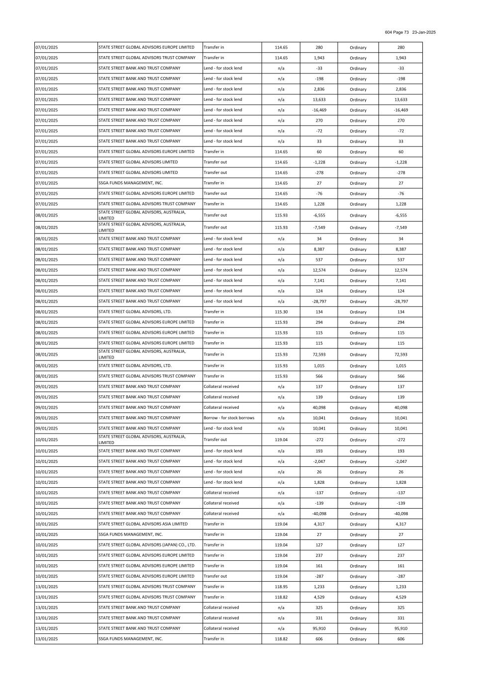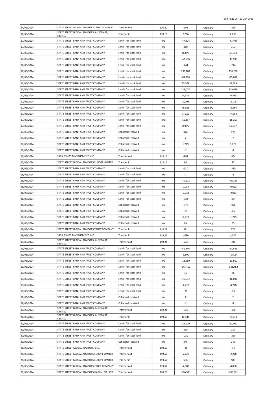 604 Page 73 23-Jan-2025 07/01/2025 114.65 280 Ordinary 280 07/01/2025 114.65 1,943 Ordinary 1,943 07/01/2025 n/a -33 Ordinary -33 07/01/2025 n/a -198 Ordinary -198 07/01/2025 n/a 2,836 Ordinary 2,836 07/01/2025 n/a 13,633 Ordinary 13,633 07/01/2025 n/a -16,469 Ordinary -16,469 07/01/2025 n/a 270 Ordinary 270 07/01/2025 n/a -72 Ordinary -72 07/01/2025 n/a 33 Ordinary 33 07/01/2025 114.65 60 Ordinary 60 07/01/2025 114.65 -1,228 Ordinary -1,228 07/01/2025 114.65 -278 Ordinary -278 07/01/2025 114.65 27 Ordinary 27 07/01/2025 114.65 -76 Ordinary -76 07/01/2025 114.65 1,228 Ordinary 1,228 08/01/2025 115.93 -6,555 Ordinary -6,555 08/01/2025 115.93 -7,549 Ordinary -7,549 08/01/2025 n/a 34 Ordinary 34 08/01/2025 n/a 8,387 Ordinary 8,387 08/01/2025 n/a 537 Ordinary 537 08/01/2025 n/a 12,574 Ordinary 12,574 08/01/2025 n/a 7,141 Ordinary 7,141 08/01/2025 n/a 124 Ordinary 124 08/01/2025 n/a -28,797 Ordinary -28,797 08/01/2025 115.30 134 Ordinary 134 08/01/2025 115.93 294 Ordinary 294 08/01/2025 115.93 115 Ordinary 115 08/01/2025 115.93 115 Ordinary 115 08/01/2025 115.93 72,593 Ordinary 72,593 08/01/2025 115.93 1,015 Ordinary 1,015 08/01/2025 115.93 566 Ordinary 566 09/01/2025 n/a 137 Ordinary 137 09/01/2025 n/a 139 Ordinary 139 09/01/2025 n/a 40,098 Ordinary 40,098 09/01/2025 n/a 10,041 Ordinary 10,041 09/01/2025 n/a 10,041 Ordinary 10,041 10/01/2025 119.04 -272 Ordinary -272 10/01/2025 n/a 193 Ordinary 193 10/01/2025 n/a -2,047 Ordinary -2,047 10/01/2025 n/a 26 Ordinary 26 10/01/2025 n/a 1,828 Ordinary 1,828 10/01/2025 n/a -137 Ordinary -137 10/01/2025 n/a -139 Ordinary -139 10/01/2025 n/a -40,098 Ordinary -40,098 10/01/2025 119.04 4,317 Ordinary 4,317 10/01/2025 119.04 27 Ordinary 27 10/01/2025 119.04 127 Ordinary 127 10/01/2025 119.04 237 Ordinary 237 10/01/2025 119.04 161 Ordinary 161 10/01/2025 119.04 -287 Ordinary -287 13/01/2025 118.95 1,233 Ordinary 1,233 13/01/2025 118.82 4,529 Ordinary 4,529 13/01/2025 n/a 325 Ordinary 325 13/01/2025 n/a 331 Ordinary 331 13/01/2025 n/a 95,910 Ordinary 95,910 13/01/2025 118.82 606 Ordinary 606 Transfer in STATE STREET GLOBAL ADVISORS TRUST COMPANY Lend - for stock lend STATE STREET BANK AND TRUST COMPANY STATE STREET GLOBAL ADVISORS LIMITED STATE STREET GLOBAL ADVISORS TRUST COMPANY Lend - for stock lend STATE STREET GLOBAL ADVISORS, AUSTRALIA, LIMITED STATE STREET BANK AND TRUST COMPANY Transfer in STATE STREET BANK AND TRUST COMPANY Lend - for stock lend Transfer in STATE STREET GLOBAL ADVISORS EUROPE LIMITED Transfer in Lend - for stock lend Lend - for stock lend STATE STREET BANK AND TRUST COMPANY Transfer in Borrow - for stock borrows STATE STREET GLOBAL ADVISORS, AUSTRALIA, LIMITED SSGA FUNDS MANAGEMENT, INC. STATE STREET GLOBAL ADVISORS ASIA LIMITED Lend - for stock lend STATE STREET BANK AND TRUST COMPANY Lend - for stock lend Transfer in STATE STREET BANK AND TRUST COMPANY Transfer out STATE STREET BANK AND TRUST COMPANY STATE STREET GLOBAL ADVISORS (JAPAN) CO., LTD. Transfer in STATE STREET GLOBAL ADVISORS, LTD. Transfer in STATE STREET BANK AND TRUST COMPANY Collateral received STATE STREET BANK AND TRUST COMPANY Lend - for stock lend Transfer in Collateral received STATE STREET GLOBAL ADVISORS, LTD. Collateral received STATE STREET BANK AND TRUST COMPANY STATE STREET GLOBAL ADVISORS EUROPE LIMITED SSGA FUNDS MANAGEMENT, INC. Transfer out STATE STREET BANK AND TRUST COMPANY STATE STREET GLOBAL ADVISORS TRUST COMPANY Collateral received Lend - for stock lend STATE STREET BANK AND TRUST COMPANY Lend - for stock lend SSGA FUNDS MANAGEMENT, INC. Transfer in Lend - for stock lend STATE STREET BANK AND TRUST COMPANY Lend - for stock lend STATE STREET GLOBAL ADVISORS EUROPE LIMITED Collateral received STATE STREET GLOBAL ADVISORS, AUSTRALIA, LIMITED Collateral received STATE STREET GLOBAL ADVISORS TRUST COMPANY Collateral received STATE STREET BANK AND TRUST COMPANY STATE STREET BANK AND TRUST COMPANY Lend - for stock lend STATE STREET BANK AND TRUST COMPANY STATE STREET BANK AND TRUST COMPANY Transfer in Transfer out Transfer out Lend - for stock lend STATE STREET BANK AND TRUST COMPANY Transfer in STATE STREET GLOBAL ADVISORS TRUST COMPANY STATE STREET BANK AND TRUST COMPANY STATE STREET BANK AND TRUST COMPANY Collateral received Lend - for stock lend Transfer in STATE STREET BANK AND TRUST COMPANY STATE STREET GLOBAL ADVISORS EUROPE LIMITED Transfer out STATE STREET BANK AND TRUST COMPANY Transfer in STATE STREET BANK AND TRUST COMPANY Transfer out Lend - for stock lend STATE STREET BANK AND TRUST COMPANY Transfer in STATE STREET BANK AND TRUST COMPANY Transfer in STATE STREET BANK AND TRUST COMPANY Transfer in STATE STREET GLOBAL ADVISORS LIMITED Lend - for stock lend STATE STREET BANK AND TRUST COMPANY STATE STREET GLOBAL ADVISORS EUROPE LIMITED STATE STREET GLOBAL ADVISORS EUROPE LIMITED Lend - for stock lend Transfer in STATE STREET GLOBAL ADVISORS EUROPE LIMITED Lend - for stock lend STATE STREET BANK AND TRUST COMPANY Transfer out STATE STREET GLOBAL ADVISORS EUROPE LIMITED Transfer in STATE STREET GLOBAL ADVISORS EUROPE LIMITED Transfer in STATE STREET BANK AND TRUST COMPANY Collateral received Lend - for stock lend STATE STREET BANK AND TRUST COMPANY STATE STREET GLOBAL ADVISORS, AUSTRALIA, LIMITED