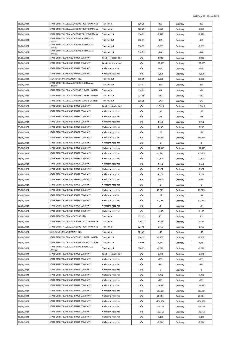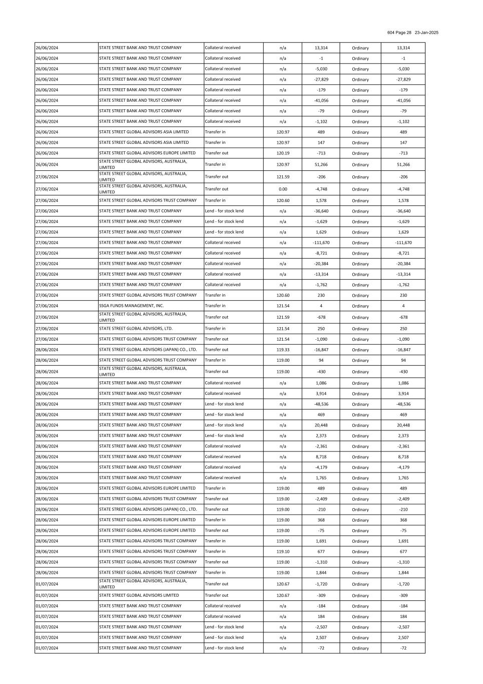 604 Page 28 23-Jan-2025 26/06/2024 n/a 13,314 Ordinary 13,314 26/06/2024 n/a -1 Ordinary -1 26/06/2024 n/a -5,030 Ordinary -5,030 26/06/2024 n/a -27,829 Ordinary -27,829 26/06/2024 n/a -179 Ordinary -179 26/06/2024 n/a -41,056 Ordinary -41,056 26/06/2024 n/a -79 Ordinary -79 26/06/2024 n/a -1,102 Ordinary -1,102 26/06/2024 120.97 489 Ordinary 489 26/06/2024 120.97 147 Ordinary 147 26/06/2024 120.19 -713 Ordinary -713 26/06/2024 120.97 51,266 Ordinary 51,266 27/06/2024 121.59 -206 Ordinary -206 27/06/2024 0.00 -4,748 Ordinary -4,748 27/06/2024 120.60 1,578 Ordinary 1,578 27/06/2024 n/a -36,640 Ordinary -36,640 27/06/2024 n/a -1,629 Ordinary -1,629 27/06/2024 n/a 1,629 Ordinary 1,629 27/06/2024 n/a -111,670 Ordinary -111,670 27/06/2024 n/a -8,721 Ordinary -8,721 27/06/2024 n/a -20,384 Ordinary -20,384 27/06/2024 n/a -13,314 Ordinary -13,314 27/06/2024 n/a -1,762 Ordinary -1,762 27/06/2024 120.60 230 Ordinary 230 27/06/2024 121.54 4 Ordinary 4 27/06/2024 121.59 -678 Ordinary -678 27/06/2024 121.54 250 Ordinary 250 27/06/2024 121.54 -1,090 Ordinary -1,090 28/06/2024 119.33 -16,847 Ordinary -16,847 28/06/2024 119.00 94 Ordinary 94 28/06/2024 119.00 -430 Ordinary -430 28/06/2024 n/a 1,086 Ordinary 1,086 28/06/2024 n/a 3,914 Ordinary 3,914 28/06/2024 n/a -48,536 Ordinary -48,536 28/06/2024 n/a 469 Ordinary 469 28/06/2024 n/a 20,448 Ordinary 20,448 28/06/2024 n/a 2,373 Ordinary 2,373 28/06/2024 n/a -2,361 Ordinary -2,361 28/06/2024 n/a 8,718 Ordinary 8,718 28/06/2024 n/a -4,179 Ordinary -4,179 28/06/2024 n/a 1,765 Ordinary 1,765 28/06/2024 119.00 489 Ordinary 489 28/06/2024 119.00 -2,409 Ordinary -2,409 28/06/2024 119.00 -210 Ordinary -210 28/06/2024 119.00 368 Ordinary 368 28/06/2024 119.00 -75 Ordinary -75 28/06/2024 119.00 1,691 Ordinary 1,691 28/06/2024 119.10 677 Ordinary 677 28/06/2024 119.00 -1,310 Ordinary -1,310 28/06/2024 119.00 1,844 Ordinary 1,844 01/07/2024 120.67 -1,720 Ordinary -1,720 01/07/2024 120.67 -309 Ordinary -309 01/07/2024 n/a -184 Ordinary -184 01/07/2024 n/a 184 Ordinary 184 01/07/2024 n/a -2,507 Ordinary -2,507 01/07/2024 n/a 2,507 Ordinary 2,507 01/07/2024 n/a -72 Ordinary -72 Transfer in STATE STREET GLOBAL ADVISORS TRUST COMPANY Collateral received STATE STREET BANK AND TRUST COMPANY Lend - for stock lend STATE STREET GLOBAL ADVISORS ASIA LIMITED Transfer out Transfer out STATE STREET GLOBAL ADVISORS TRUST COMPANY STATE STREET GLOBAL ADVISORS LIMITED STATE STREET BANK AND TRUST COMPANY Collateral received STATE STREET BANK AND TRUST COMPANY Transfer out STATE STREET BANK AND TRUST COMPANY Collateral received STATE STREET BANK AND TRUST COMPANY STATE STREET BANK AND TRUST COMPANY STATE STREET GLOBAL ADVISORS EUROPE LIMITED Collateral received Transfer in Lend - for stock lend Collateral received STATE STREET GLOBAL ADVISORS TRUST COMPANY STATE STREET BANK AND TRUST COMPANY SSGA FUNDS MANAGEMENT, INC. Transfer out Collateral received STATE STREET BANK AND TRUST COMPANY STATE STREET BANK AND TRUST COMPANY Collateral received Lend - for stock lend Lend - for stock lend Transfer out STATE STREET GLOBAL ADVISORS, AUSTRALIA, LIMITED Transfer out Collateral received Collateral received STATE STREET GLOBAL ADVISORS, AUSTRALIA, LIMITED STATE STREET BANK AND TRUST COMPANY Transfer in Collateral received STATE STREET GLOBAL ADVISORS TRUST COMPANY STATE STREET GLOBAL ADVISORS, AUSTRALIA, LIMITED Collateral received STATE STREET BANK AND TRUST COMPANY Transfer out STATE STREET GLOBAL ADVISORS TRUST COMPANY STATE STREET BANK AND TRUST COMPANY STATE STREET BANK AND TRUST COMPANY Collateral received STATE STREET BANK AND TRUST COMPANY STATE STREET BANK AND TRUST COMPANY STATE STREET GLOBAL ADVISORS EUROPE LIMITED STATE STREET GLOBAL ADVISORS TRUST COMPANY Transfer out Transfer in STATE STREET BANK AND TRUST COMPANY STATE STREET BANK AND TRUST COMPANY Collateral received STATE STREET BANK AND TRUST COMPANY STATE STREET GLOBAL ADVISORS (JAPAN) CO., LTD. Transfer out Transfer out STATE STREET BANK AND TRUST COMPANY STATE STREET BANK AND TRUST COMPANY Lend - for stock lend Collateral received Transfer in STATE STREET GLOBAL ADVISORS, LTD. STATE STREET BANK AND TRUST COMPANY Lend - for stock lend STATE STREET BANK AND TRUST COMPANY Lend - for stock lend Transfer in STATE STREET GLOBAL ADVISORS TRUST COMPANY Transfer out Lend - for stock lend STATE STREET BANK AND TRUST COMPANY Transfer out Collateral received STATE STREET BANK AND TRUST COMPANY STATE STREET GLOBAL ADVISORS TRUST COMPANY STATE STREET GLOBAL ADVISORS, AUSTRALIA, LIMITED Collateral received Collateral received STATE STREET BANK AND TRUST COMPANY STATE STREET GLOBAL ADVISORS, AUSTRALIA, LIMITED Transfer in STATE STREET GLOBAL ADVISORS, AUSTRALIA, LIMITED Collateral received Collateral received STATE STREET BANK AND TRUST COMPANY STATE STREET BANK AND TRUST COMPANY Transfer in Transfer in Transfer out STATE STREET GLOBAL ADVISORS EUROPE LIMITED STATE STREET BANK AND TRUST COMPANY Transfer in STATE STREET GLOBAL ADVISORS EUROPE LIMITED Lend - for stock lend STATE STREET BANK AND TRUST COMPANY Collateral received STATE STREET GLOBAL ADVISORS (JAPAN) CO., LTD. Transfer in Collateral received Transfer in Transfer in STATE STREET GLOBAL ADVISORS TRUST COMPANY STATE STREET BANK AND TRUST COMPANY Lend - for stock lend STATE STREET BANK AND TRUST COMPANY STATE STREET GLOBAL ADVISORS ASIA LIMITED