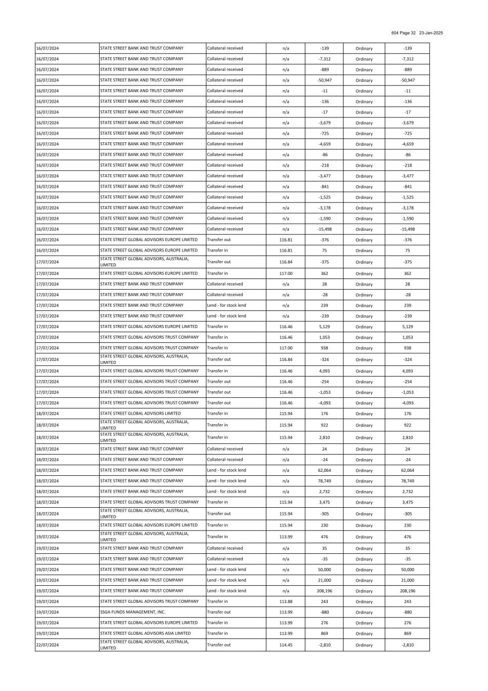 604 Page 31 23-Jan-2025 12/07/2024 n/a 276,694 Ordinary 276,694 12/07/2024 n/a -469 Ordinary -469 12/07/2024 n/a -9,492 Ordinary -9,492 12/07/2024 n/a 3,609 Ordinary 3,609 12/07/2024 n/a 1,147 Ordinary 1,147 12/07/2024 n/a 4,890 Ordinary 4,890 12/07/2024 n/a -1,287 Ordinary -1,287 12/07/2024 n/a 635 Ordinary 635 12/07/2024 n/a -9,646 Ordinary -9,646 12/07/2024 n/a 1,287 Ordinary 1,287 12/07/2024 120.07 -1,024 Ordinary -1,024 12/07/2024 119.83 291 Ordinary 291 15/07/2024 119.84 -348 Ordinary -348 15/07/2024 n/a 10 Ordinary 10 15/07/2024 n/a -10 Ordinary -10 15/07/2024 n/a -413 Ordinary -413 15/07/2024 n/a 160,013 Ordinary 160,013 15/07/2024 n/a 469 Ordinary 469 15/07/2024 n/a 2,356 Ordinary 2,356 15/07/2024 n/a 8,857 Ordinary 8,857 15/07/2024 n/a 1,287 Ordinary 1,287 15/07/2024 n/a 2,373 Ordinary 2,373 15/07/2024 n/a -11,699 Ordinary -11,699 15/07/2024 n/a -1,287 Ordinary -1,287 15/07/2024 n/a 15,013 Ordinary 15,013 15/07/2024 n/a 139 Ordinary 139 15/07/2024 n/a 7,312 Ordinary 7,312 15/07/2024 n/a 889 Ordinary 889 15/07/2024 n/a 50,947 Ordinary 50,947 15/07/2024 n/a 11 Ordinary 11 15/07/2024 n/a 136 Ordinary 136 15/07/2024 n/a 17 Ordinary 17 15/07/2024 n/a 3,679 Ordinary 3,679 15/07/2024 n/a 725 Ordinary 725 15/07/2024 n/a 4,659 Ordinary 4,659 15/07/2024 n/a 86 Ordinary 86 15/07/2024 n/a 218 Ordinary 218 15/07/2024 n/a 3,477 Ordinary 3,477 15/07/2024 n/a 841 Ordinary 841 15/07/2024 n/a 1,525 Ordinary 1,525 15/07/2024 n/a 3,178 Ordinary 3,178 15/07/2024 n/a 1,590 Ordinary 1,590 15/07/2024 n/a 15,498 Ordinary 15,498 15/07/2024 120.45 710 Ordinary 710 15/07/2024 119.84 97 Ordinary 97 16/07/2024 118.00 1,791 Ordinary 1,791 16/07/2024 n/a -53 Ordinary -53 16/07/2024 n/a 53 Ordinary 53 16/07/2024 n/a -33 Ordinary -33 16/07/2024 n/a 1,782 Ordinary 1,782 16/07/2024 n/a -3,176 Ordinary -3,176 16/07/2024 n/a -1,287 Ordinary -1,287 16/07/2024 n/a -1,782 Ordinary -1,782 16/07/2024 n/a -1,694 Ordinary -1,694 16/07/2024 n/a -8,062 Ordinary -8,062 16/07/2024 n/a -7,348 Ordinary -7,348 16/07/2024 n/a -15,013 Ordinary -15,013 Lend - for stock lend Lend - for stock lend STATE STREET BANK AND TRUST COMPANY Lend - for stock lend Transfer in STATE STREET BANK AND TRUST COMPANY Collateral received STATE STREET BANK AND TRUST COMPANY Lend - for stock lend STATE STREET BANK AND TRUST COMPANY Collateral received Collateral received STATE STREET BANK AND TRUST COMPANY STATE STREET BANK AND TRUST COMPANY STATE STREET BANK AND TRUST COMPANY Lend - for stock lend Collateral received Collateral received STATE STREET GLOBAL ADVISORS EUROPE LIMITED Lend - for stock lend STATE STREET BANK AND TRUST COMPANY STATE STREET BANK AND TRUST COMPANY Lend - for stock lend Transfer in Lend - for stock lend STATE STREET BANK AND TRUST COMPANY STATE STREET BANK AND TRUST COMPANY STATE STREET BANK AND TRUST COMPANY Lend - for stock lend STATE STREET BANK AND TRUST COMPANY STATE STREET GLOBAL ADVISORS EUROPE LIMITED STATE STREET BANK AND TRUST COMPANY STATE STREET BANK AND TRUST COMPANY Lend - for stock lend Lend - for stock lend Transfer out Lend - for stock lend STATE STREET BANK AND TRUST COMPANY Lend - for stock lend STATE STREET BANK AND TRUST COMPANY STATE STREET BANK AND TRUST COMPANY Collateral received Lend - for stock lend Collateral received STATE STREET BANK AND TRUST COMPANY Collateral received Transfer in STATE STREET BANK AND TRUST COMPANY Transfer in STATE STREET BANK AND TRUST COMPANY Collateral received STATE STREET BANK AND TRUST COMPANY STATE STREET BANK AND TRUST COMPANY STATE STREET GLOBAL ADVISORS EUROPE LIMITED Collateral received STATE STREET BANK AND TRUST COMPANY STATE STREET BANK AND TRUST COMPANY Lend - for stock lend Collateral received STATE STREET GLOBAL ADVISORS, AUSTRALIA, LIMITED Collateral received STATE STREET BANK AND TRUST COMPANY STATE STREET BANK AND TRUST COMPANY Lend - for stock lend STATE STREET BANK AND TRUST COMPANY Collateral received Collateral received STATE STREET BANK AND TRUST COMPANY STATE STREET GLOBAL ADVISORS EUROPE LIMITED Lend - for stock lend STATE STREET BANK AND TRUST COMPANY Lend - for stock lend STATE STREET GLOBAL ADVISORS LIMITED Collateral received Lend - for stock lend STATE STREET BANK AND TRUST COMPANY Lend - for stock lend Collateral received STATE STREET BANK AND TRUST COMPANY Collateral received STATE STREET BANK AND TRUST COMPANY STATE STREET BANK AND TRUST COMPANY Lend - for stock lend STATE STREET BANK AND TRUST COMPANY STATE STREET BANK AND TRUST COMPANY STATE STREET BANK AND TRUST COMPANY Collateral received STATE STREET BANK AND TRUST COMPANY Collateral received STATE STREET BANK AND TRUST COMPANY Collateral received STATE STREET BANK AND TRUST COMPANY Collateral received STATE STREET BANK AND TRUST COMPANY Collateral received STATE STREET BANK AND TRUST COMPANY Lend - for stock lend STATE STREET BANK AND TRUST COMPANY Lend - for stock lend STATE STREET BANK AND TRUST COMPANY Collateral received STATE STREET BANK AND TRUST COMPANY Lend - for stock lend STATE STREET BANK AND TRUST COMPANY STATE STREET BANK AND TRUST COMPANY Transfer out Lend - for stock lend STATE STREET BANK AND TRUST COMPANY STATE STREET BANK AND TRUST COMPANY STATE STREET BANK AND TRUST COMPANY Lend - for stock lend STATE STREET BANK AND TRUST COMPANY Lend - for stock lend Collateral received