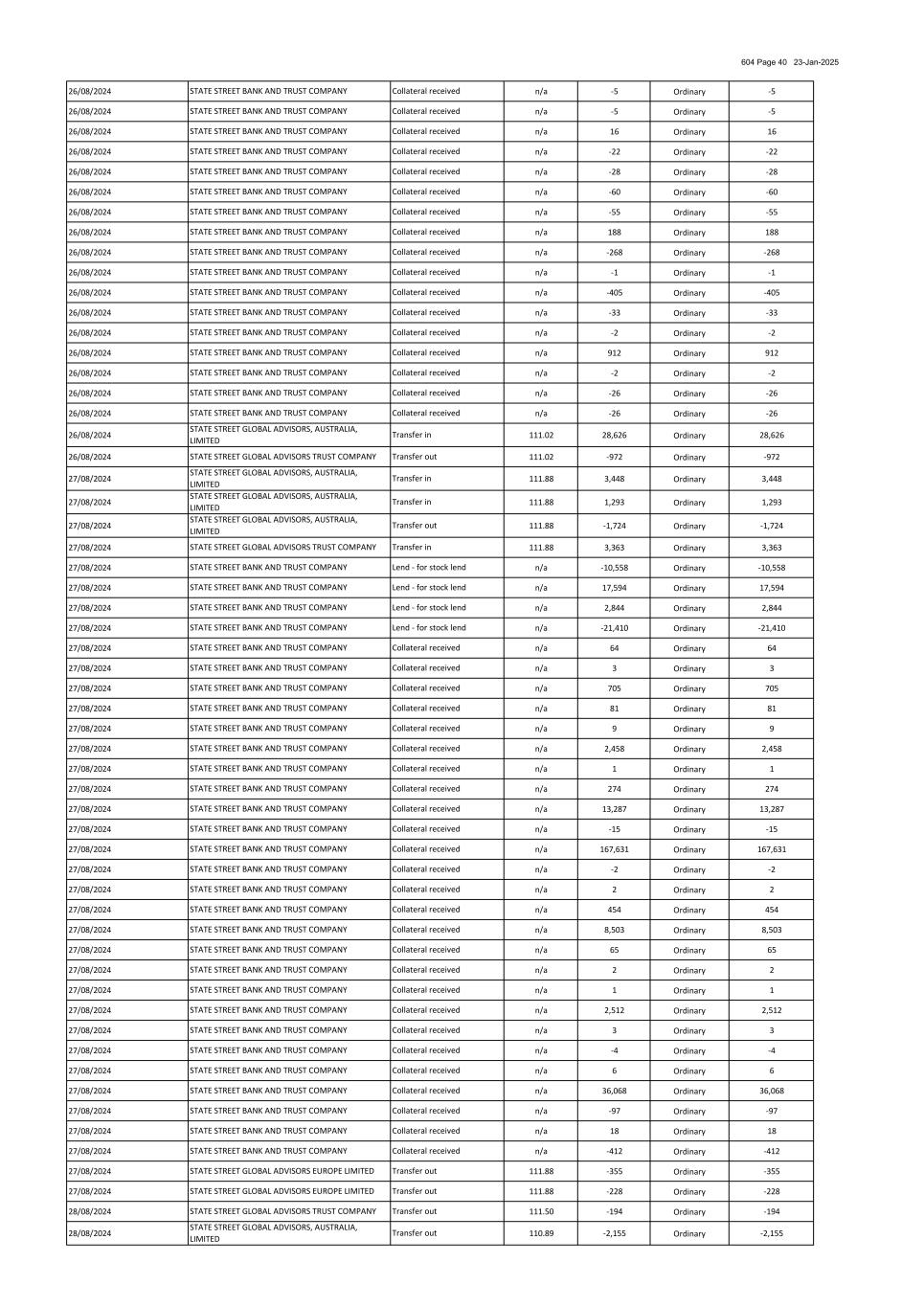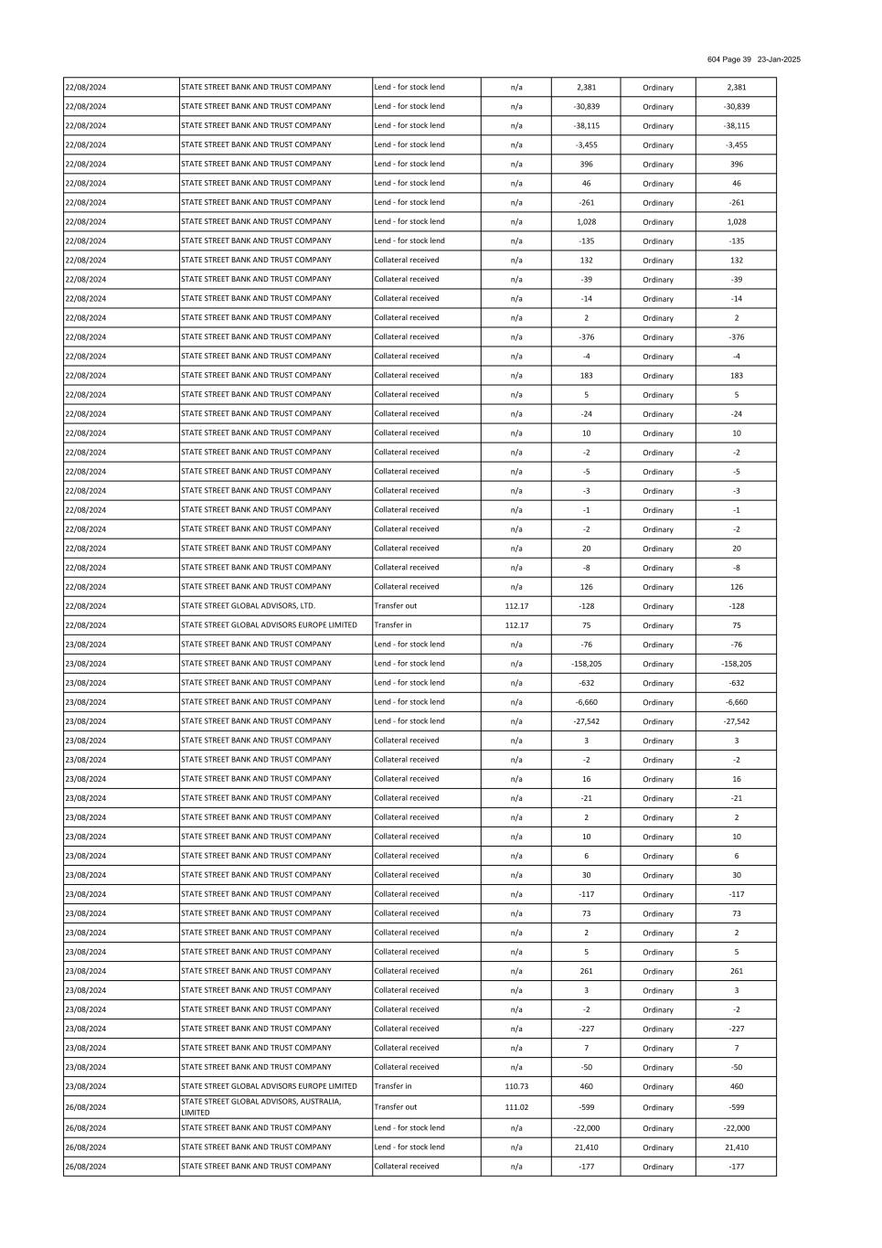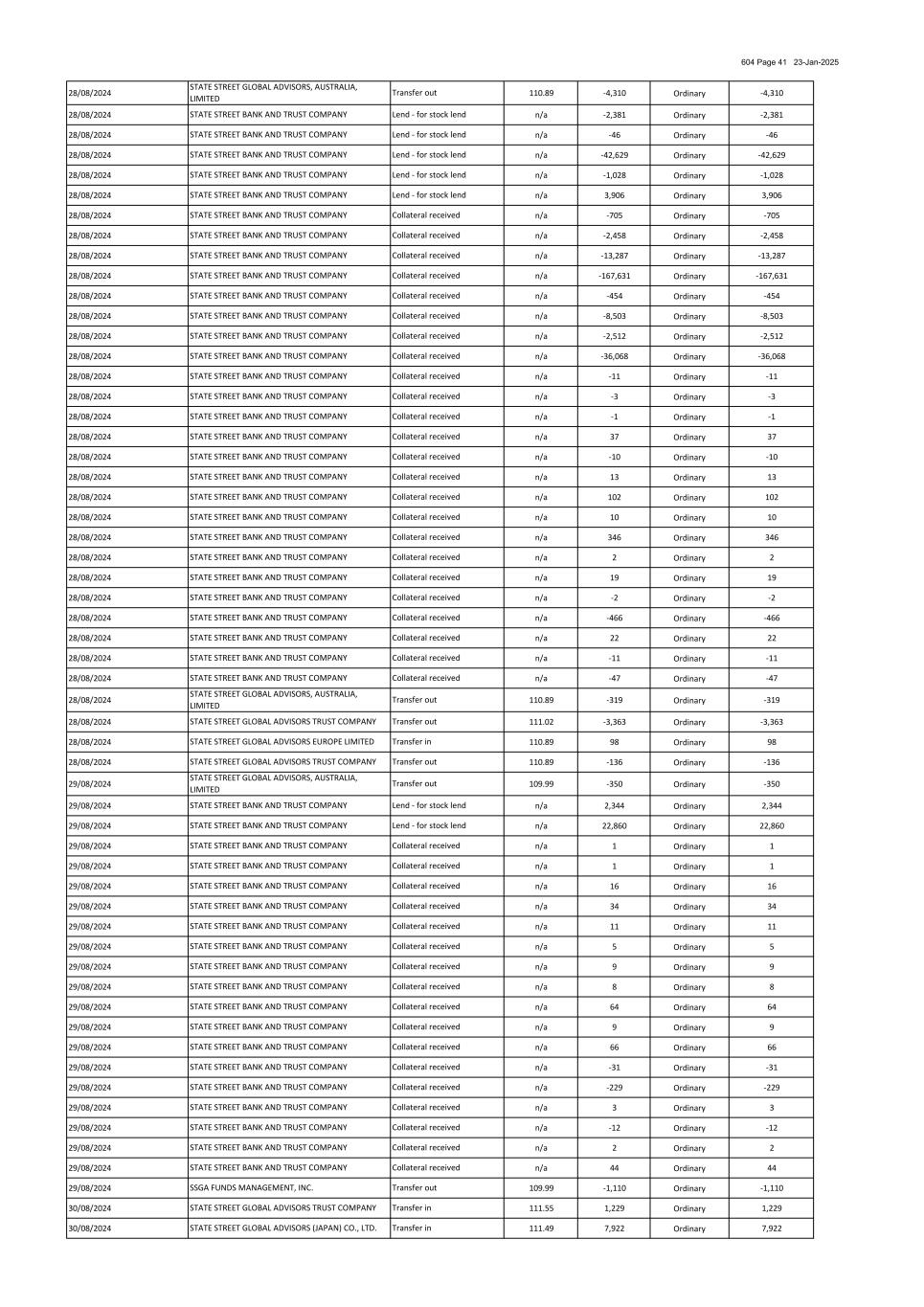 604 Page 40 23-Jan-2025 26/08/2024 n/a -5 Ordinary -5 26/08/2024 n/a -5 Ordinary -5 26/08/2024 n/a 16 Ordinary 16 26/08/2024 n/a -22 Ordinary -22 26/08/2024 n/a -28 Ordinary -28 26/08/2024 n/a -60 Ordinary -60 26/08/2024 n/a -55 Ordinary -55 26/08/2024 n/a 188 Ordinary 188 26/08/2024 n/a -268 Ordinary -268 26/08/2024 n/a -1 Ordinary -1 26/08/2024 n/a -405 Ordinary -405 26/08/2024 n/a -33 Ordinary -33 26/08/2024 n/a -2 Ordinary -2 26/08/2024 n/a 912 Ordinary 912 26/08/2024 n/a -2 Ordinary -2 26/08/2024 n/a -26 Ordinary -26 26/08/2024 n/a -26 Ordinary -26 26/08/2024 111.02 28,626 Ordinary 28,626 26/08/2024 111.02 -972 Ordinary -972 27/08/2024 111.88 3,448 Ordinary 3,448 27/08/2024 111.88 1,293 Ordinary 1,293 27/08/2024 111.88 -1,724 Ordinary -1,724 27/08/2024 111.88 3,363 Ordinary 3,363 27/08/2024 n/a -10,558 Ordinary -10,558 27/08/2024 n/a 17,594 Ordinary 17,594 27/08/2024 n/a 2,844 Ordinary 2,844 27/08/2024 n/a -21,410 Ordinary -21,410 27/08/2024 n/a 64 Ordinary 64 27/08/2024 n/a 3 Ordinary 3 27/08/2024 n/a 705 Ordinary 705 27/08/2024 n/a 81 Ordinary 81 27/08/2024 n/a 9 Ordinary 9 27/08/2024 n/a 2,458 Ordinary 2,458 27/08/2024 n/a 1 Ordinary 1 27/08/2024 n/a 274 Ordinary 274 27/08/2024 n/a 13,287 Ordinary 13,287 27/08/2024 n/a -15 Ordinary -15 27/08/2024 n/a 167,631 Ordinary 167,631 27/08/2024 n/a -2 Ordinary -2 27/08/2024 n/a 2 Ordinary 2 27/08/2024 n/a 454 Ordinary 454 27/08/2024 n/a 8,503 Ordinary 8,503 27/08/2024 n/a 65 Ordinary 65 27/08/2024 n/a 2 Ordinary 2 27/08/2024 n/a 1 Ordinary 1 27/08/2024 n/a 2,512 Ordinary 2,512 27/08/2024 n/a 3 Ordinary 3 27/08/2024 n/a -4 Ordinary -4 27/08/2024 n/a 6 Ordinary 6 27/08/2024 n/a 36,068 Ordinary 36,068 27/08/2024 n/a -97 Ordinary -97 27/08/2024 n/a 18 Ordinary 18 27/08/2024 n/a -412 Ordinary -412 27/08/2024 111.88 -355 Ordinary -355 27/08/2024 111.88 -228 Ordinary -228 28/08/2024 111.50 -194 Ordinary -194 28/08/2024 110.89 -2,155 Ordinary -2,155 Collateral received STATE STREET BANK AND TRUST COMPANY STATE STREET GLOBAL ADVISORS TRUST COMPANY STATE STREET BANK AND TRUST COMPANY Collateral received STATE STREET BANK AND TRUST COMPANY STATE STREET BANK AND TRUST COMPANY Collateral received Transfer out Transfer out STATE STREET BANK AND TRUST COMPANY Collateral received STATE STREET GLOBAL ADVISORS, AUSTRALIA, LIMITED STATE STREET BANK AND TRUST COMPANY Collateral received Collateral received STATE STREET BANK AND TRUST COMPANY STATE STREET GLOBAL ADVISORS, AUSTRALIA, LIMITED STATE STREET BANK AND TRUST COMPANY Collateral received Collateral received STATE STREET BANK AND TRUST COMPANY Collateral received Transfer in STATE STREET BANK AND TRUST COMPANY STATE STREET BANK AND TRUST COMPANY Collateral received Collateral received STATE STREET BANK AND TRUST COMPANY STATE STREET BANK AND TRUST COMPANY Collateral received STATE STREET BANK AND TRUST COMPANY STATE STREET BANK AND TRUST COMPANY Collateral received STATE STREET BANK AND TRUST COMPANY Lend - for stock lend Collateral received STATE STREET BANK AND TRUST COMPANY STATE STREET GLOBAL ADVISORS, AUSTRALIA, LIMITED STATE STREET BANK AND TRUST COMPANY Collateral received Collateral received STATE STREET BANK AND TRUST COMPANY Transfer in Transfer out Collateral received STATE STREET BANK AND TRUST COMPANY STATE STREET BANK AND TRUST COMPANY STATE STREET BANK AND TRUST COMPANY Transfer out Collateral received Collateral received Collateral received STATE STREET BANK AND TRUST COMPANY Collateral received Collateral received STATE STREET BANK AND TRUST COMPANY Collateral received STATE STREET GLOBAL ADVISORS TRUST COMPANY Collateral received STATE STREET BANK AND TRUST COMPANY Collateral received STATE STREET BANK AND TRUST COMPANY Collateral received STATE STREET BANK AND TRUST COMPANY Collateral received STATE STREET BANK AND TRUST COMPANY STATE STREET BANK AND TRUST COMPANY STATE STREET BANK AND TRUST COMPANY STATE STREET GLOBAL ADVISORS EUROPE LIMITED Collateral received STATE STREET GLOBAL ADVISORS TRUST COMPANY STATE STREET BANK AND TRUST COMPANY STATE STREET BANK AND TRUST COMPANY Collateral received STATE STREET BANK AND TRUST COMPANY Lend - for stock lend STATE STREET BANK AND TRUST COMPANY Collateral received Transfer in STATE STREET BANK AND TRUST COMPANY STATE STREET BANK AND TRUST COMPANY Lend - for stock lend STATE STREET BANK AND TRUST COMPANY Collateral received STATE STREET BANK AND TRUST COMPANY Transfer out Transfer out Transfer in STATE STREET BANK AND TRUST COMPANY STATE STREET BANK AND TRUST COMPANY STATE STREET BANK AND TRUST COMPANY Collateral received Collateral received STATE STREET GLOBAL ADVISORS, AUSTRALIA, LIMITED Collateral received Collateral received Collateral received Collateral received STATE STREET BANK AND TRUST COMPANY Collateral received STATE STREET BANK AND TRUST COMPANY Collateral received Collateral received STATE STREET BANK AND TRUST COMPANY Collateral received STATE STREET BANK AND TRUST COMPANY STATE STREET BANK AND TRUST COMPANY STATE STREET GLOBAL ADVISORS EUROPE LIMITED Collateral received STATE STREET GLOBAL ADVISORS, AUSTRALIA, LIMITED Collateral received Lend - for stock lend STATE STREET BANK AND TRUST COMPANY