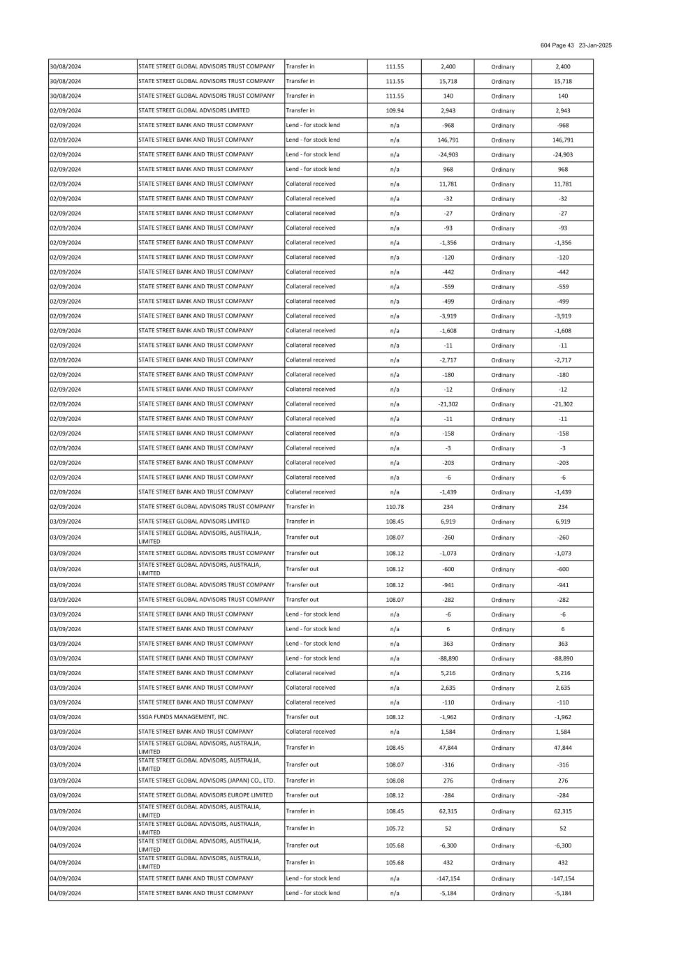 604 Page 43 23-Jan-2025 30/08/2024 111.55 2,400 Ordinary 2,400 30/08/2024 111.55 15,718 Ordinary 15,718 30/08/2024 111.55 140 Ordinary 140 02/09/2024 109.94 2,943 Ordinary 2,943 02/09/2024 n/a -968 Ordinary -968 02/09/2024 n/a 146,791 Ordinary 146,791 02/09/2024 n/a -24,903 Ordinary -24,903 02/09/2024 n/a 968 Ordinary 968 02/09/2024 n/a 11,781 Ordinary 11,781 02/09/2024 n/a -32 Ordinary -32 02/09/2024 n/a -27 Ordinary -27 02/09/2024 n/a -93 Ordinary -93 02/09/2024 n/a -1,356 Ordinary -1,356 02/09/2024 n/a -120 Ordinary -120 02/09/2024 n/a -442 Ordinary -442 02/09/2024 n/a -559 Ordinary -559 02/09/2024 n/a -499 Ordinary -499 02/09/2024 n/a -3,919 Ordinary -3,919 02/09/2024 n/a -1,608 Ordinary -1,608 02/09/2024 n/a -11 Ordinary -11 02/09/2024 n/a -2,717 Ordinary -2,717 02/09/2024 n/a -180 Ordinary -180 02/09/2024 n/a -12 Ordinary -12 02/09/2024 n/a -21,302 Ordinary -21,302 02/09/2024 n/a -11 Ordinary -11 02/09/2024 n/a -158 Ordinary -158 02/09/2024 n/a -3 Ordinary -3 02/09/2024 n/a -203 Ordinary -203 02/09/2024 n/a -6 Ordinary -6 02/09/2024 n/a -1,439 Ordinary -1,439 02/09/2024 110.78 234 Ordinary 234 03/09/2024 108.45 6,919 Ordinary 6,919 03/09/2024 108.07 -260 Ordinary -260 03/09/2024 108.12 -1,073 Ordinary -1,073 03/09/2024 108.12 -600 Ordinary -600 03/09/2024 108.12 -941 Ordinary -941 03/09/2024 108.07 -282 Ordinary -282 03/09/2024 n/a -6 Ordinary -6 03/09/2024 n/a 6 Ordinary 6 03/09/2024 n/a 363 Ordinary 363 03/09/2024 n/a -88,890 Ordinary -88,890 03/09/2024 n/a 5,216 Ordinary 5,216 03/09/2024 n/a 2,635 Ordinary 2,635 03/09/2024 n/a -110 Ordinary -110 03/09/2024 108.12 -1,962 Ordinary -1,962 03/09/2024 n/a 1,584 Ordinary 1,584 03/09/2024 108.45 47,844 Ordinary 47,844 03/09/2024 108.07 -316 Ordinary -316 03/09/2024 108.08 276 Ordinary 276 03/09/2024 108.12 -284 Ordinary -284 03/09/2024 108.45 62,315 Ordinary 62,315 04/09/2024 105.72 52 Ordinary 52 04/09/2024 105.68 -6,300 Ordinary -6,300 04/09/2024 105.68 432 Ordinary 432 04/09/2024 n/a -147,154 Ordinary -147,154 04/09/2024 n/a -5,184 Ordinary -5,184 Collateral received STATE STREET GLOBAL ADVISORS, AUSTRALIA, LIMITED Transfer out STATE STREET BANK AND TRUST COMPANY Collateral received Transfer in STATE STREET BANK AND TRUST COMPANY Collateral received Transfer out STATE STREET BANK AND TRUST COMPANY STATE STREET BANK AND TRUST COMPANY STATE STREET BANK AND TRUST COMPANY Transfer out Transfer in Collateral received STATE STREET BANK AND TRUST COMPANY Collateral received STATE STREET BANK AND TRUST COMPANY Transfer out STATE STREET BANK AND TRUST COMPANY STATE STREET BANK AND TRUST COMPANY STATE STREET GLOBAL ADVISORS, AUSTRALIA, LIMITED Collateral received STATE STREET BANK AND TRUST COMPANY STATE STREET BANK AND TRUST COMPANY Collateral received STATE STREET GLOBAL ADVISORS TRUST COMPANY Transfer in STATE STREET BANK AND TRUST COMPANY STATE STREET BANK AND TRUST COMPANY Collateral received Transfer in Collateral received STATE STREET GLOBAL ADVISORS LIMITED STATE STREET GLOBAL ADVISORS, AUSTRALIA, LIMITED Transfer in STATE STREET GLOBAL ADVISORS TRUST COMPANY Collateral received Collateral received STATE STREET BANK AND TRUST COMPANY Lend - for stock lend STATE STREET GLOBAL ADVISORS, AUSTRALIA, LIMITED Collateral received Collateral received STATE STREET GLOBAL ADVISORS, AUSTRALIA, LIMITED Lend - for stock lend Lend - for stock lend STATE STREET GLOBAL ADVISORS TRUST COMPANY Lend - for stock lend STATE STREET BANK AND TRUST COMPANY STATE STREET BANK AND TRUST COMPANY Transfer in STATE STREET BANK AND TRUST COMPANY STATE STREET GLOBAL ADVISORS TRUST COMPANY STATE STREET BANK AND TRUST COMPANY Collateral received Transfer in STATE STREET GLOBAL ADVISORS (JAPAN) CO., LTD. Transfer out STATE STREET GLOBAL ADVISORS LIMITED Lend - for stock lend STATE STREET BANK AND TRUST COMPANY Collateral received STATE STREET BANK AND TRUST COMPANY STATE STREET BANK AND TRUST COMPANY STATE STREET BANK AND TRUST COMPANY Collateral received STATE STREET GLOBAL ADVISORS, AUSTRALIA, LIMITED Transfer out STATE STREET BANK AND TRUST COMPANY STATE STREET BANK AND TRUST COMPANY Collateral received STATE STREET GLOBAL ADVISORS, AUSTRALIA, LIMITED Transfer in Transfer out STATE STREET BANK AND TRUST COMPANY Collateral received Lend - for stock lend STATE STREET BANK AND TRUST COMPANY STATE STREET BANK AND TRUST COMPANY Transfer out Lend - for stock lend Collateral received Collateral received STATE STREET BANK AND TRUST COMPANY Lend - for stock lend STATE STREET BANK AND TRUST COMPANY STATE STREET BANK AND TRUST COMPANY STATE STREET GLOBAL ADVISORS EUROPE LIMITED Transfer out Collateral received STATE STREET BANK AND TRUST COMPANY Transfer in STATE STREET GLOBAL ADVISORS TRUST COMPANY Collateral received Collateral received Lend - for stock lend STATE STREET BANK AND TRUST COMPANY STATE STREET GLOBAL ADVISORS, AUSTRALIA, LIMITED STATE STREET BANK AND TRUST COMPANY STATE STREET GLOBAL ADVISORS TRUST COMPANY Lend - for stock lend Collateral received STATE STREET GLOBAL ADVISORS TRUST COMPANY STATE STREET BANK AND TRUST COMPANY STATE STREET BANK AND TRUST COMPANY Transfer in STATE STREET BANK AND TRUST COMPANY SSGA FUNDS MANAGEMENT, INC. Collateral received Transfer in Collateral received