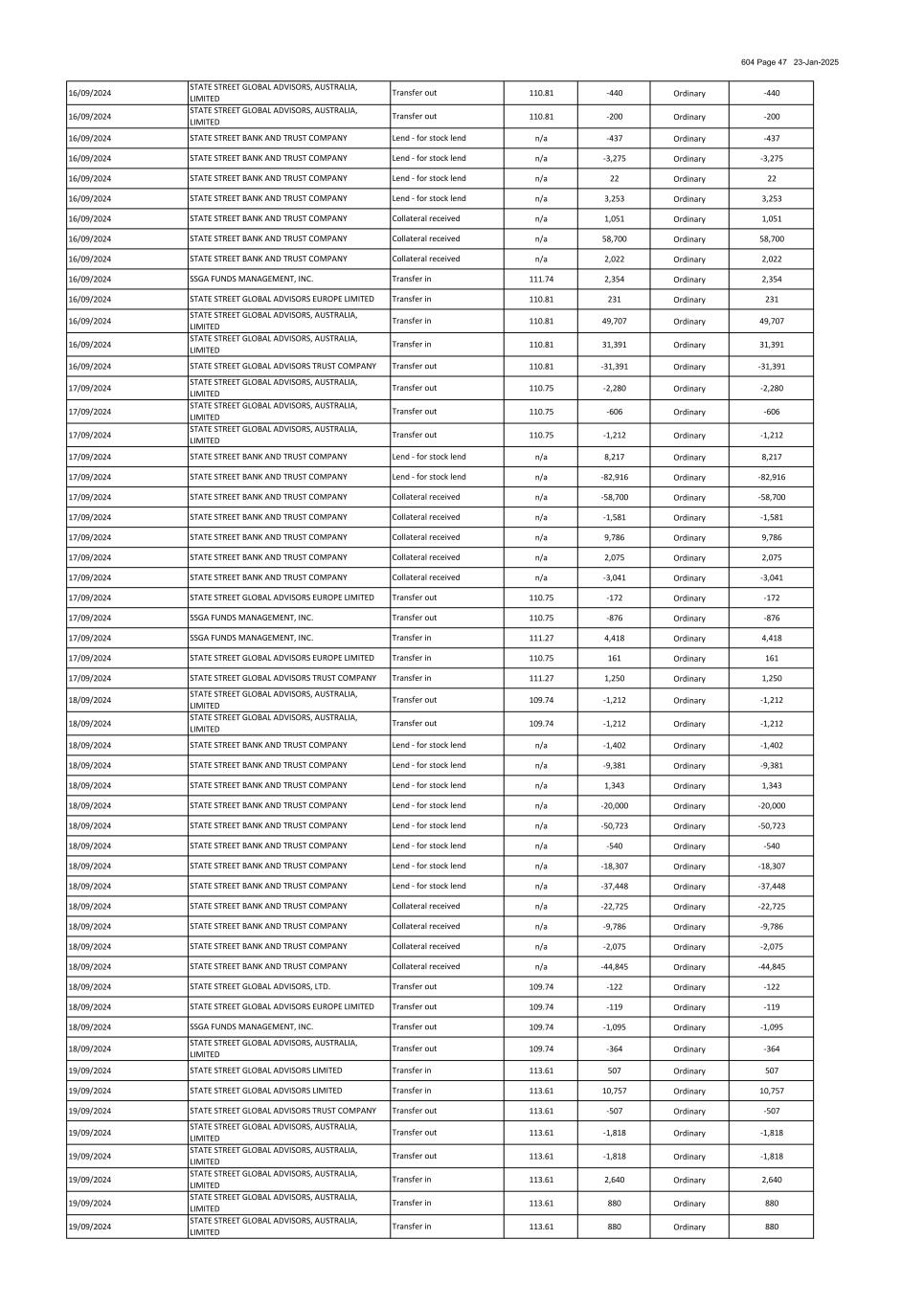 604 Page 47 23-Jan-2025 16/09/2024 110.81 -440 Ordinary -440 16/09/2024 110.81 -200 Ordinary -200 16/09/2024 n/a -437 Ordinary -437 16/09/2024 n/a -3,275 Ordinary -3,275 16/09/2024 n/a 22 Ordinary 22 16/09/2024 n/a 3,253 Ordinary 3,253 16/09/2024 n/a 1,051 Ordinary 1,051 16/09/2024 n/a 58,700 Ordinary 58,700 16/09/2024 n/a 2,022 Ordinary 2,022 16/09/2024 111.74 2,354 Ordinary 2,354 16/09/2024 110.81 231 Ordinary 231 16/09/2024 110.81 49,707 Ordinary 49,707 16/09/2024 110.81 31,391 Ordinary 31,391 16/09/2024 110.81 -31,391 Ordinary -31,391 17/09/2024 110.75 -2,280 Ordinary -2,280 17/09/2024 110.75 -606 Ordinary -606 17/09/2024 110.75 -1,212 Ordinary -1,212 17/09/2024 n/a 8,217 Ordinary 8,217 17/09/2024 n/a -82,916 Ordinary -82,916 17/09/2024 n/a -58,700 Ordinary -58,700 17/09/2024 n/a -1,581 Ordinary -1,581 17/09/2024 n/a 9,786 Ordinary 9,786 17/09/2024 n/a 2,075 Ordinary 2,075 17/09/2024 n/a -3,041 Ordinary -3,041 17/09/2024 110.75 -172 Ordinary -172 17/09/2024 110.75 -876 Ordinary -876 17/09/2024 111.27 4,418 Ordinary 4,418 17/09/2024 110.75 161 Ordinary 161 17/09/2024 111.27 1,250 Ordinary 1,250 18/09/2024 109.74 -1,212 Ordinary -1,212 18/09/2024 109.74 -1,212 Ordinary -1,212 18/09/2024 n/a -1,402 Ordinary -1,402 18/09/2024 n/a -9,381 Ordinary -9,381 18/09/2024 n/a 1,343 Ordinary 1,343 18/09/2024 n/a -20,000 Ordinary -20,000 18/09/2024 n/a -50,723 Ordinary -50,723 18/09/2024 n/a -540 Ordinary -540 18/09/2024 n/a -18,307 Ordinary -18,307 18/09/2024 n/a -37,448 Ordinary -37,448 18/09/2024 n/a -22,725 Ordinary -22,725 18/09/2024 n/a -9,786 Ordinary -9,786 18/09/2024 n/a -2,075 Ordinary -2,075 18/09/2024 n/a -44,845 Ordinary -44,845 18/09/2024 109.74 -122 Ordinary -122 18/09/2024 109.74 -119 Ordinary -119 18/09/2024 109.74 -1,095 Ordinary -1,095 18/09/2024 109.74 -364 Ordinary -364 19/09/2024 113.61 507 Ordinary 507 19/09/2024 113.61 10,757 Ordinary 10,757 19/09/2024 113.61 -507 Ordinary -507 19/09/2024 113.61 -1,818 Ordinary -1,818 19/09/2024 113.61 -1,818 Ordinary -1,818 19/09/2024 113.61 2,640 Ordinary 2,640 19/09/2024 113.61 880 Ordinary 880 19/09/2024 113.61 880 Ordinary 880Transfer in STATE STREET BANK AND TRUST COMPANY Lend - for stock lend Transfer out SSGA FUNDS MANAGEMENT, INC. STATE STREET BANK AND TRUST COMPANY STATE STREET GLOBAL ADVISORS LIMITED Transfer out STATE STREET BANK AND TRUST COMPANY Lend - for stock lend Transfer in Transfer in Transfer in STATE STREET GLOBAL ADVISORS, AUSTRALIA, LIMITED STATE STREET BANK AND TRUST COMPANY Lend - for stock lend Transfer in SSGA FUNDS MANAGEMENT, INC. Transfer in STATE STREET BANK AND TRUST COMPANY Transfer out STATE STREET GLOBAL ADVISORS, AUSTRALIA, LIMITED STATE STREET BANK AND TRUST COMPANY Collateral received STATE STREET GLOBAL ADVISORS, AUSTRALIA, LIMITED Lend - for stock lend STATE STREET BANK AND TRUST COMPANY STATE STREET GLOBAL ADVISORS, LTD. Collateral received STATE STREET BANK AND TRUST COMPANY Transfer in STATE STREET GLOBAL ADVISORS, AUSTRALIA, LIMITED Lend - for stock lend STATE STREET GLOBAL ADVISORS, AUSTRALIA, LIMITED Lend - for stock lend SSGA FUNDS MANAGEMENT, INC. STATE STREET GLOBAL ADVISORS LIMITED Transfer out Transfer out STATE STREET BANK AND TRUST COMPANY STATE STREET GLOBAL ADVISORS EUROPE LIMITED Transfer out Collateral received Lend - for stock lend STATE STREET BANK AND TRUST COMPANY Collateral received STATE STREET GLOBAL ADVISORS EUROPE LIMITED Transfer in STATE STREET GLOBAL ADVISORS TRUST COMPANY STATE STREET BANK AND TRUST COMPANY Transfer out Transfer out STATE STREET GLOBAL ADVISORS, AUSTRALIA, LIMITED STATE STREET BANK AND TRUST COMPANY STATE STREET GLOBAL ADVISORS, AUSTRALIA, LIMITED Transfer out STATE STREET GLOBAL ADVISORS EUROPE LIMITED Transfer out STATE STREET BANK AND TRUST COMPANY STATE STREET BANK AND TRUST COMPANY Transfer out Collateral received STATE STREET GLOBAL ADVISORS, AUSTRALIA, LIMITED Lend - for stock lend Transfer in Collateral received STATE STREET BANK AND TRUST COMPANY Transfer out STATE STREET BANK AND TRUST COMPANY Transfer out Transfer in STATE STREET GLOBAL ADVISORS TRUST COMPANY SSGA FUNDS MANAGEMENT, INC. STATE STREET BANK AND TRUST COMPANY STATE STREET BANK AND TRUST COMPANY Lend - for stock lend STATE STREET GLOBAL ADVISORS, AUSTRALIA, LIMITED STATE STREET BANK AND TRUST COMPANY Lend - for stock lend Transfer out Collateral received STATE STREET BANK AND TRUST COMPANY Lend - for stock lend STATE STREET BANK AND TRUST COMPANY Collateral received Transfer in STATE STREET GLOBAL ADVISORS, AUSTRALIA, LIMITED STATE STREET GLOBAL ADVISORS, AUSTRALIA, LIMITED STATE STREET GLOBAL ADVISORS, AUSTRALIA, LIMITED Transfer out STATE STREET GLOBAL ADVISORS, AUSTRALIA, LIMITED Lend - for stock lend Collateral received STATE STREET GLOBAL ADVISORS, AUSTRALIA, LIMITED Collateral received STATE STREET BANK AND TRUST COMPANY Collateral received STATE STREET BANK AND TRUST COMPANY STATE STREET BANK AND TRUST COMPANY STATE STREET GLOBAL ADVISORS EUROPE LIMITED Lend - for stock lend STATE STREET GLOBAL ADVISORS TRUST COMPANY Transfer out Collateral received Transfer in STATE STREET BANK AND TRUST COMPANY Lend - for stock lend Transfer out STATE STREET GLOBAL ADVISORS, AUSTRALIA, LIMITED STATE STREET BANK AND TRUST COMPANY