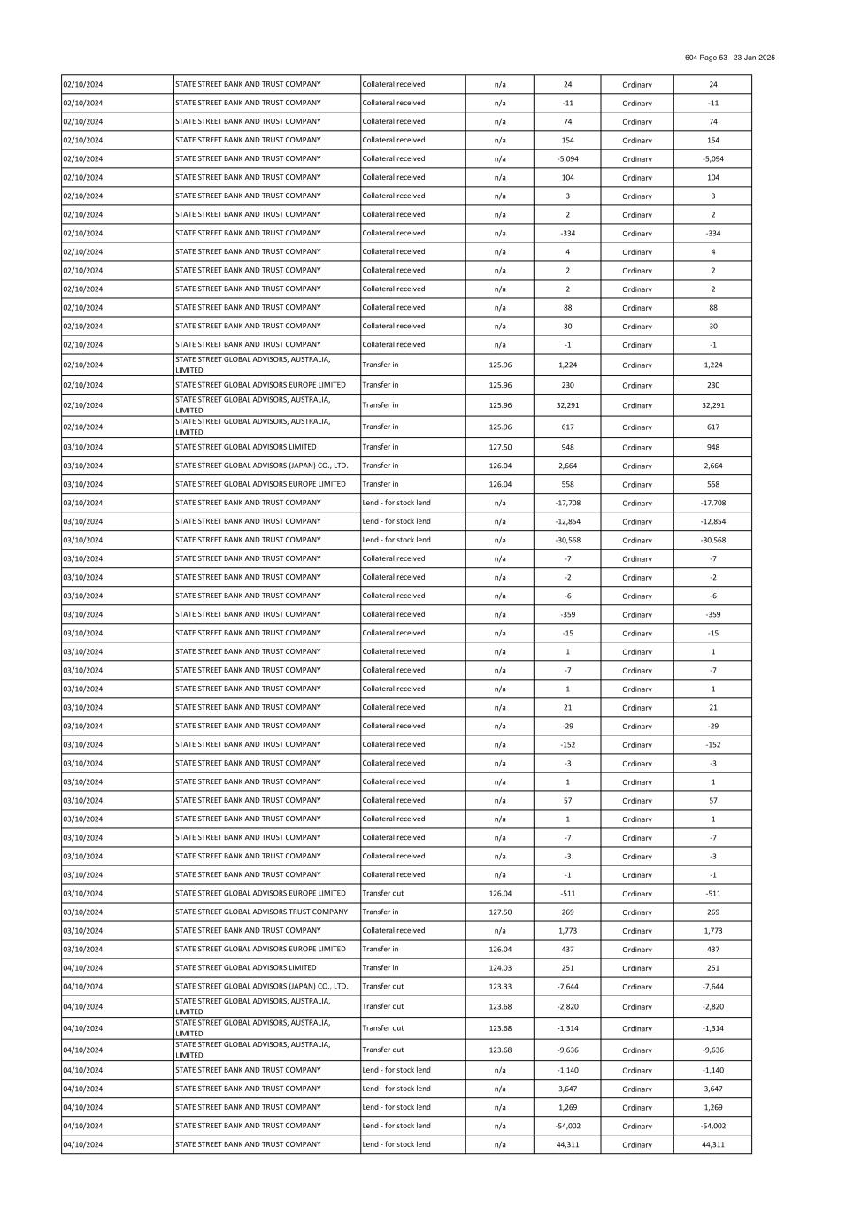 604 Page 53 23-Jan-2025 02/10/2024 n/a 24 Ordinary 24 02/10/2024 n/a -11 Ordinary -11 02/10/2024 n/a 74 Ordinary 74 02/10/2024 n/a 154 Ordinary 154 02/10/2024 n/a -5,094 Ordinary -5,094 02/10/2024 n/a 104 Ordinary 104 02/10/2024 n/a 3 Ordinary 3 02/10/2024 n/a 2 Ordinary 2 02/10/2024 n/a -334 Ordinary -334 02/10/2024 n/a 4 Ordinary 4 02/10/2024 n/a 2 Ordinary 2 02/10/2024 n/a 2 Ordinary 2 02/10/2024 n/a 88 Ordinary 88 02/10/2024 n/a 30 Ordinary 30 02/10/2024 n/a -1 Ordinary -1 02/10/2024 125.96 1,224 Ordinary 1,224 02/10/2024 125.96 230 Ordinary 230 02/10/2024 125.96 32,291 Ordinary 32,291 02/10/2024 125.96 617 Ordinary 617 03/10/2024 127.50 948 Ordinary 948 03/10/2024 126.04 2,664 Ordinary 2,664 03/10/2024 126.04 558 Ordinary 558 03/10/2024 n/a -17,708 Ordinary -17,708 03/10/2024 n/a -12,854 Ordinary -12,854 03/10/2024 n/a -30,568 Ordinary -30,568 03/10/2024 n/a -7 Ordinary -7 03/10/2024 n/a -2 Ordinary -2 03/10/2024 n/a -6 Ordinary -6 03/10/2024 n/a -359 Ordinary -359 03/10/2024 n/a -15 Ordinary -15 03/10/2024 n/a 1 Ordinary 1 03/10/2024 n/a -7 Ordinary -7 03/10/2024 n/a 1 Ordinary 1 03/10/2024 n/a 21 Ordinary 21 03/10/2024 n/a -29 Ordinary -29 03/10/2024 n/a -152 Ordinary -152 03/10/2024 n/a -3 Ordinary -3 03/10/2024 n/a 1 Ordinary 1 03/10/2024 n/a 57 Ordinary 57 03/10/2024 n/a 1 Ordinary 1 03/10/2024 n/a -7 Ordinary -7 03/10/2024 n/a -3 Ordinary -3 03/10/2024 n/a -1 Ordinary -1 03/10/2024 126.04 -511 Ordinary -511 03/10/2024 127.50 269 Ordinary 269 03/10/2024 n/a 1,773 Ordinary 1,773 03/10/2024 126.04 437 Ordinary 437 04/10/2024 124.03 251 Ordinary 251 04/10/2024 123.33 -7,644 Ordinary -7,644 04/10/2024 123.68 -2,820 Ordinary -2,820 04/10/2024 123.68 -1,314 Ordinary -1,314 04/10/2024 123.68 -9,636 Ordinary -9,636 04/10/2024 n/a -1,140 Ordinary -1,140 04/10/2024 n/a 3,647 Ordinary 3,647 04/10/2024 n/a 1,269 Ordinary 1,269 04/10/2024 n/a -54,002 Ordinary -54,002 04/10/2024 n/a 44,311 Ordinary 44,311 STATE STREET BANK AND TRUST COMPANY STATE STREET BANK AND TRUST COMPANY Transfer in Collateral received Collateral received Collateral received STATE STREET BANK AND TRUST COMPANY STATE STREET BANK AND TRUST COMPANY Collateral received Transfer in STATE STREET BANK AND TRUST COMPANY Collateral received Collateral received STATE STREET BANK AND TRUST COMPANY STATE STREET BANK AND TRUST COMPANY Collateral received Transfer in Transfer in STATE STREET GLOBAL ADVISORS, AUSTRALIA, LIMITED STATE STREET BANK AND TRUST COMPANY Collateral received STATE STREET GLOBAL ADVISORS, AUSTRALIA, LIMITED STATE STREET GLOBAL ADVISORS LIMITED Collateral received STATE STREET BANK AND TRUST COMPANY Lend - for stock lend Collateral received STATE STREET BANK AND TRUST COMPANY Collateral received Collateral received Collateral received STATE STREET BANK AND TRUST COMPANY STATE STREET GLOBAL ADVISORS (JAPAN) CO., LTD. Collateral received STATE STREET BANK AND TRUST COMPANY STATE STREET BANK AND TRUST COMPANY Lend - for stock lend Transfer in Collateral received STATE STREET GLOBAL ADVISORS EUROPE LIMITED STATE STREET BANK AND TRUST COMPANY STATE STREET BANK AND TRUST COMPANY STATE STREET BANK AND TRUST COMPANY Lend - for stock lend STATE STREET GLOBAL ADVISORS LIMITED STATE STREET BANK AND TRUST COMPANY Lend - for stock lend STATE STREET GLOBAL ADVISORS, AUSTRALIA, LIMITED Collateral received Collateral received STATE STREET BANK AND TRUST COMPANY Transfer out STATE STREET BANK AND TRUST COMPANY Collateral received STATE STREET BANK AND TRUST COMPANY Transfer in Collateral received STATE STREET BANK AND TRUST COMPANY Collateral received STATE STREET BANK AND TRUST COMPANY STATE STREET BANK AND TRUST COMPANY Transfer out STATE STREET BANK AND TRUST COMPANY Transfer in STATE STREET BANK AND TRUST COMPANY STATE STREET BANK AND TRUST COMPANY STATE STREET BANK AND TRUST COMPANY STATE STREET GLOBAL ADVISORS EUROPE LIMITED Collateral received Collateral received Transfer out Collateral received Collateral received Collateral received STATE STREET BANK AND TRUST COMPANY STATE STREET BANK AND TRUST COMPANY STATE STREET BANK AND TRUST COMPANY Collateral received Transfer in Lend - for stock lend STATE STREET BANK AND TRUST COMPANY Collateral received Lend - for stock lend STATE STREET GLOBAL ADVISORS EUROPE LIMITED STATE STREET GLOBAL ADVISORS (JAPAN) CO., LTD. STATE STREET BANK AND TRUST COMPANY STATE STREET BANK AND TRUST COMPANY Collateral received Lend - for stock lend STATE STREET GLOBAL ADVISORS, AUSTRALIA, LIMITED STATE STREET BANK AND TRUST COMPANY Lend - for stock lend STATE STREET GLOBAL ADVISORS, AUSTRALIA, LIMITED Collateral received Collateral received Transfer in STATE STREET BANK AND TRUST COMPANY STATE STREET BANK AND TRUST COMPANY Transfer out STATE STREET BANK AND TRUST COMPANY STATE STREET GLOBAL ADVISORS, AUSTRALIA, LIMITED STATE STREET GLOBAL ADVISORS EUROPE LIMITED STATE STREET BANK AND TRUST COMPANY Collateral received Transfer out Transfer in STATE STREET BANK AND TRUST COMPANY STATE STREET BANK AND TRUST COMPANY STATE STREET GLOBAL ADVISORS TRUST COMPANY STATE STREET BANK AND TRUST COMPANY Collateral received STATE STREET BANK AND TRUST COMPANY Collateral received Collateral received