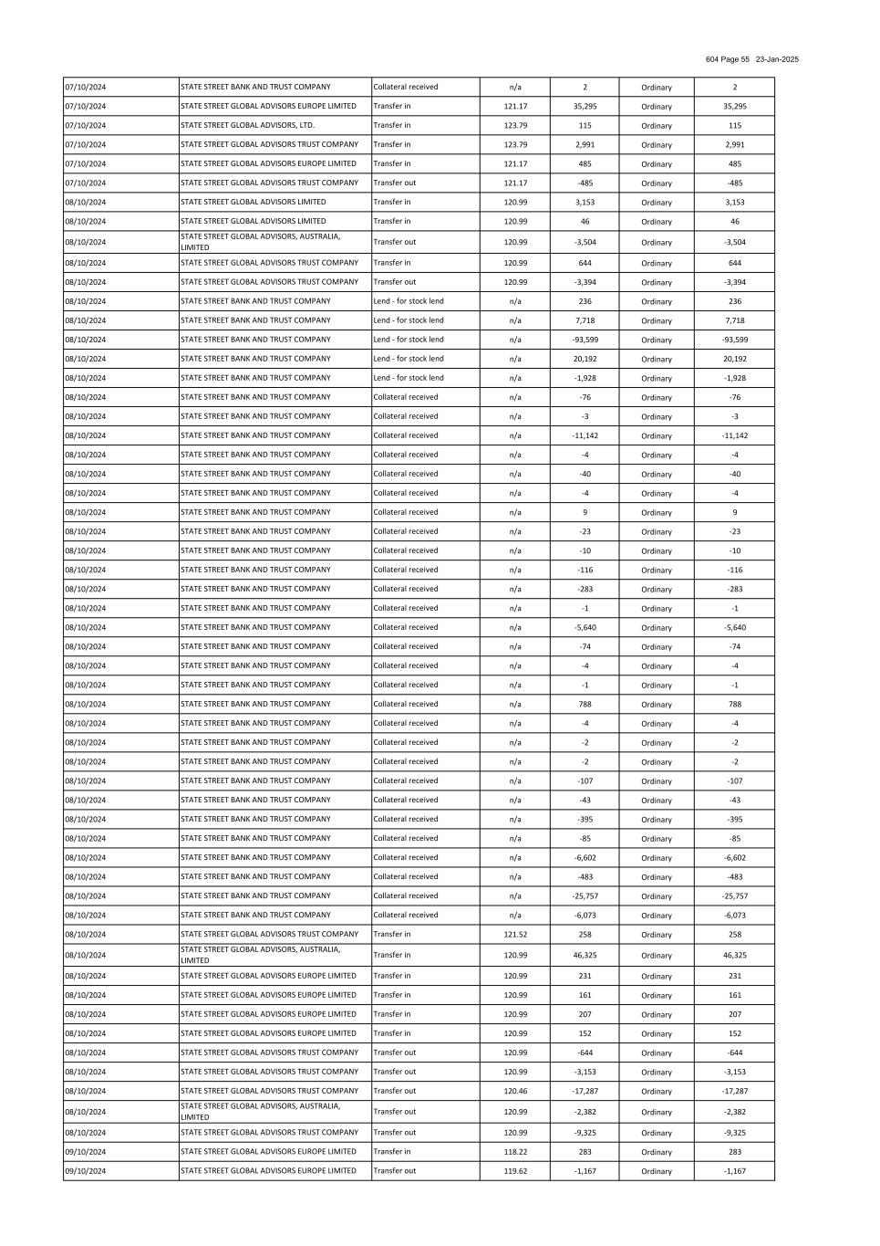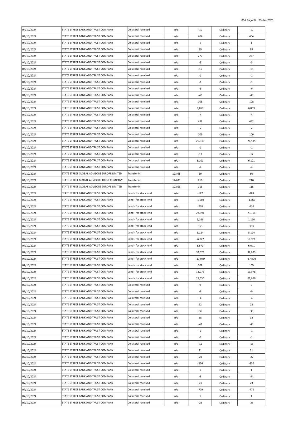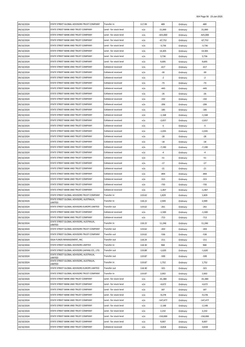 604 Page 54 23-Jan-2025 04/10/2024 n/a -10 Ordinary -10 04/10/2024 n/a 404 Ordinary 404 04/10/2024 n/a 1 Ordinary 1 04/10/2024 n/a 89 Ordinary 89 04/10/2024 n/a 277 Ordinary 277 04/10/2024 n/a -3 Ordinary -3 04/10/2024 n/a -15 Ordinary -15 04/10/2024 n/a -1 Ordinary -1 04/10/2024 n/a -1 Ordinary -1 04/10/2024 n/a -6 Ordinary -6 04/10/2024 n/a -40 Ordinary -40 04/10/2024 n/a 108 Ordinary 108 04/10/2024 n/a 6,859 Ordinary 6,859 04/10/2024 n/a -4 Ordinary -4 04/10/2024 n/a 492 Ordinary 492 04/10/2024 n/a -2 Ordinary -2 04/10/2024 n/a 106 Ordinary 106 04/10/2024 n/a 26,535 Ordinary 26,535 04/10/2024 n/a -1 Ordinary -1 04/10/2024 n/a -17 Ordinary -17 04/10/2024 n/a 6,101 Ordinary 6,101 04/10/2024 n/a -4 Ordinary -4 04/10/2024 123.68 60 Ordinary 60 04/10/2024 124.03 216 Ordinary 216 04/10/2024 123.68 115 Ordinary 115 07/10/2024 n/a -187 Ordinary -187 07/10/2024 n/a -1,569 Ordinary -1,569 07/10/2024 n/a -738 Ordinary -738 07/10/2024 n/a 23,394 Ordinary 23,394 07/10/2024 n/a 1,166 Ordinary 1,166 07/10/2024 n/a 353 Ordinary 353 07/10/2024 n/a 5,124 Ordinary 5,124 07/10/2024 n/a -6,022 Ordinary -6,022 07/10/2024 n/a 6,671 Ordinary 6,671 07/10/2024 n/a 32,673 Ordinary 32,673 07/10/2024 n/a -57,970 Ordinary -57,970 07/10/2024 n/a 109 Ordinary 109 07/10/2024 n/a 13,978 Ordinary 13,978 07/10/2024 n/a 21,656 Ordinary 21,656 07/10/2024 n/a 9 Ordinary 9 07/10/2024 n/a -9 Ordinary -9 07/10/2024 n/a -4 Ordinary -4 07/10/2024 n/a 22 Ordinary 22 07/10/2024 n/a -35 Ordinary -35 07/10/2024 n/a 38 Ordinary 38 07/10/2024 n/a -43 Ordinary -43 07/10/2024 n/a -1 Ordinary -1 07/10/2024 n/a -1 Ordinary -1 07/10/2024 n/a -15 Ordinary -15 07/10/2024 n/a 21 Ordinary 21 07/10/2024 n/a -22 Ordinary -22 07/10/2024 n/a -256 Ordinary -256 07/10/2024 n/a 1 Ordinary 1 07/10/2024 n/a -8 Ordinary -8 07/10/2024 n/a 23 Ordinary 23 07/10/2024 n/a -779 Ordinary -779 07/10/2024 n/a 1 Ordinary 1 07/10/2024 n/a -28 Ordinary -28 Collateral received STATE STREET BANK AND TRUST COMPANY Collateral received STATE STREET BANK AND TRUST COMPANY Collateral received STATE STREET BANK AND TRUST COMPANY Collateral received Collateral received Lend - for stock lend Collateral received STATE STREET BANK AND TRUST COMPANY STATE STREET GLOBAL ADVISORS TRUST COMPANY STATE STREET BANK AND TRUST COMPANY STATE STREET BANK AND TRUST COMPANY Collateral received Collateral received STATE STREET BANK AND TRUST COMPANY Collateral received STATE STREET BANK AND TRUST COMPANY Lend - for stock lend STATE STREET BANK AND TRUST COMPANY STATE STREET GLOBAL ADVISORS EUROPE LIMITED Collateral received Collateral received STATE STREET BANK AND TRUST COMPANY STATE STREET BANK AND TRUST COMPANY STATE STREET BANK AND TRUST COMPANY STATE STREET BANK AND TRUST COMPANY Lend - for stock lend Lend - for stock lendSTATE STREET BANK AND TRUST COMPANY Collateral received Collateral received Collateral received STATE STREET BANK AND TRUST COMPANY STATE STREET BANK AND TRUST COMPANY Lend - for stock lend STATE STREET BANK AND TRUST COMPANY Lend - for stock lend STATE STREET BANK AND TRUST COMPANY STATE STREET BANK AND TRUST COMPANY STATE STREET BANK AND TRUST COMPANY STATE STREET BANK AND TRUST COMPANY STATE STREET BANK AND TRUST COMPANY Collateral received STATE STREET BANK AND TRUST COMPANY Collateral received Collateral received Collateral received STATE STREET BANK AND TRUST COMPANY STATE STREET BANK AND TRUST COMPANY Lend - for stock lend Collateral received Lend - for stock lend Collateral received Collateral receivedSTATE STREET BANK AND TRUST COMPANY STATE STREET BANK AND TRUST COMPANY STATE STREET BANK AND TRUST COMPANY Collateral received Transfer in STATE STREET BANK AND TRUST COMPANY STATE STREET BANK AND TRUST COMPANY Lend - for stock lend STATE STREET BANK AND TRUST COMPANY STATE STREET BANK AND TRUST COMPANY Collateral received STATE STREET BANK AND TRUST COMPANY Collateral received Collateral received Lend - for stock lendSTATE STREET BANK AND TRUST COMPANY Collateral received Collateral received STATE STREET BANK AND TRUST COMPANY Collateral received STATE STREET BANK AND TRUST COMPANY Lend - for stock lend Collateral received STATE STREET BANK AND TRUST COMPANY Collateral received STATE STREET BANK AND TRUST COMPANY Collateral received STATE STREET BANK AND TRUST COMPANY Collateral received STATE STREET BANK AND TRUST COMPANY STATE STREET BANK AND TRUST COMPANY Lend - for stock lend STATE STREET BANK AND TRUST COMPANY Collateral received STATE STREET BANK AND TRUST COMPANY STATE STREET GLOBAL ADVISORS EUROPE LIMITED STATE STREET BANK AND TRUST COMPANY Collateral received STATE STREET BANK AND TRUST COMPANY Collateral received Transfer in STATE STREET BANK AND TRUST COMPANY Collateral received Lend - for stock lend STATE STREET BANK AND TRUST COMPANY STATE STREET BANK AND TRUST COMPANY Collateral received STATE STREET BANK AND TRUST COMPANY Transfer in STATE STREET BANK AND TRUST COMPANY STATE STREET BANK AND TRUST COMPANY Lend - for stock lend STATE STREET BANK AND TRUST COMPANY Collateral received STATE STREET BANK AND TRUST COMPANY Collateral received Collateral received STATE STREET BANK AND TRUST COMPANY Collateral received STATE STREET BANK AND TRUST COMPANY