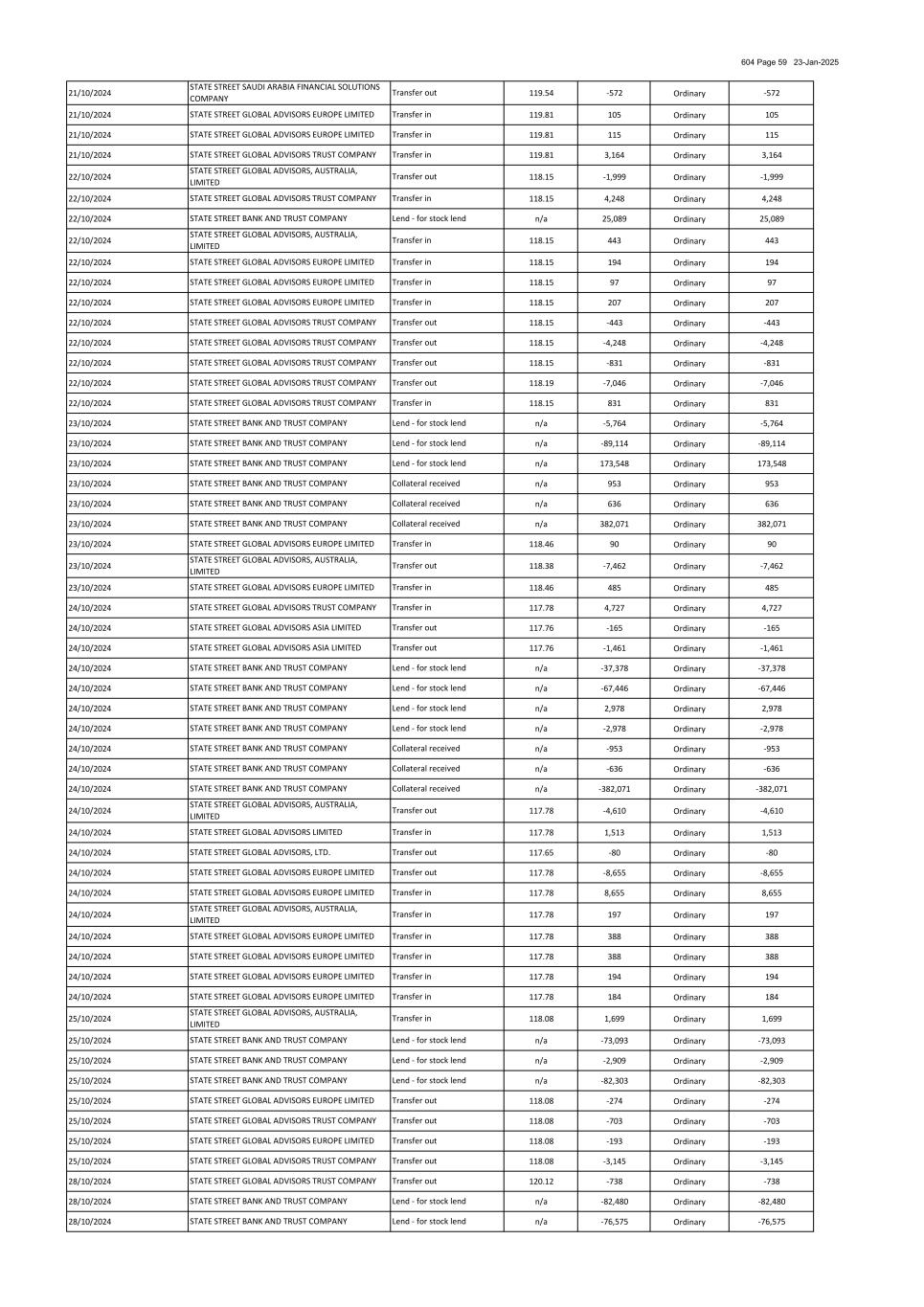 604 Page 59 23-Jan-2025 21/10/2024 119.54 -572 Ordinary -572 21/10/2024 119.81 105 Ordinary 105 21/10/2024 119.81 115 Ordinary 115 21/10/2024 119.81 3,164 Ordinary 3,164 22/10/2024 118.15 -1,999 Ordinary -1,999 22/10/2024 118.15 4,248 Ordinary 4,248 22/10/2024 n/a 25,089 Ordinary 25,089 22/10/2024 118.15 443 Ordinary 443 22/10/2024 118.15 194 Ordinary 194 22/10/2024 118.15 97 Ordinary 97 22/10/2024 118.15 207 Ordinary 207 22/10/2024 118.15 -443 Ordinary -443 22/10/2024 118.15 -4,248 Ordinary -4,248 22/10/2024 118.15 -831 Ordinary -831 22/10/2024 118.19 -7,046 Ordinary -7,046 22/10/2024 118.15 831 Ordinary 831 23/10/2024 n/a -5,764 Ordinary -5,764 23/10/2024 n/a -89,114 Ordinary -89,114 23/10/2024 n/a 173,548 Ordinary 173,548 23/10/2024 n/a 953 Ordinary 953 23/10/2024 n/a 636 Ordinary 636 23/10/2024 n/a 382,071 Ordinary 382,071 23/10/2024 118.46 90 Ordinary 90 23/10/2024 118.38 -7,462 Ordinary -7,462 23/10/2024 118.46 485 Ordinary 485 24/10/2024 117.78 4,727 Ordinary 4,727 24/10/2024 117.76 -165 Ordinary -165 24/10/2024 117.76 -1,461 Ordinary -1,461 24/10/2024 n/a -37,378 Ordinary -37,378 24/10/2024 n/a -67,446 Ordinary -67,446 24/10/2024 n/a 2,978 Ordinary 2,978 24/10/2024 n/a -2,978 Ordinary -2,978 24/10/2024 n/a -953 Ordinary -953 24/10/2024 n/a -636 Ordinary -636 24/10/2024 n/a -382,071 Ordinary -382,071 24/10/2024 117.78 -4,610 Ordinary -4,610 24/10/2024 117.78 1,513 Ordinary 1,513 24/10/2024 117.65 -80 Ordinary -80 24/10/2024 117.78 -8,655 Ordinary -8,655 24/10/2024 117.78 8,655 Ordinary 8,655 24/10/2024 117.78 197 Ordinary 197 24/10/2024 117.78 388 Ordinary 388 24/10/2024 117.78 388 Ordinary 388 24/10/2024 117.78 194 Ordinary 194 24/10/2024 117.78 184 Ordinary 184 25/10/2024 118.08 1,699 Ordinary 1,699 25/10/2024 n/a -73,093 Ordinary -73,093 25/10/2024 n/a -2,909 Ordinary -2,909 25/10/2024 n/a -82,303 Ordinary -82,303 25/10/2024 118.08 -274 Ordinary -274 25/10/2024 118.08 -703 Ordinary -703 25/10/2024 118.08 -193 Ordinary -193 25/10/2024 118.08 -3,145 Ordinary -3,145 28/10/2024 120.12 -738 Ordinary -738 28/10/2024 n/a -82,480 Ordinary -82,480 28/10/2024 n/a -76,575 Ordinary -76,575 STATE STREET GLOBAL ADVISORS EUROPE LIMITED STATE STREET SAUDI ARABIA FINANCIAL SOLUTIONS COMPANY Lend - for stock lend Lend - for stock lend STATE STREET BANK AND TRUST COMPANY STATE STREET GLOBAL ADVISORS TRUST COMPANY STATE STREET GLOBAL ADVISORS TRUST COMPANY Transfer in STATE STREET GLOBAL ADVISORS EUROPE LIMITED Transfer in Transfer out Transfer out STATE STREET GLOBAL ADVISORS EUROPE LIMITED STATE STREET GLOBAL ADVISORS TRUST COMPANY STATE STREET BANK AND TRUST COMPANY Transfer out STATE STREET GLOBAL ADVISORS, AUSTRALIA, LIMITED Transfer in Transfer in Transfer out STATE STREET BANK AND TRUST COMPANY Transfer out STATE STREET BANK AND TRUST COMPANY Transfer in STATE STREET GLOBAL ADVISORS, AUSTRALIA, LIMITED Transfer out STATE STREET BANK AND TRUST COMPANY Lend - for stock lend STATE STREET BANK AND TRUST COMPANY Transfer in Transfer in STATE STREET GLOBAL ADVISORS, AUSTRALIA, LIMITED Transfer in STATE STREET BANK AND TRUST COMPANY Transfer in STATE STREET BANK AND TRUST COMPANY Lend - for stock lend STATE STREET GLOBAL ADVISORS, AUSTRALIA, LIMITED STATE STREET GLOBAL ADVISORS EUROPE LIMITED STATE STREET GLOBAL ADVISORS EUROPE LIMITED Collateral received Lend - for stock lend Transfer in STATE STREET GLOBAL ADVISORS TRUST COMPANY STATE STREET GLOBAL ADVISORS EUROPE LIMITED Collateral received STATE STREET GLOBAL ADVISORS EUROPE LIMITED STATE STREET GLOBAL ADVISORS TRUST COMPANY Lend - for stock lend Transfer in Transfer in STATE STREET GLOBAL ADVISORS TRUST COMPANY STATE STREET GLOBAL ADVISORS EUROPE LIMITED Transfer out STATE STREET GLOBAL ADVISORS, AUSTRALIA, LIMITED Transfer out STATE STREET GLOBAL ADVISORS TRUST COMPANY Transfer in Transfer out Lend - for stock lend STATE STREET BANK AND TRUST COMPANY STATE STREET BANK AND TRUST COMPANY STATE STREET GLOBAL ADVISORS EUROPE LIMITED Transfer in Transfer out STATE STREET GLOBAL ADVISORS LIMITED STATE STREET BANK AND TRUST COMPANY Transfer out Lend - for stock lendSTATE STREET BANK AND TRUST COMPANY STATE STREET BANK AND TRUST COMPANY Transfer out STATE STREET BANK AND TRUST COMPANY STATE STREET GLOBAL ADVISORS EUROPE LIMITED Transfer out Transfer in STATE STREET GLOBAL ADVISORS EUROPE LIMITED STATE STREET GLOBAL ADVISORS TRUST COMPANY STATE STREET GLOBAL ADVISORS TRUST COMPANY Collateral received STATE STREET BANK AND TRUST COMPANY Transfer out STATE STREET GLOBAL ADVISORS TRUST COMPANY Collateral receivedSTATE STREET BANK AND TRUST COMPANY Transfer out Transfer out STATE STREET GLOBAL ADVISORS EUROPE LIMITED STATE STREET GLOBAL ADVISORS, AUSTRALIA, LIMITED STATE STREET BANK AND TRUST COMPANY Transfer in STATE STREET GLOBAL ADVISORS TRUST COMPANY Transfer in Transfer in STATE STREET GLOBAL ADVISORS ASIA LIMITED Lend - for stock lend Collateral received Lend - for stock lend STATE STREET GLOBAL ADVISORS, LTD. STATE STREET BANK AND TRUST COMPANY Transfer in STATE STREET GLOBAL ADVISORS ASIA LIMITED Lend - for stock lend STATE STREET GLOBAL ADVISORS EUROPE LIMITED Lend - for stock lend STATE STREET GLOBAL ADVISORS EUROPE LIMITED Collateral received STATE STREET GLOBAL ADVISORS EUROPE LIMITED Lend - for stock lend Transfer in STATE STREET BANK AND TRUST COMPANY Transfer out