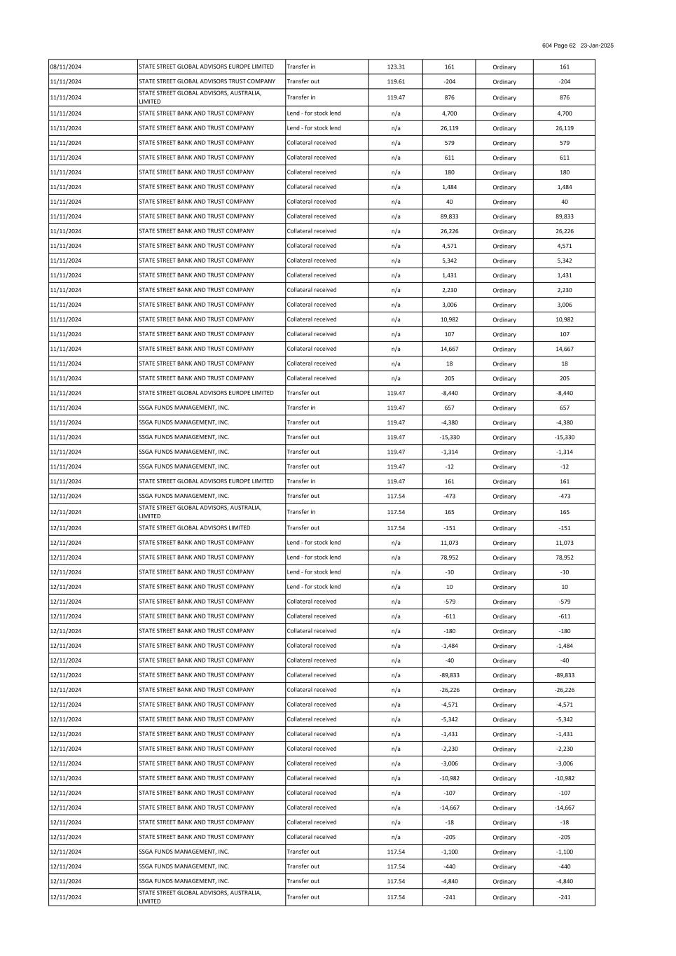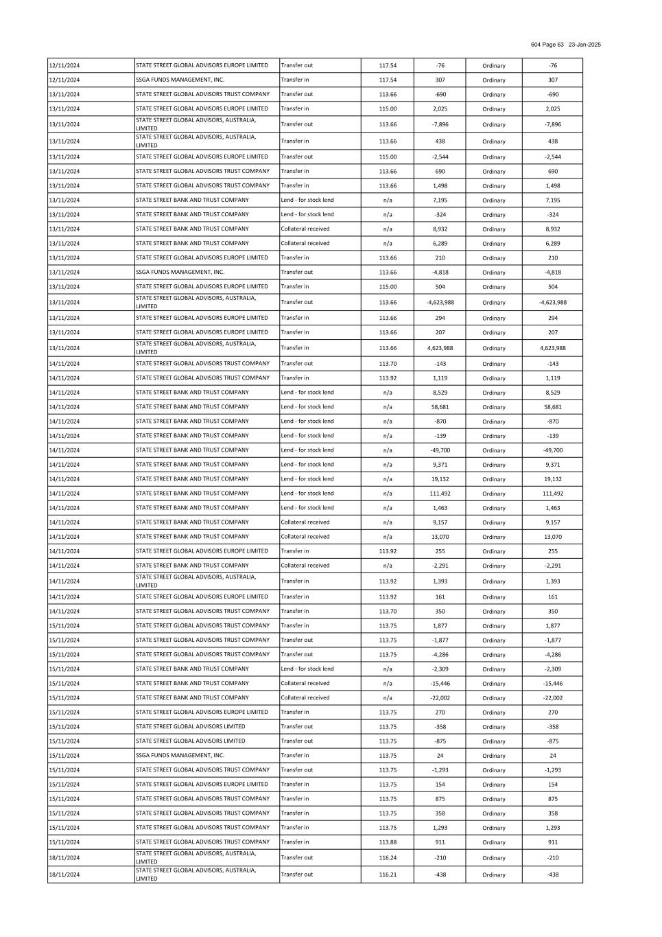 604 Page 62 23-Jan-2025 08/11/2024 123.31 161 Ordinary 161 11/11/2024 119.61 -204 Ordinary -204 11/11/2024 119.47 876 Ordinary 876 11/11/2024 n/a 4,700 Ordinary 4,700 11/11/2024 n/a 26,119 Ordinary 26,119 11/11/2024 n/a 579 Ordinary 579 11/11/2024 n/a 611 Ordinary 611 11/11/2024 n/a 180 Ordinary 180 11/11/2024 n/a 1,484 Ordinary 1,484 11/11/2024 n/a 40 Ordinary 40 11/11/2024 n/a 89,833 Ordinary 89,833 11/11/2024 n/a 26,226 Ordinary 26,226 11/11/2024 n/a 4,571 Ordinary 4,571 11/11/2024 n/a 5,342 Ordinary 5,342 11/11/2024 n/a 1,431 Ordinary 1,431 11/11/2024 n/a 2,230 Ordinary 2,230 11/11/2024 n/a 3,006 Ordinary 3,006 11/11/2024 n/a 10,982 Ordinary 10,982 11/11/2024 n/a 107 Ordinary 107 11/11/2024 n/a 14,667 Ordinary 14,667 11/11/2024 n/a 18 Ordinary 18 11/11/2024 n/a 205 Ordinary 205 11/11/2024 119.47 -8,440 Ordinary -8,440 11/11/2024 119.47 657 Ordinary 657 11/11/2024 119.47 -4,380 Ordinary -4,380 11/11/2024 119.47 -15,330 Ordinary -15,330 11/11/2024 119.47 -1,314 Ordinary -1,314 11/11/2024 119.47 -12 Ordinary -12 11/11/2024 119.47 161 Ordinary 161 12/11/2024 117.54 -473 Ordinary -473 12/11/2024 117.54 165 Ordinary 165 12/11/2024 117.54 -151 Ordinary -151 12/11/2024 n/a 11,073 Ordinary 11,073 12/11/2024 n/a 78,952 Ordinary 78,952 12/11/2024 n/a -10 Ordinary -10 12/11/2024 n/a 10 Ordinary 10 12/11/2024 n/a -579 Ordinary -579 12/11/2024 n/a -611 Ordinary -611 12/11/2024 n/a -180 Ordinary -180 12/11/2024 n/a -1,484 Ordinary -1,484 12/11/2024 n/a -40 Ordinary -40 12/11/2024 n/a -89,833 Ordinary -89,833 12/11/2024 n/a -26,226 Ordinary -26,226 12/11/2024 n/a -4,571 Ordinary -4,571 12/11/2024 n/a -5,342 Ordinary -5,342 12/11/2024 n/a -1,431 Ordinary -1,431 12/11/2024 n/a -2,230 Ordinary -2,230 12/11/2024 n/a -3,006 Ordinary -3,006 12/11/2024 n/a -10,982 Ordinary -10,982 12/11/2024 n/a -107 Ordinary -107 12/11/2024 n/a -14,667 Ordinary -14,667 12/11/2024 n/a -18 Ordinary -18 12/11/2024 n/a -205 Ordinary -205 12/11/2024 117.54 -1,100 Ordinary -1,100 12/11/2024 117.54 -440 Ordinary -440 12/11/2024 117.54 -4,840 Ordinary -4,840 12/11/2024 117.54 -241 Ordinary -241 STATE STREET BANK AND TRUST COMPANY Transfer out STATE STREET BANK AND TRUST COMPANY Transfer out Collateral received STATE STREET BANK AND TRUST COMPANY STATE STREET GLOBAL ADVISORS LIMITED Collateral received STATE STREET BANK AND TRUST COMPANY STATE STREET BANK AND TRUST COMPANY Collateral received SSGA FUNDS MANAGEMENT, INC. Lend - for stock lend STATE STREET BANK AND TRUST COMPANY Collateral received STATE STREET BANK AND TRUST COMPANY Transfer out SSGA FUNDS MANAGEMENT, INC. STATE STREET BANK AND TRUST COMPANY STATE STREET BANK AND TRUST COMPANY Lend - for stock lend Collateral received SSGA FUNDS MANAGEMENT, INC. Collateral received Collateral received STATE STREET BANK AND TRUST COMPANY Collateral received SSGA FUNDS MANAGEMENT, INC. SSGA FUNDS MANAGEMENT, INC. Collateral received STATE STREET BANK AND TRUST COMPANY Collateral received Collateral received STATE STREET BANK AND TRUST COMPANY Transfer in Collateral received STATE STREET BANK AND TRUST COMPANY Transfer in STATE STREET BANK AND TRUST COMPANY STATE STREET BANK AND TRUST COMPANY STATE STREET GLOBAL ADVISORS EUROPE LIMITED Collateral received Transfer out STATE STREET BANK AND TRUST COMPANY Collateral received STATE STREET BANK AND TRUST COMPANY STATE STREET GLOBAL ADVISORS EUROPE LIMITED Transfer out STATE STREET BANK AND TRUST COMPANY Collateral received Transfer out STATE STREET BANK AND TRUST COMPANY STATE STREET BANK AND TRUST COMPANY Collateral received Transfer in Transfer in STATE STREET BANK AND TRUST COMPANY STATE STREET BANK AND TRUST COMPANY Collateral received Transfer out Lend - for stock lend STATE STREET BANK AND TRUST COMPANY STATE STREET BANK AND TRUST COMPANY Lend - for stock lend STATE STREET BANK AND TRUST COMPANY STATE STREET GLOBAL ADVISORS EUROPE LIMITED Collateral received Collateral received STATE STREET BANK AND TRUST COMPANY Collateral receivedSTATE STREET BANK AND TRUST COMPANY Collateral received SSGA FUNDS MANAGEMENT, INC. Collateral received Collateral received Collateral received STATE STREET GLOBAL ADVISORS, AUSTRALIA, LIMITED Transfer in STATE STREET BANK AND TRUST COMPANY STATE STREET GLOBAL ADVISORS TRUST COMPANY STATE STREET BANK AND TRUST COMPANY STATE STREET BANK AND TRUST COMPANY Collateral receivedSTATE STREET BANK AND TRUST COMPANY SSGA FUNDS MANAGEMENT, INC. Collateral received Collateral received Collateral received STATE STREET GLOBAL ADVISORS, AUSTRALIA, LIMITED Transfer out STATE STREET BANK AND TRUST COMPANY SSGA FUNDS MANAGEMENT, INC. Collateral received Lend - for stock lend STATE STREET BANK AND TRUST COMPANY STATE STREET BANK AND TRUST COMPANY Collateral received Transfer out STATE STREET BANK AND TRUST COMPANY Transfer outSSGA FUNDS MANAGEMENT, INC. Collateral received Lend - for stock lend STATE STREET BANK AND TRUST COMPANY STATE STREET BANK AND TRUST COMPANY Collateral received Transfer out Collateral received STATE STREET BANK AND TRUST COMPANY Transfer out STATE STREET BANK AND TRUST COMPANY STATE STREET BANK AND TRUST COMPANY STATE STREET GLOBAL ADVISORS, AUSTRALIA, LIMITED Collateral received