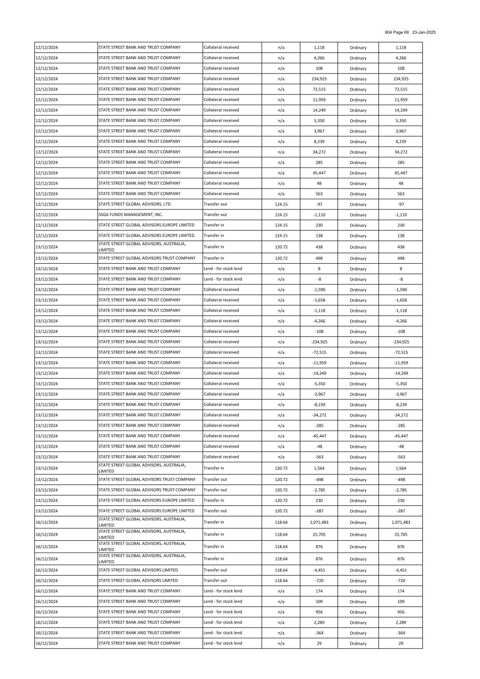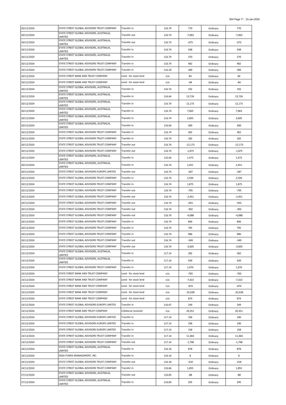 604 Page 69 23-Jan-2025 12/12/2024 n/a 1,118 Ordinary 1,118 12/12/2024 n/a 4,266 Ordinary 4,266 12/12/2024 n/a 108 Ordinary 108 12/12/2024 n/a 234,925 Ordinary 234,925 12/12/2024 n/a 72,515 Ordinary 72,515 12/12/2024 n/a 11,959 Ordinary 11,959 12/12/2024 n/a 14,249 Ordinary 14,249 12/12/2024 n/a 5,350 Ordinary 5,350 12/12/2024 n/a 3,967 Ordinary 3,967 12/12/2024 n/a 8,239 Ordinary 8,239 12/12/2024 n/a 34,272 Ordinary 34,272 12/12/2024 n/a 285 Ordinary 285 12/12/2024 n/a 45,447 Ordinary 45,447 12/12/2024 n/a 48 Ordinary 48 12/12/2024 n/a 563 Ordinary 563 12/12/2024 124.15 -97 Ordinary -97 12/12/2024 124.15 -1,110 Ordinary -1,110 12/12/2024 124.15 230 Ordinary 230 12/12/2024 124.15 138 Ordinary 138 13/12/2024 120.72 438 Ordinary 438 13/12/2024 120.72 498 Ordinary 498 13/12/2024 n/a 8 Ordinary 8 13/12/2024 n/a -8 Ordinary -8 13/12/2024 n/a -1,590 Ordinary -1,590 13/12/2024 n/a -1,658 Ordinary -1,658 13/12/2024 n/a -1,118 Ordinary -1,118 13/12/2024 n/a -4,266 Ordinary -4,266 13/12/2024 n/a -108 Ordinary -108 13/12/2024 n/a -234,925 Ordinary -234,925 13/12/2024 n/a -72,515 Ordinary -72,515 13/12/2024 n/a -11,959 Ordinary -11,959 13/12/2024 n/a -14,249 Ordinary -14,249 13/12/2024 n/a -5,350 Ordinary -5,350 13/12/2024 n/a -3,967 Ordinary -3,967 13/12/2024 n/a -8,239 Ordinary -8,239 13/12/2024 n/a -34,272 Ordinary -34,272 13/12/2024 n/a -285 Ordinary -285 13/12/2024 n/a -45,447 Ordinary -45,447 13/12/2024 n/a -48 Ordinary -48 13/12/2024 n/a -563 Ordinary -563 13/12/2024 120.72 1,564 Ordinary 1,564 13/12/2024 120.72 -498 Ordinary -498 13/12/2024 120.72 -2,785 Ordinary -2,785 13/12/2024 120.72 230 Ordinary 230 13/12/2024 120.72 -287 Ordinary -287 16/12/2024 118.64 1,071,483 Ordinary 1,071,483 16/12/2024 118.64 25,705 Ordinary 25,705 16/12/2024 118.64 876 Ordinary 876 16/12/2024 118.64 876 Ordinary 876 16/12/2024 118.64 -4,451 Ordinary -4,451 16/12/2024 118.64 -720 Ordinary -720 16/12/2024 n/a 174 Ordinary 174 16/12/2024 n/a 109 Ordinary 109 16/12/2024 n/a 956 Ordinary 956 16/12/2024 n/a 2,289 Ordinary 2,289 16/12/2024 n/a -364 Ordinary -364 16/12/2024 n/a 29 Ordinary 29 Collateral received STATE STREET GLOBAL ADVISORS, AUSTRALIA, LIMITED STATE STREET BANK AND TRUST COMPANY Transfer out Transfer in STATE STREET BANK AND TRUST COMPANY Collateral received STATE STREET BANK AND TRUST COMPANY STATE STREET BANK AND TRUST COMPANY Lend - for stock lend Collateral received STATE STREET BANK AND TRUST COMPANY Collateral received STATE STREET BANK AND TRUST COMPANY Transfer out STATE STREET BANK AND TRUST COMPANY Lend - for stock lend STATE STREET BANK AND TRUST COMPANY Collateral received STATE STREET BANK AND TRUST COMPANY STATE STREET GLOBAL ADVISORS TRUST COMPANY STATE STREET BANK AND TRUST COMPANY Transfer in Collateral received STATE STREET BANK AND TRUST COMPANY Transfer in STATE STREET GLOBAL ADVISORS, AUSTRALIA, LIMITED STATE STREET BANK AND TRUST COMPANY Collateral received STATE STREET GLOBAL ADVISORS, LTD. Collateral received Transfer out STATE STREET BANK AND TRUST COMPANY STATE STREET GLOBAL ADVISORS EUROPE LIMITED Lend - for stock lend STATE STREET BANK AND TRUST COMPANY Collateral received STATE STREET BANK AND TRUST COMPANY Transfer out STATE STREET BANK AND TRUST COMPANY Collateral received Collateral received STATE STREET GLOBAL ADVISORS TRUST COMPANY STATE STREET BANK AND TRUST COMPANY Collateral received Transfer out Collateral received STATE STREET GLOBAL ADVISORS TRUST COMPANY STATE STREET BANK AND TRUST COMPANY Collateral received STATE STREET GLOBAL ADVISORS, AUSTRALIA, LIMITED STATE STREET BANK AND TRUST COMPANY Lend - for stock lend Transfer out Collateral received STATE STREET BANK AND TRUST COMPANY Lend - for stock lend Collateral received Collateral received STATE STREET BANK AND TRUST COMPANY STATE STREET BANK AND TRUST COMPANY Transfer in Collateral received STATE STREET GLOBAL ADVISORS LIMITED STATE STREET BANK AND TRUST COMPANY STATE STREET BANK AND TRUST COMPANY Transfer in Collateral received Transfer in STATE STREET BANK AND TRUST COMPANY STATE STREET GLOBAL ADVISORS LIMITED STATE STREET BANK AND TRUST COMPANY Collateral received Transfer in STATE STREET BANK AND TRUST COMPANY Lend - for stock lend Collateral received STATE STREET BANK AND TRUST COMPANY Transfer in Collateral received SSGA FUNDS MANAGEMENT, INC. STATE STREET BANK AND TRUST COMPANY Collateral received STATE STREET BANK AND TRUST COMPANY STATE STREET GLOBAL ADVISORS EUROPE LIMITED STATE STREET BANK AND TRUST COMPANY Transfer in STATE STREET GLOBAL ADVISORS, AUSTRALIA, LIMITED Collateral received STATE STREET BANK AND TRUST COMPANY Transfer in STATE STREET GLOBAL ADVISORS EUROPE LIMITED Collateral received STATE STREET GLOBAL ADVISORS EUROPE LIMITED STATE STREET BANK AND TRUST COMPANY Collateral received STATE STREET GLOBAL ADVISORS, AUSTRALIA, LIMITED STATE STREET BANK AND TRUST COMPANY Collateral received Collateral received Lend - for stock lend STATE STREET BANK AND TRUST COMPANY STATE STREET GLOBAL ADVISORS, AUSTRALIA, LIMITED Collateral received STATE STREET BANK AND TRUST COMPANY Collateral received STATE STREET BANK AND TRUST COMPANY Lend - for stock lend STATE STREET BANK AND TRUST COMPANY Collateral received Transfer out STATE STREET BANK AND TRUST COMPANY Collateral received STATE STREET BANK AND TRUST COMPANY