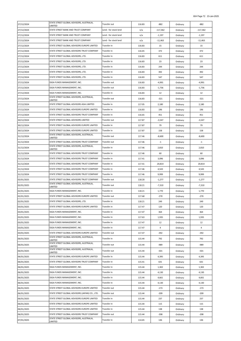 604 Page 72 23-Jan-2025 27/12/2024 116.83 -882 Ordinary -882 27/12/2024 n/a -117,362 Ordinary -117,362 27/12/2024 n/a -1,197 Ordinary -1,197 27/12/2024 n/a -11,463 Ordinary -11,463 27/12/2024 116.83 15 Ordinary 15 27/12/2024 116.65 372 Ordinary 372 27/12/2024 116.83 611 Ordinary 611 27/12/2024 116.83 23 Ordinary 23 27/12/2024 116.83 244 Ordinary 244 27/12/2024 116.83 392 Ordinary 392 27/12/2024 116.83 547 Ordinary 547 27/12/2024 116.83 -4,991 Ordinary -4,991 27/12/2024 116.83 -1,736 Ordinary -1,736 27/12/2024 116.83 12 Ordinary 12 27/12/2024 116.83 -321 Ordinary -321 27/12/2024 117.05 2,180 Ordinary 2,180 27/12/2024 116.83 196 Ordinary 196 27/12/2024 116.65 451 Ordinary 451 30/12/2024 117.87 -3,547 Ordinary -3,547 30/12/2024 117.87 79 Ordinary 79 30/12/2024 117.87 158 Ordinary 158 31/12/2024 117.46 -8,600 Ordinary -8,600 31/12/2024 117.46 -1 Ordinary -1 31/12/2024 117.46 2,810 Ordinary 2,810 31/12/2024 117.46 60 Ordinary 60 31/12/2024 117.41 3,096 Ordinary 3,096 31/12/2024 117.41 20,814 Ordinary 20,814 31/12/2024 117.46 4,543 Ordinary 4,543 31/12/2024 117.46 9,999 Ordinary 9,999 02/01/2025 118.20 -1,277 Ordinary -1,277 02/01/2025 118.21 -7,310 Ordinary -7,310 02/01/2025 118.21 1,770 Ordinary 1,770 02/01/2025 117.68 -270 Ordinary -270 02/01/2025 118.21 249 Ordinary 249 03/01/2025 117.47 120 Ordinary 120 03/01/2025 117.47 364 Ordinary 364 03/01/2025 117.63 1,935 Ordinary 1,935 03/01/2025 117.47 12 Ordinary 12 03/01/2025 117.47 4 Ordinary 4 03/01/2025 117.47 -392 Ordinary -392 06/01/2025 115.44 792 Ordinary 792 06/01/2025 115.44 -989 Ordinary -989 06/01/2025 115.44 -501 Ordinary -501 06/01/2025 115.44 4,395 Ordinary 4,395 06/01/2025 115.41 631 Ordinary 631 06/01/2025 115.44 1,302 Ordinary 1,302 06/01/2025 115.44 4,130 Ordinary 4,130 06/01/2025 115.44 4,661 Ordinary 4,661 06/01/2025 115.44 4,130 Ordinary 4,130 06/01/2025 115.44 -173 Ordinary -173 06/01/2025 115.44 -209 Ordinary -209 06/01/2025 115.44 237 Ordinary 237 06/01/2025 115.44 115 Ordinary 115 06/01/2025 115.44 138 Ordinary 138 06/01/2025 115.44 -208 Ordinary -208 07/01/2025 114.65 136 Ordinary 136 STATE STREET GLOBAL ADVISORS TRUST COMPANY Transfer in Transfer in STATE STREET GLOBAL ADVISORS LIMITED STATE STREET GLOBAL ADVISORS, LTD. SSGA FUNDS MANAGEMENT, INC. Transfer out Transfer in Transfer in Lend - for stock lend SSGA FUNDS MANAGEMENT, INC. STATE STREET GLOBAL ADVISORS TRUST COMPANY SSGA FUNDS MANAGEMENT, INC. Transfer out Transfer in Transfer in SSGA FUNDS MANAGEMENT, INC. STATE STREET GLOBAL ADVISORS EUROPE LIMITED Lend - for stock lend STATE STREET GLOBAL ADVISORS, AUSTRALIA, LIMITED Transfer out Transfer out STATE STREET GLOBAL ADVISORS EUROPE LIMITED SSGA FUNDS MANAGEMENT, INC. Transfer in STATE STREET BANK AND TRUST COMPANY STATE STREET GLOBAL ADVISORS, AUSTRALIA, LIMITED Transfer in SSGA FUNDS MANAGEMENT, INC. Transfer out Transfer in STATE STREET GLOBAL ADVISORS TRUST COMPANY STATE STREET GLOBAL ADVISORS, AUSTRALIA, LIMITED Transfer out Transfer in STATE STREET BANK AND TRUST COMPANY Transfer out STATE STREET GLOBAL ADVISORS, AUSTRALIA, LIMITED STATE STREET GLOBAL ADVISORS EUROPE LIMITED Transfer out Transfer in SSGA FUNDS MANAGEMENT, INC. Transfer in Transfer in STATE STREET GLOBAL ADVISORS EUROPE LIMITED STATE STREET BANK AND TRUST COMPANY Transfer in Transfer in STATE STREET GLOBAL ADVISORS, AUSTRALIA, LIMITED STATE STREET GLOBAL ADVISORS, AUSTRALIA, LIMITED STATE STREET GLOBAL ADVISORS EUROPE LIMITED Transfer in Transfer in SSGA FUNDS MANAGEMENT, INC. STATE STREET GLOBAL ADVISORS, LTD. Transfer in STATE STREET GLOBAL ADVISORS EUROPE LIMITED STATE STREET GLOBAL ADVISORS EUROPE LIMITED Transfer out Transfer out STATE STREET GLOBAL ADVISORS EUROPE LIMITED Transfer out Transfer out Transfer in Transfer out STATE STREET GLOBAL ADVISORS, AUSTRALIA, LIMITED STATE STREET GLOBAL ADVISORS, LTD. Transfer in STATE STREET GLOBAL ADVISORS EUROPE LIMITED STATE STREET GLOBAL ADVISORS EUROPE LIMITED Transfer inSSGA FUNDS MANAGEMENT, INC. STATE STREET GLOBAL ADVISORS, LTD. Transfer in STATE STREET GLOBAL ADVISORS TRUST COMPANY SSGA FUNDS MANAGEMENT, INC. Transfer in Transfer in STATE STREET GLOBAL ADVISORS TRUST COMPANY Transfer in STATE STREET GLOBAL ADVISORS ASIA LIMITED SSGA FUNDS MANAGEMENT, INC. SSGA FUNDS MANAGEMENT, INC. Transfer in Transfer in STATE STREET GLOBAL ADVISORS (JAPAN) CO., LTD. Transfer out Transfer out STATE STREET GLOBAL ADVISORS, AUSTRALIA, LIMITED Transfer in STATE STREET GLOBAL ADVISORS EUROPE LIMITED STATE STREET GLOBAL ADVISORS TRUST COMPANY STATE STREET GLOBAL ADVISORS TRUST COMPANY Transfer in Transfer in STATE STREET GLOBAL ADVISORS, LTD. Transfer in Transfer in Transfer in STATE STREET GLOBAL ADVISORS TRUST COMPANY Transfer in STATE STREET GLOBAL ADVISORS, AUSTRALIA, LIMITED STATE STREET GLOBAL ADVISORS EUROPE LIMITED STATE STREET GLOBAL ADVISORS TRUST COMPANY Transfer in STATE STREET GLOBAL ADVISORS TRUST COMPANY Transfer out Lend - for stock lend Transfer in STATE STREET GLOBAL ADVISORS, LTD. Transfer in STATE STREET GLOBAL ADVISORS TRUST COMPANY