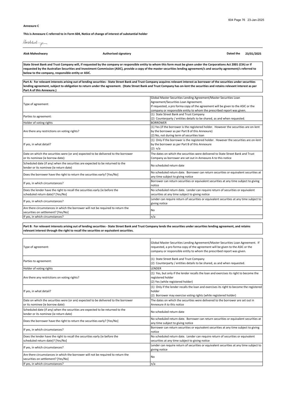 604 Page 76 23-Jan-2025 Annexure C This is Annexure C referred to in Form 604, Notice of change of interest of substantial holder 23/01/2025 Does the lender have the right to recall the securities early (ie before the scheduled return date)? [Yes/No] No scheduled return date. Lender can require return of securities or equivalent securities at any time subject to giving notice If yes, in which circumstances? Lender can require return of securities or equivalent securities at any time subject to giving notice Are there circumstances in which the borrower will not be required to return the securities on settlement? [Yes/No] No If yes, in which circumstances? n/a Scheduled date (if any) when the securities are expected to be returned to the lender or its nominee (ie return date) No scheduled return date Does the borrower have the right to return the securities early? [Yes/No] No scheduled return date. Borrower can return securities or equivalent securities at any time subject to giving notice If yes, in which circumstances? Borrower can return securities or equivalent securities at any time subject to giving notice Are there any restrictions on voting rights? (1) Yes, but only if the lender recalls the loan and exercises its right to become the registered holder (2) Yes (while registered holder) If yes, in what detail? (1) Only if the lender recalls the loan and exercises its right to become the registered holder (2) Borrower may exercise voting rights (while registered holder) Date on which the securities were (or are) expected to be delivered to the borrower or its nominee (ie borrow date): The dates on which the securities were delivered to the borrower are set out in Annexure A to this notice Holder of voting rights LENDER If yes, in which circumstances? Lender can require return of securities or equivalent securities at any time subject to giving notice Are there circumstances in which the borrower will not be required to return the securities on settlement? [Yes/No] No If yes, in which circumstances? n/a Part B: For relevant interests arising out of lending securities - State Street Bank and Trust Company lends the securities under securities lending agreement, and retains relevant interest through the right to recall the securities or equivalent securities. Type of agreement: Global Master Securities Lending Agreement/Master Securities Loan Agreement. If requested, a pro forma copy of the agreement will be given to the ASIC or the company or responsible entity to whom the prescribed report was given. Parties to agreement: (1) State Street Bank and Trust Company (2) Counterparty / entities details to be shared, as and when requested. Does the borrower have the right to return the securities early? [Yes/No] No scheduled return date. Borrower can return securities or equivalent securities at any time subject to giving notice If yes, in which circumstances? Borrower can return securities or equivalent securities at any time subject to giving notice Does the lender have the right to recall the securities early (ie before the scheduled return date)? [Yes/No] No scheduled return date. Lender can require return of securities or equivalent securities at any time subject to giving notice If yes, in what detail? (1) Only if the borrower is the registered holder. However the securities are on-lent by the borrower as per Part B of this Annexure (2) n/a Date on which the securities were (or are) expected to be delivered to the borrower or its nominee (ie borrow date): The dates on which the securities were delivered to State Street Bank and Trust Company as borrower are set out in Annexure A to this notice Scheduled date (if any) when the securities are expected to be returned to the lender or its nominee (ie return date) No scheduled return date Parties to agreement: (1) State Street Bank and Trust Company (2) Counterparty / entities details to be shared, as and when requested. Holder of voting rights BORROWER Are there any restrictions on voting rights? (1) Yes (if the borrower is the registered holder. However the securities are on-lent by the borrower as per Part B of this Annexure) (2) No, not during term of securities loan Type of agreement: Global Master Securities Lending Agreement/Master Securities Loan Agreement/Securities Loan Agreement. If requested, a pro forma copy of the agreement will be given to the ASIC or the company or responsible entity to whom the prescribed report was given. Alok Maheshwary Authorised signatory Dated the State Street Bank and Trust Company will, if requested by the company or responsible entity to whom this form must be given under the Corporations Act 2001 (Cth) or if requested by the Australian Securities and Investment Commission (ASIC), provide a copy of the master securities lending agreement/s and security agreement/s referred to below to the company, responsible entity or ASIC. Part A: For relevant interests arising out of lending securities - State Street Bank and Trust Company acquires relevant interest as borrower of the securities under securities lending agreement, subject to obligation to return under the agreement. (State Street Bank and Trust Company has on-lent the securities and retains relevant interest as per Part A of this Annexure.)
