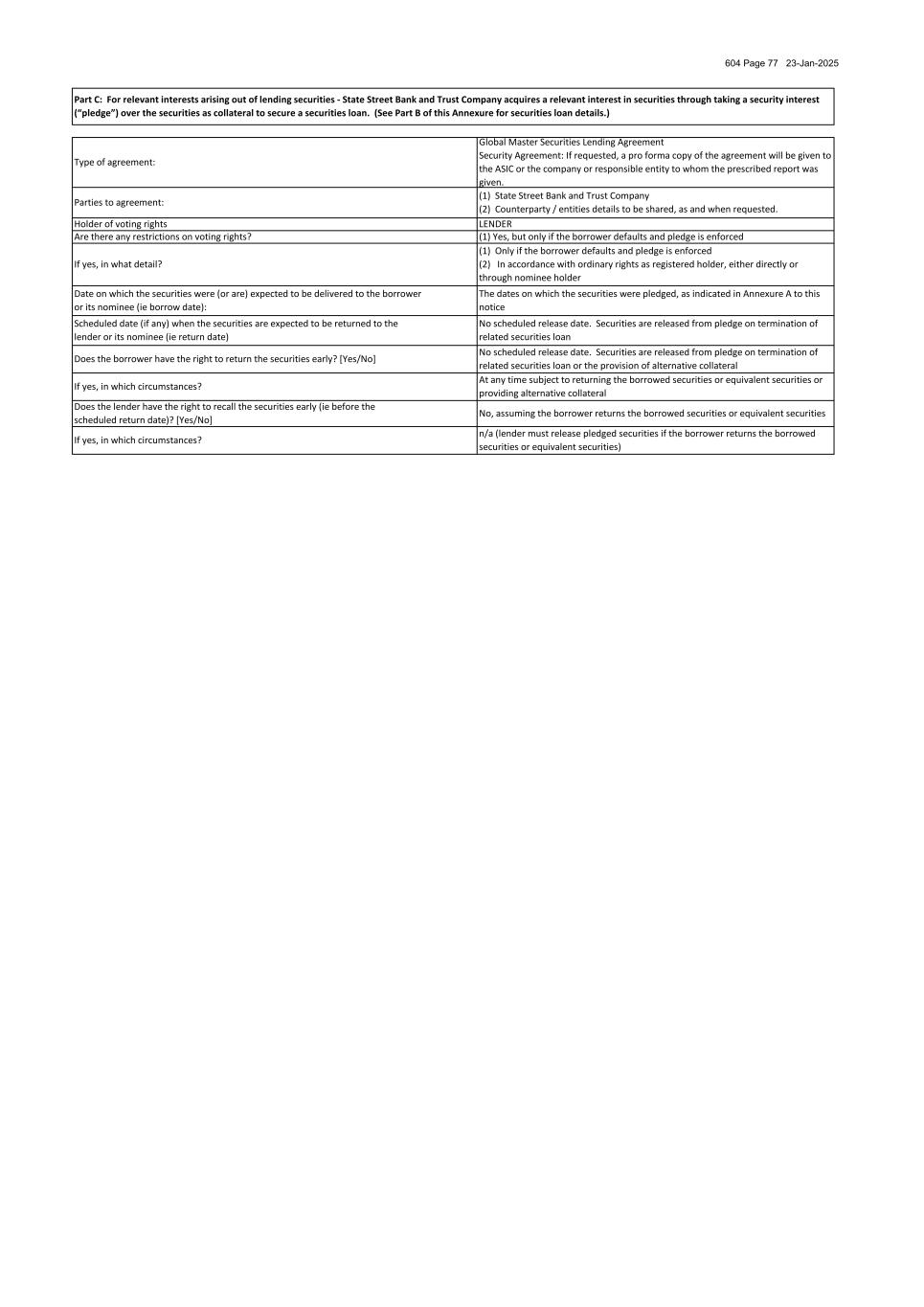 604 Page 77 23-Jan-2025 If yes, in which circumstances? At any time subject to returning the borrowed securities or equivalent securities or providing alternative collateral Does the lender have the right to recall the securities early (ie before the scheduled return date)? [Yes/No] No, assuming the borrower returns the borrowed securities or equivalent securities If yes, in which circumstances? n/a (lender must release pledged securities if the borrower returns the borrowed securities or equivalent securities) Date on which the securities were (or are) expected to be delivered to the borrower or its nominee (ie borrow date): The dates on which the securities were pledged, as indicated in Annexure A to this notice Scheduled date (if any) when the securities are expected to be returned to the lender or its nominee (ie return date) No scheduled release date. Securities are released from pledge on termination of related securities loan Does the borrower have the right to return the securities early? [Yes/No] No scheduled release date. Securities are released from pledge on termination of related securities loan or the provision of alternative collateral Holder of voting rights LENDER Are there any restrictions on voting rights? (1) Yes, but only if the borrower defaults and pledge is enforced If yes, in what detail? (1) Only if the borrower defaults and pledge is enforced (2) In accordance with ordinary rights as registered holder, either directly or through nominee holder Parties to agreement: (1) State Street Bank and Trust Company (2) Counterparty / entities details to be shared, as and when requested. Part C: For relevant interests arising out of lending securities - State Street Bank and Trust Company acquires a relevant interest in securities through taking a security interest (“pledge”) over the securities as collateral to secure a securities loan. (See Part B of this Annexure for securities loan details.) Type of agreement: Global Master Securities Lending Agreement Security Agreement: If requested, a pro forma copy of the agreement will be given to the ASIC or the company or responsible entity to whom the prescribed report was given.
