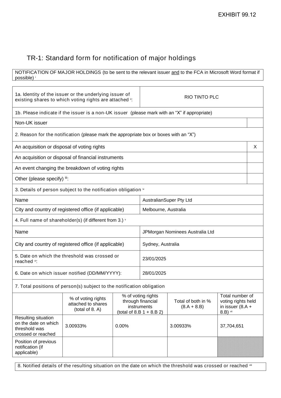 TR-1: Standard form for notification of major holdings NOTIFICATION OF MAJOR HOLDINGS (to be sent to the relevant issuer and to the FCA in Microsoft Word format if possible) i 1a. Identity of the issuer or the underlying issuer of existing shares to which voting rights are attached ii: RIO TINTO PLC 1b. Please indicate if the issuer is a non-UK issuer (please mark with an “X” if appropriate) Non-UK issuer 2. Reason for the notification (please mark the appropriate box or boxes with an “X”) An acquisition or disposal of voting rights X An acquisition or disposal of financial instruments An event changing the breakdown of voting rights Other (please specify) iii: 3. Details of person subject to the notification obligation iv Name AustralianSuper Pty Ltd City and country of registered office (if applicable) Melbourne, Australia 4. Full name of shareholder(s) (if different from 3.) v Name JPMorgan Nominees Australia Ltd City and country of registered office (if applicable) Sydney, Australia 5. Date on which the threshold was crossed or reached vi: 23/01/2025 6. Date on which issuer notified (DD/MM/YYYY): 28/01/2025 7. Total positions of person(s) subject to the notification obligation % of voting rights attached to shares (total of 8. A) % of voting rights through financial instruments (total of 8.B 1 + 8.B 2) Total of both in % (8.A + 8.B) Total number of voting rights held in issuer (8.A + 8.B) vii Resulting situation on the date on which threshold was crossed or reached 3.00933% 0.00% 3.00933% 37,704,651 Position of previous notification (if applicable) 8. Notified details of the resulting situation on the date on which the threshold was crossed or reached viii EXHIBIT 99.12