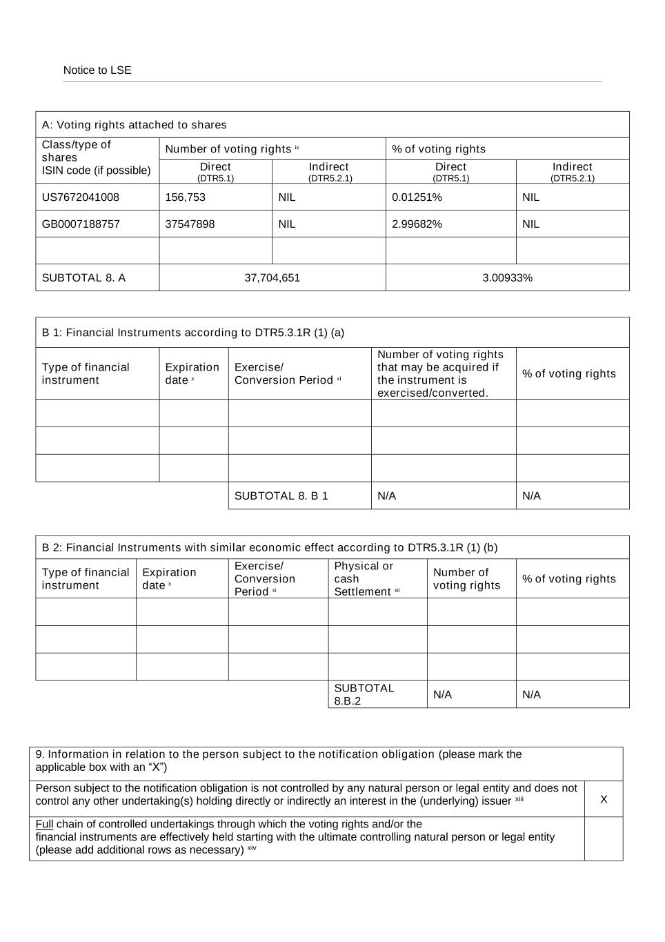 Notice to LSE A: Voting rights attached to shares Class/type of shares ISIN code (if possible) Number of voting rights ix % of voting rights Direct (DTR5.1) Indirect (DTR5.2.1) Direct (DTR5.1) Indirect (DTR5.2.1) US7672041008 156,753 NIL 0.01251% NIL GB0007188757 37547898 NIL 2.99682% NIL SUBTOTAL 8. A 37,704,651 3.00933% B 1: Financial Instruments according to DTR5.3.1R (1) (a) Type of financial instrument Expiration date x Exercise/ Conversion Period xi Number of voting rights that may be acquired if the instrument is exercised/converted. % of voting rights SUBTOTAL 8. B 1 N/A N/A B 2: Financial Instruments with similar economic effect according to DTR5.3.1R (1) (b) Type of financial instrument Expiration date x Exercise/ Conversion Period xi Physical or cash Settlement xii Number of voting rights % of voting rights SUBTOTAL 8.B.2 N/A N/A 9. Information in relation to the person subject to the notification obligation (please mark the applicable box with an “X”) Person subject to the notification obligation is not controlled by any natural person or legal entity and does not control any other undertaking(s) holding directly or indirectly an interest in the (underlying) issuer xiii X Full chain of controlled undertakings through which the voting rights and/or the financial instruments are effectively held starting with the ultimate controlling natural person or legal entity (please add additional rows as necessary) xiv