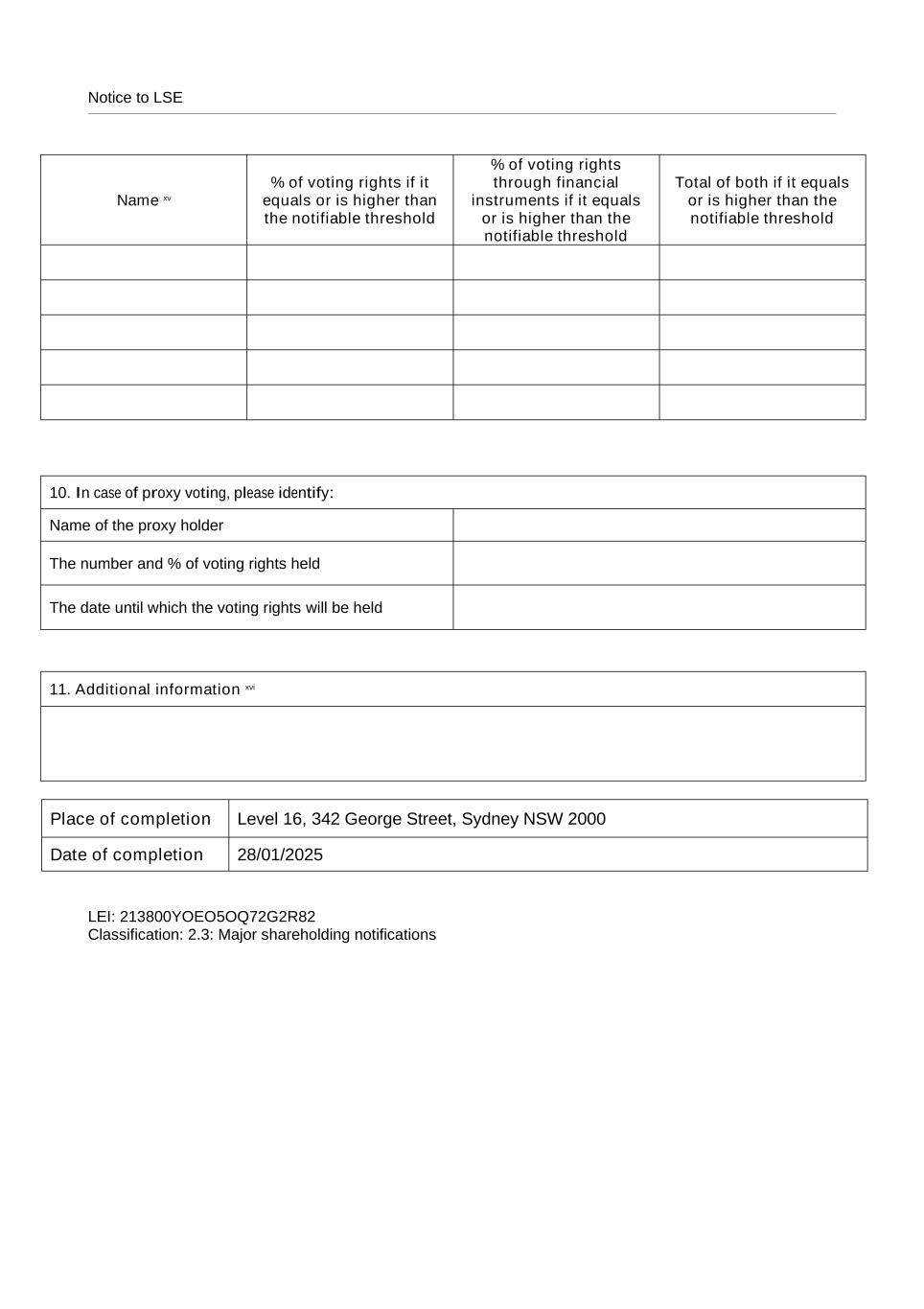 Notice to LSE Name xv % of voting rights if it equals or is higher than the notifiable threshold % of voting rights through financial instruments if it equals or is higher than the notifiable threshold Total of both if it equals or is higher than the notifiable threshold 10. In case of proxy voting, please identify: Name of the proxy holder The number and % of voting rights held The date until which the voting rights will be held 11. Additional information xvi Place of completion Level 16, 342 George Street, Sydney NSW 2000 Date of completion 28/01/2025 LEI: 213800YOEO5OQ72G2R82 Classification: 2.3: Major shareholding notifications