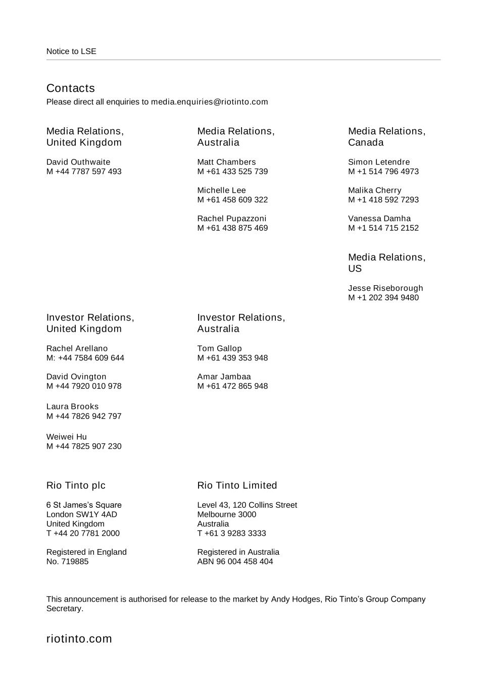 Notice to LSE Contacts Please direct all enquiries to media.enquiries@riotinto.com Media Relations, United Kingdom David Outhwaite M +44 7787 597 493 Media Relations, Australia Matt Chambers M +61 433 525 739 Michelle Lee M +61 458 609 322 Rachel Pupazzoni M +61 438 875 469 Media Relations, Canada Simon Letendre M +1 514 796 4973 Malika Cherry M +1 418 592 7293 Vanessa Damha M +1 514 715 2152 Media Relations, US Jesse Riseborough M +1 202 394 9480 Investor Relations, United Kingdom Rachel Arellano M: +44 7584 609 644 David Ovington M +44 7920 010 978 Laura Brooks M +44 7826 942 797 Weiwei Hu M +44 7825 907 230 Investor Relations, Australia Tom Gallop M +61 439 353 948 Amar Jambaa M +61 472 865 948 Rio Tinto plc 6 St James’s Square London SW1Y 4AD United Kingdom T +44 20 7781 2000 Registered in England No. 719885 Rio Tinto Limited Level 43, 120 Collins Street Melbourne 3000 Australia T +61 3 9283 3333 Registered in Australia ABN 96 004 458 404 This announcement is authorised for release to the market by Andy Hodges, Rio Tinto’s Group Company Secretary. riotinto.com
