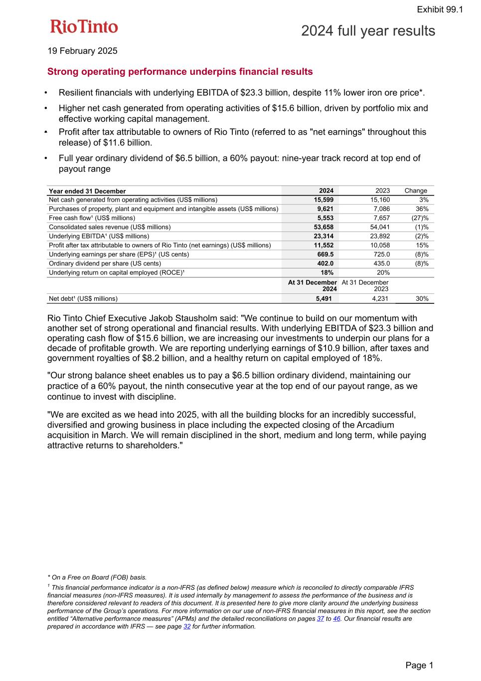 19 February 2025 Strong operating performance underpins financial results • Resilient financials with underlying EBITDA of $23.3 billion, despite 11% lower iron ore price*. • Higher net cash generated from operating activities of $15.6 billion, driven by portfolio mix and effective working capital management. • Profit after tax attributable to owners of Rio Tinto (referred to as "net earnings" throughout this release) of $11.6 billion. • Full year ordinary dividend of $6.5 billion, a 60% payout: nine-year track record at top end of payout range Year ended 31 December 2024 2023 Change Net cash generated from operating activities (US$ millions) 15,599 15,160 3 % Purchases of property, plant and equipment and intangible assets (US$ millions) 9,621 7,086 36 % Free cash flow¹ (US$ millions) 5,553 7,657 (27) % Consolidated sales revenue (US$ millions) 53,658 54,041 (1) % Underlying EBITDA¹ (US$ millions) 23,314 23,892 (2) % Profit after tax attributable to owners of Rio Tinto (net earnings) (US$ millions) 11,552 10,058 15 % Underlying earnings per share (EPS)¹ (US cents) 669.5 725.0 (8) % Ordinary dividend per share (US cents) 402.0 435.0 (8) % Underlying return on capital employed (ROCE)¹ 18% 20% At 31 December 2024 At 31 December 2023 Net debt¹ (US$ millions) 5,491 4,231 30 % Rio Tinto Chief Executive Jakob Stausholm said: "We continue to build on our momentum with another set of strong operational and financial results. With underlying EBITDA of $23.3 billion and operating cash flow of $15.6 billion, we are increasing our investments to underpin our plans for a decade of profitable growth. We are reporting underlying earnings of $10.9 billion, after taxes and government royalties of $8.2 billion, and a healthy return on capital employed of 18%. "Our strong balance sheet enables us to pay a $6.5 billion ordinary dividend, maintaining our practice of a 60% payout, the ninth consecutive year at the top end of our payout range, as we continue to invest with discipline. "We are excited as we head into 2025, with all the building blocks for an incredibly successful, diversified and growing business in place including the expected closing of the Arcadium acquisition in March. We will remain disciplined in the short, medium and long term, while paying attractive returns to shareholders." * On a Free on Board (FOB) basis. 1 This financial performance indicator is a non-IFRS (as defined below) measure which is reconciled to directly comparable IFRS financial measures (non-IFRS measures). It is used internally by management to assess the performance of the business and is therefore considered relevant to readers of this document. It is presented here to give more clarity around the underlying business performance of the Group’s operations. For more information on our use of non-IFRS financial measures in this report, see the section entitled “Alternative performance measures” (APMs) and the detailed reconciliations on pages 37 to 46. Our financial results are prepared in accordance with IFRS — see page 32 for further information. 2024 full year results Page 1 Exhibit 99.1
