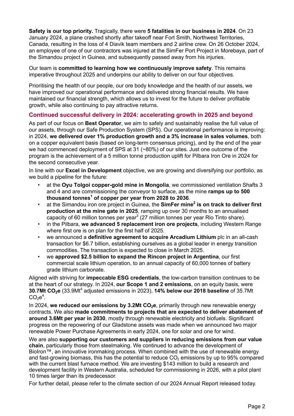 Safety is our top priority. Tragically, there were 5 fatalities in our business in 2024. On 23 January 2024, a plane crashed shortly after takeoff near Fort Smith, Northwest Territories, Canada, resulting in the loss of 4 Diavik team members and 2 airline crew. On 26 October 2024, an employee of one of our contractors was injured at the SimFer Port Project in Morebaya, part of the Simandou project in Guinea, and subsequently passed away from his injuries. Our team is committed to learning how we continuously improve safety. This remains imperative throughout 2025 and underpins our ability to deliver on our four objectives. Prioritising the health of our people, our ore body knowledge and the health of our assets, we have improved our operational performance and delivered strong financial results. We have maintained our financial strength, which allows us to invest for the future to deliver profitable growth, while also continuing to pay attractive returns. Continued successful delivery in 2024: accelerating growth in 2025 and beyond As part of our focus on Best Operator, we aim to safely and sustainably realise the full value of our assets, through our Safe Production System (SPS). Our operational performance is improving: in 2024, we delivered over 1% production growth and a 3% increase in sales volumes, both on a copper equivalent basis (based on long-term consensus pricing), and by the end of the year we had commenced deployment of SPS at 31 (~80%) of our sites. Just one outcome of the program is the achievement of a 5 million tonne production uplift for Pilbara Iron Ore in 2024 for the second consecutive year. In line with our Excel in Development objective, we are growing and diversifying our portfolio, as we build a pipeline for the future: • at the Oyu Tolgoi copper-gold mine in Mongolia, we commissioned ventilation Shafts 3 and 4 and are commissioning the conveyor to surface, as the mine ramps up to 500 thousand tonnes1 of copper per year from 2028 to 2036. • at the Simandou iron ore project in Guinea, the SimFer mine2 is on track to deliver first production at the mine gate in 2025, ramping up over 30 months to an annualised capacity of 60 million tonnes per year3 (27 million tonnes per year Rio Tinto share). • in the Pilbara, we advanced 5 replacement iron ore projects, including Western Range where first ore is on plan for the first half of 2025. • we announced a definitive agreement to acquire Arcadium Lithium plc in an all-cash transaction for $6.7 billion, establishing ourselves as a global leader in energy transition commodities. The transaction is expected to close in March 2025. • we approved $2.5 billion to expand the Rincon project in Argentina, our first commercial scale lithium operation, to an annual capacity of 60,000 tonnes of battery grade lithium carbonate. Aligned with striving for impeccable ESG credentials, the low-carbon transition continues to be at the heart of our strategy. In 2024, our Scope 1 and 2 emissions, on an equity basis, were 30.7Mt CO2e (33.9Mt4 adjusted emissions in 2023), 14% below our 2018 baseline of 35.7Mt CO2e4. In 2024, we reduced our emissions by 3.2Mt CO2e, primarily through new renewable energy contracts. We also made commitments to projects that are expected to deliver abatement of around 3.6Mt per year in 2030, mostly through renewable electricity and biofuels. Significant progress on the repowering of our Gladstone assets was made when we announced two major renewable Power Purchase Agreements in early 2024, one for solar and one for wind. We are also supporting our customers and suppliers in reducing emissions from our value chain, particularly those from steelmaking. We continued to advance the development of BioIron™, an innovative ironmaking process. When combined with the use of renewable energy and fast-growing biomass, this has the potential to reduce CO2 emissions by up to 95% compared with the current blast furnace method. We are investing $143 million to build a research and development facility in Western Australia, scheduled for commissioning in 2026, with a pilot plant 10 times larger than its predecessor. For further detail, please refer to the climate section of our 2024 Annual Report released today. Page 2