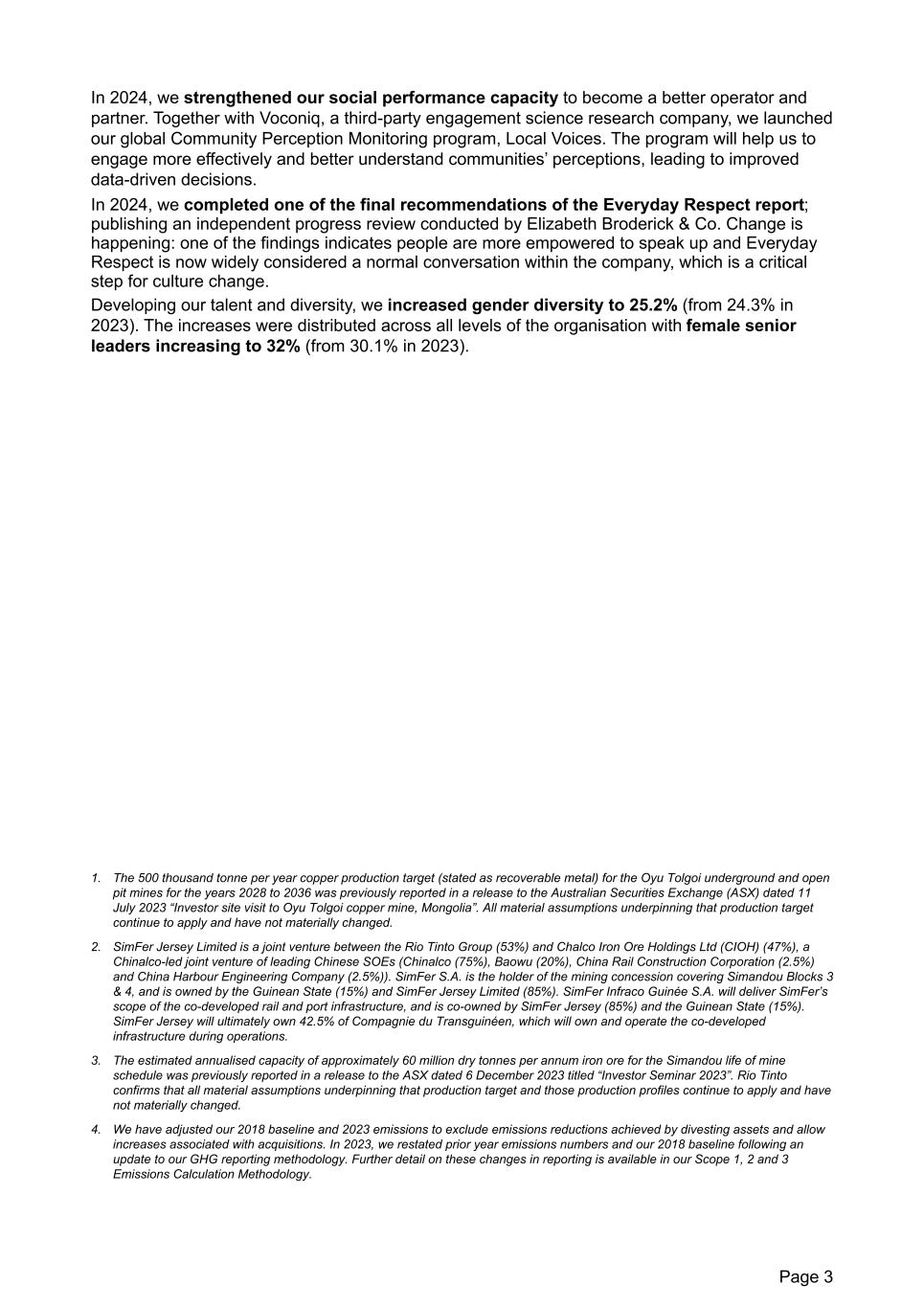 In 2024, we strengthened our social performance capacity to become a better operator and partner. Together with Voconiq, a third-party engagement science research company, we launched our global Community Perception Monitoring program, Local Voices. The program will help us to engage more effectively and better understand communities’ perceptions, leading to improved data-driven decisions. In 2024, we completed one of the final recommendations of the Everyday Respect report; publishing an independent progress review conducted by Elizabeth Broderick & Co. Change is happening: one of the findings indicates people are more empowered to speak up and Everyday Respect is now widely considered a normal conversation within the company, which is a critical step for culture change. Developing our talent and diversity, we increased gender diversity to 25.2% (from 24.3% in 2023). The increases were distributed across all levels of the organisation with female senior leaders increasing to 32% (from 30.1% in 2023). 1. The 500 thousand tonne per year copper production target (stated as recoverable metal) for the Oyu Tolgoi underground and open pit mines for the years 2028 to 2036 was previously reported in a release to the Australian Securities Exchange (ASX) dated 11 July 2023 “Investor site visit to Oyu Tolgoi copper mine, Mongolia”. All material assumptions underpinning that production target continue to apply and have not materially changed. 2. SimFer Jersey Limited is a joint venture between the Rio Tinto Group (53%) and Chalco Iron Ore Holdings Ltd (CIOH) (47%), a Chinalco-led joint venture of leading Chinese SOEs (Chinalco (75%), Baowu (20%), China Rail Construction Corporation (2.5%) and China Harbour Engineering Company (2.5%)). SimFer S.A. is the holder of the mining concession covering Simandou Blocks 3 & 4, and is owned by the Guinean State (15%) and SimFer Jersey Limited (85%). SimFer Infraco Guinée S.A. will deliver SimFer’s scope of the co-developed rail and port infrastructure, and is co-owned by SimFer Jersey (85%) and the Guinean State (15%). SimFer Jersey will ultimately own 42.5% of Compagnie du Transguinéen, which will own and operate the co-developed infrastructure during operations. 3. The estimated annualised capacity of approximately 60 million dry tonnes per annum iron ore for the Simandou life of mine schedule was previously reported in a release to the ASX dated 6 December 2023 titled “Investor Seminar 2023”. Rio Tinto confirms that all material assumptions underpinning that production target and those production profiles continue to apply and have not materially changed. 4. We have adjusted our 2018 baseline and 2023 emissions to exclude emissions reductions achieved by divesting assets and allow increases associated with acquisitions. In 2023, we restated prior year emissions numbers and our 2018 baseline following an update to our GHG reporting methodology. Further detail on these changes in reporting is available in our Scope 1, 2 and 3 Emissions Calculation Methodology. Page 3