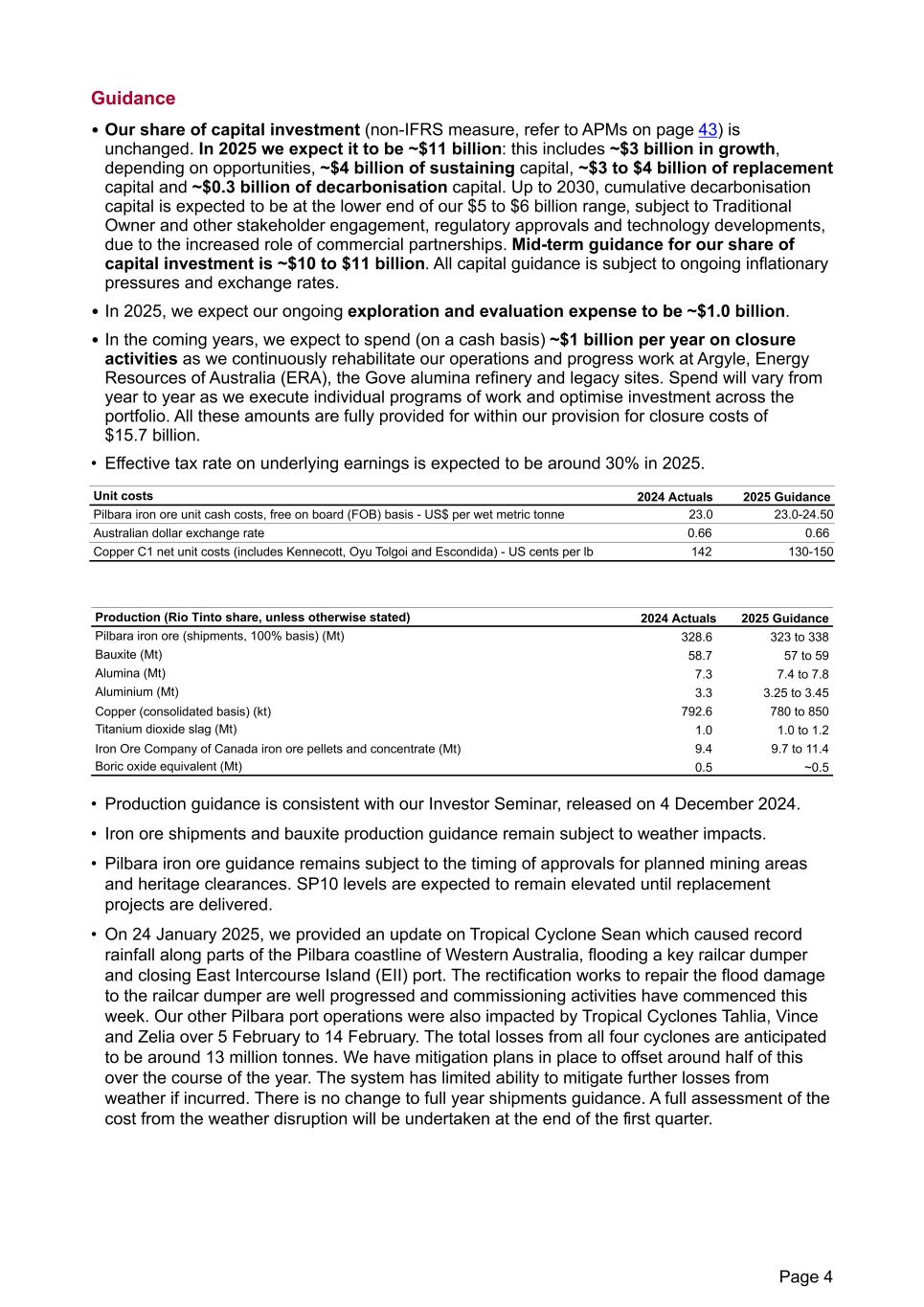 Guidance • Our share of capital investment (non-IFRS measure, refer to APMs on page 43) is unchanged. In 2025 we expect it to be ~$11 billion: this includes ~$3 billion in growth, depending on opportunities, ~$4 billion of sustaining capital, ~$3 to $4 billion of replacement capital and ~$0.3 billion of decarbonisation capital. Up to 2030, cumulative decarbonisation capital is expected to be at the lower end of our $5 to $6 billion range, subject to Traditional Owner and other stakeholder engagement, regulatory approvals and technology developments, due to the increased role of commercial partnerships. Mid-term guidance for our share of capital investment is ~$10 to $11 billion. All capital guidance is subject to ongoing inflationary pressures and exchange rates. • In 2025, we expect our ongoing exploration and evaluation expense to be ~$1.0 billion. • In the coming years, we expect to spend (on a cash basis) ~$1 billion per year on closure activities as we continuously rehabilitate our operations and progress work at Argyle, Energy Resources of Australia (ERA), the Gove alumina refinery and legacy sites. Spend will vary from year to year as we execute individual programs of work and optimise investment across the portfolio. All these amounts are fully provided for within our provision for closure costs of $15.7 billion. • Effective tax rate on underlying earnings is expected to be around 30% in 2025. Unit costs 2024 Actuals 2025 Guidance Pilbara iron ore unit cash costs, free on board (FOB) basis - US$ per wet metric tonne 23.0 23.0-24.50 Australian dollar exchange rate 0.66 0.66 Copper C1 net unit costs (includes Kennecott, Oyu Tolgoi and Escondida) - US cents per lb 142 130-150 Production (Rio Tinto share, unless otherwise stated) 2024 Actuals 2025 Guidance Pilbara iron ore (shipments, 100% basis) (Mt) 328.6 323 to 338 Bauxite (Mt) 58.7 57 to 59 Alumina (Mt) 7.3 7.4 to 7.8 Aluminium (Mt) 3.3 3.25 to 3.45 Copper (consolidated basis) (kt) 792.6 780 to 850 Titanium dioxide slag (Mt) 1.0 1.0 to 1.2 Iron Ore Company of Canada iron ore pellets and concentrate (Mt) 9.4 9.7 to 11.4 Boric oxide equivalent (Mt) 0.5 ~0.5 • Production guidance is consistent with our Investor Seminar, released on 4 December 2024. • Iron ore shipments and bauxite production guidance remain subject to weather impacts. • Pilbara iron ore guidance remains subject to the timing of approvals for planned mining areas and heritage clearances. SP10 levels are expected to remain elevated until replacement projects are delivered. • On 24 January 2025, we provided an update on Tropical Cyclone Sean which caused record rainfall along parts of the Pilbara coastline of Western Australia, flooding a key railcar dumper and closing East Intercourse Island (EII) port. The rectification works to repair the flood damage to the railcar dumper are well progressed and commissioning activities have commenced this week. Our other Pilbara port operations were also impacted by Tropical Cyclones Tahlia, Vince and Zelia over 5 February to 14 February. The total losses from all four cyclones are anticipated to be around 13 million tonnes. We have mitigation plans in place to offset around half of this over the course of the year. The system has limited ability to mitigate further losses from weather if incurred. There is no change to full year shipments guidance. A full assessment of the cost from the weather disruption will be undertaken at the end of the first quarter. Page 4