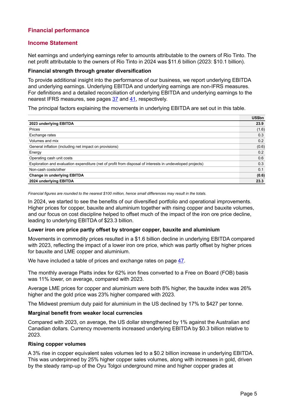 Financial performance Income Statement Net earnings and underlying earnings refer to amounts attributable to the owners of Rio Tinto. The net profit attributable to the owners of Rio Tinto in 2024 was $11.6 billion (2023: $10.1 billion). Financial strength through greater diversification To provide additional insight into the performance of our business, we report underlying EBITDA and underlying earnings. Underlying EBITDA and underlying earnings are non-IFRS measures. For definitions and a detailed reconciliation of underlying EBITDA and underlying earnings to the nearest IFRS measures, see pages 37 and 41, respectively. The principal factors explaining the movements in underlying EBITDA are set out in this table. US$bn 2023 underlying EBITDA 23.9 Prices (1.6) Exchange rates 0.3 Volumes and mix 0.2 General inflation (including net impact on provisions) (0.6) Energy 0.2 Operating cash unit costs 0.6 Exploration and evaluation expenditure (net of profit from disposal of interests in undeveloped projects) 0.3 Non-cash costs/other 0.1 Change in underlying EBITDA (0.6) 2024 underlying EBITDA 23.3 Financial figures are rounded to the nearest $100 million, hence small differences may result in the totals. In 2024, we started to see the benefits of our diversified portfolio and operational improvements. Higher prices for copper, bauxite and aluminium together with rising copper and bauxite volumes, and our focus on cost discipline helped to offset much of the impact of the iron ore price decline, leading to underlying EBITDA of $23.3 billion. Lower iron ore price partly offset by stronger copper, bauxite and aluminium Movements in commodity prices resulted in a $1.6 billion decline in underlying EBITDA compared with 2023, reflecting the impact of a lower iron ore price, which was partly offset by higher prices for bauxite and LME copper and aluminium. We have included a table of prices and exchange rates on page 47. The monthly average Platts index for 62% iron fines converted to a Free on Board (FOB) basis was 11% lower, on average, compared with 2023. Average LME prices for copper and aluminium were both 8% higher, the bauxite index was 26% higher and the gold price was 23% higher compared with 2023. The Midwest premium duty paid for aluminium in the US declined by 17% to $427 per tonne. Marginal benefit from weaker local currencies Compared with 2023, on average, the US dollar strengthened by 1% against the Australian and Canadian dollars. Currency movements increased underlying EBITDA by $0.3 billion relative to 2023. Rising copper volumes A 3% rise in copper equivalent sales volumes led to a $0.2 billion increase in underlying EBITDA. This was underpinned by 25% higher copper sales volumes, along with increases in gold, driven by the steady ramp-up of the Oyu Tolgoi underground mine and higher copper grades at Page 5