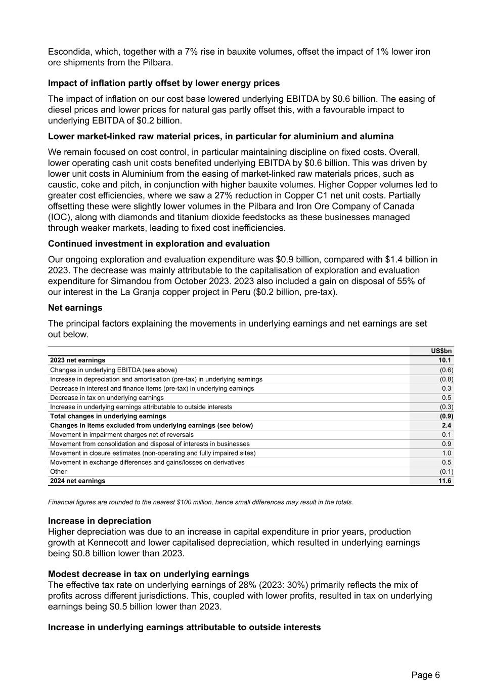Escondida, which, together with a 7% rise in bauxite volumes, offset the impact of 1% lower iron ore shipments from the Pilbara. Impact of inflation partly offset by lower energy prices The impact of inflation on our cost base lowered underlying EBITDA by $0.6 billion. The easing of diesel prices and lower prices for natural gas partly offset this, with a favourable impact to underlying EBITDA of $0.2 billion. Lower market-linked raw material prices, in particular for aluminium and alumina We remain focused on cost control, in particular maintaining discipline on fixed costs. Overall, lower operating cash unit costs benefited underlying EBITDA by $0.6 billion. This was driven by lower unit costs in Aluminium from the easing of market-linked raw materials prices, such as caustic, coke and pitch, in conjunction with higher bauxite volumes. Higher Copper volumes led to greater cost efficiencies, where we saw a 27% reduction in Copper C1 net unit costs. Partially offsetting these were slightly lower volumes in the Pilbara and Iron Ore Company of Canada (IOC), along with diamonds and titanium dioxide feedstocks as these businesses managed through weaker markets, leading to fixed cost inefficiencies. Continued investment in exploration and evaluation Our ongoing exploration and evaluation expenditure was $0.9 billion, compared with $1.4 billion in 2023. The decrease was mainly attributable to the capitalisation of exploration and evaluation expenditure for Simandou from October 2023. 2023 also included a gain on disposal of 55% of our interest in the La Granja copper project in Peru ($0.2 billion, pre-tax). Net earnings The principal factors explaining the movements in underlying earnings and net earnings are set out below. US$bn 2023 net earnings 10.1 Changes in underlying EBITDA (see above) (0.6) Increase in depreciation and amortisation (pre-tax) in underlying earnings (0.8) Decrease in interest and finance items (pre-tax) in underlying earnings 0.3 Decrease in tax on underlying earnings 0.5 Increase in underlying earnings attributable to outside interests (0.3) Total changes in underlying earnings (0.9) Changes in items excluded from underlying earnings (see below) 2.4 Movement in impairment charges net of reversals 0.1 Movement from consolidation and disposal of interests in businesses 0.9 Movement in closure estimates (non-operating and fully impaired sites) 1.0 Movement in exchange differences and gains/losses on derivatives 0.5 Other (0.1) 2024 net earnings 11.6 Financial figures are rounded to the nearest $100 million, hence small differences may result in the totals. Increase in depreciation Higher depreciation was due to an increase in capital expenditure in prior years, production growth at Kennecott and lower capitalised depreciation, which resulted in underlying earnings being $0.8 billion lower than 2023. Modest decrease in tax on underlying earnings The effective tax rate on underlying earnings of 28% (2023: 30%) primarily reflects the mix of profits across different jurisdictions. This, coupled with lower profits, resulted in tax on underlying earnings being $0.5 billion lower than 2023. Increase in underlying earnings attributable to outside interests Page 6