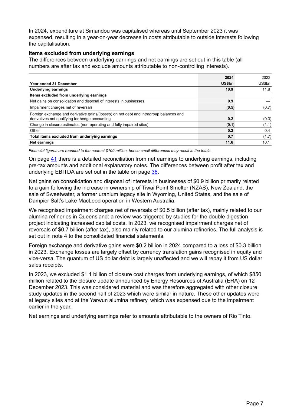 In 2024, expenditure at Simandou was capitalised whereas until September 2023 it was expensed, resulting in a year-on-year decrease in costs attributable to outside interests following the capitalisation. Items excluded from underlying earnings The differences between underlying earnings and net earnings are set out in this table (all numbers are after tax and exclude amounts attributable to non-controlling interests). 2024 2023 Year ended 31 December US$bn US$bn Underlying earnings 10.9 11.8 Items excluded from underlying earnings Net gains on consolidation and disposal of interests in businesses 0.9 — Impairment charges net of reversals (0.5) (0.7) Foreign exchange and derivative gains/(losses) on net debt and intragroup balances and derivatives not qualifying for hedge accounting 0.2 (0.3) Change in closure estimates (non-operating and fully impaired sites) (0.1) (1.1) Other 0.2 0.4 Total items excluded from underlying earnings 0.7 (1.7) Net earnings 11.6 10.1 Financial figures are rounded to the nearest $100 million, hence small differences may result in the totals. On page 41 there is a detailed reconciliation from net earnings to underlying earnings, including pre-tax amounts and additional explanatory notes. The differences between profit after tax and underlying EBITDA are set out in the table on page 38. Net gains on consolidation and disposal of interests in businesses of $0.9 billion primarily related to a gain following the increase in ownership of Tiwai Point Smelter (NZAS), New Zealand, the sale of Sweetwater, a former uranium legacy site in Wyoming, United States, and the sale of Dampier Salt’s Lake MacLeod operation in Western Australia. We recognised impairment charges net of reversals of $0.5 billion (after tax), mainly related to our alumina refineries in Queensland: a review was triggered by studies for the double digestion project indicating increased capital costs. In 2023, we recognised impairment charges net of reversals of $0.7 billion (after tax), also mainly related to our alumina refineries. The full analysis is set out in note 4 to the consolidated financial statements. Foreign exchange and derivative gains were $0.2 billion in 2024 compared to a loss of $0.3 billion in 2023. Exchange losses are largely offset by currency translation gains recognised in equity and vice-versa. The quantum of US dollar debt is largely unaffected and we will repay it from US dollar sales receipts. In 2023, we excluded $1.1 billion of closure cost charges from underlying earnings, of which $850 million related to the closure update announced by Energy Resources of Australia (ERA) on 12 December 2023. This was considered material and was therefore aggregated with other closure study updates in the second half of 2023 which were similar in nature. These other updates were at legacy sites and at the Yarwun alumina refinery, which was expensed due to the impairment earlier in the year. Net earnings and underlying earnings refer to amounts attributable to the owners of Rio Tinto. Page 7