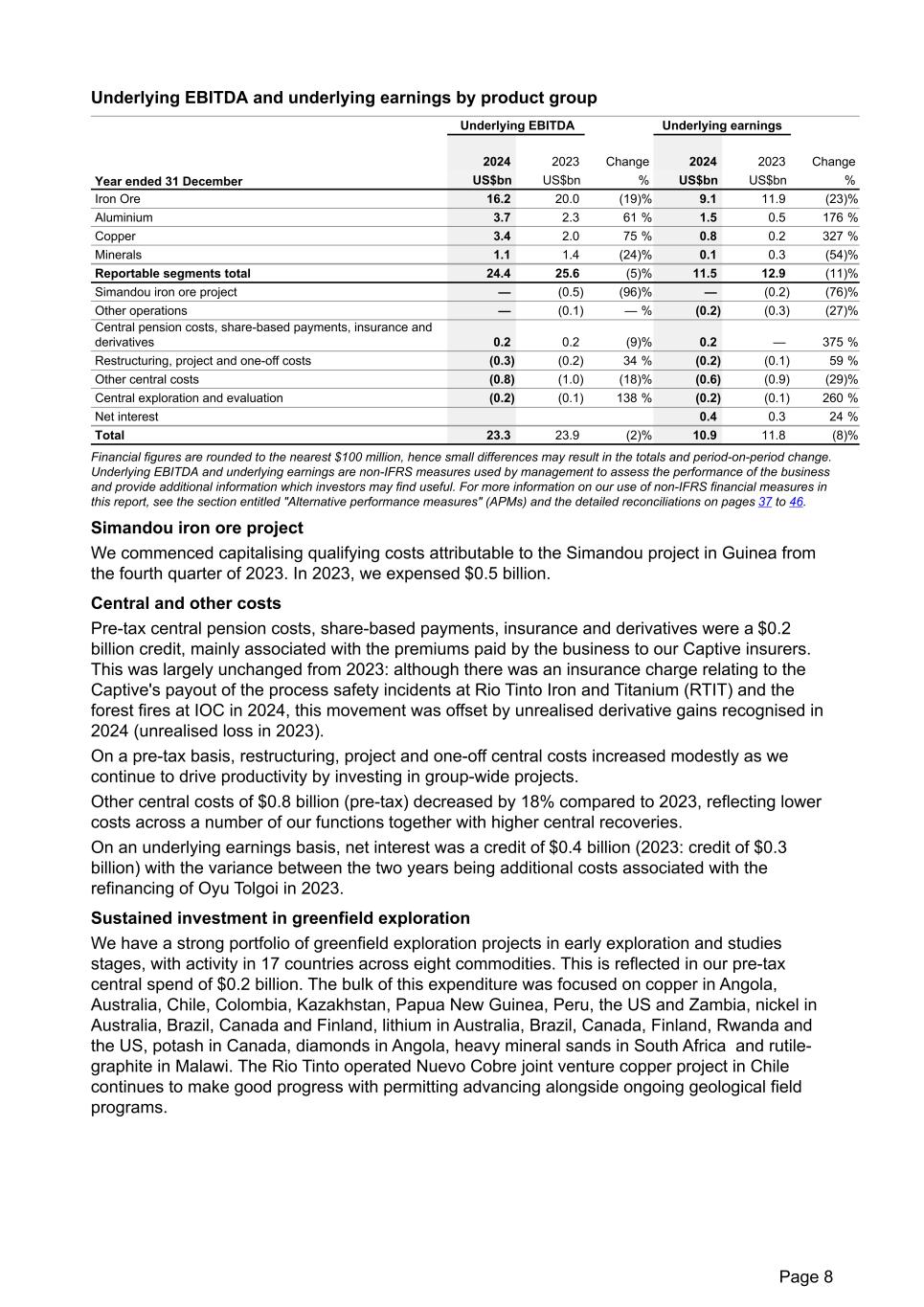 Underlying EBITDA and underlying earnings by product group Underlying EBITDA Underlying earnings 2024 2023 Change 2024 2023 Change Year ended 31 December US$bn US$bn % US$bn US$bn % Iron Ore 16.2 20.0 (19) % 9.1 11.9 (23) % Aluminium 3.7 2.3 61 % 1.5 0.5 176 % Copper 3.4 2.0 75 % 0.8 0.2 327 % Minerals 1.1 1.4 (24) % 0.1 0.3 (54) % Reportable segments total 24.4 25.6 (5) % 11.5 12.9 (11) % Simandou iron ore project — (0.5) (96) % — (0.2) (76) % Other operations — (0.1) — % (0.2) (0.3) (27) % Central pension costs, share-based payments, insurance and derivatives 0.2 0.2 (9) % 0.2 — 375 % Restructuring, project and one-off costs (0.3) (0.2) 34 % (0.2) (0.1) 59 % Other central costs (0.8) (1.0) (18) % (0.6) (0.9) (29) % Central exploration and evaluation (0.2) (0.1) 138 % (0.2) (0.1) 260 % Net interest 0.4 0.3 24 % Total 23.3 23.9 (2) % 10.9 11.8 (8) % Financial figures are rounded to the nearest $100 million, hence small differences may result in the totals and period-on-period change. Underlying EBITDA and underlying earnings are non-IFRS measures used by management to assess the performance of the business and provide additional information which investors may find useful. For more information on our use of non-IFRS financial measures in this report, see the section entitled "Alternative performance measures" (APMs) and the detailed reconciliations on pages 37 to 46. Simandou iron ore project We commenced capitalising qualifying costs attributable to the Simandou project in Guinea from the fourth quarter of 2023. In 2023, we expensed $0.5 billion. Central and other costs Pre-tax central pension costs, share-based payments, insurance and derivatives were a $0.2 billion credit, mainly associated with the premiums paid by the business to our Captive insurers. This was largely unchanged from 2023: although there was an insurance charge relating to the Captive's payout of the process safety incidents at Rio Tinto Iron and Titanium (RTIT) and the forest fires at IOC in 2024, this movement was offset by unrealised derivative gains recognised in 2024 (unrealised loss in 2023). On a pre-tax basis, restructuring, project and one-off central costs increased modestly as we continue to drive productivity by investing in group-wide projects. Other central costs of $0.8 billion (pre-tax) decreased by 18% compared to 2023, reflecting lower costs across a number of our functions together with higher central recoveries. On an underlying earnings basis, net interest was a credit of $0.4 billion (2023: credit of $0.3 billion) with the variance between the two years being additional costs associated with the refinancing of Oyu Tolgoi in 2023. Sustained investment in greenfield exploration We have a strong portfolio of greenfield exploration projects in early exploration and studies stages, with activity in 17 countries across eight commodities. This is reflected in our pre-tax central spend of $0.2 billion. The bulk of this expenditure was focused on copper in Angola, Australia, Chile, Colombia, Kazakhstan, Papua New Guinea, Peru, the US and Zambia, nickel in Australia, Brazil, Canada and Finland, lithium in Australia, Brazil, Canada, Finland, Rwanda and the US, potash in Canada, diamonds in Angola, heavy mineral sands in South Africa and rutile- graphite in Malawi. The Rio Tinto operated Nuevo Cobre joint venture copper project in Chile continues to make good progress with permitting advancing alongside ongoing geological field programs. Page 8