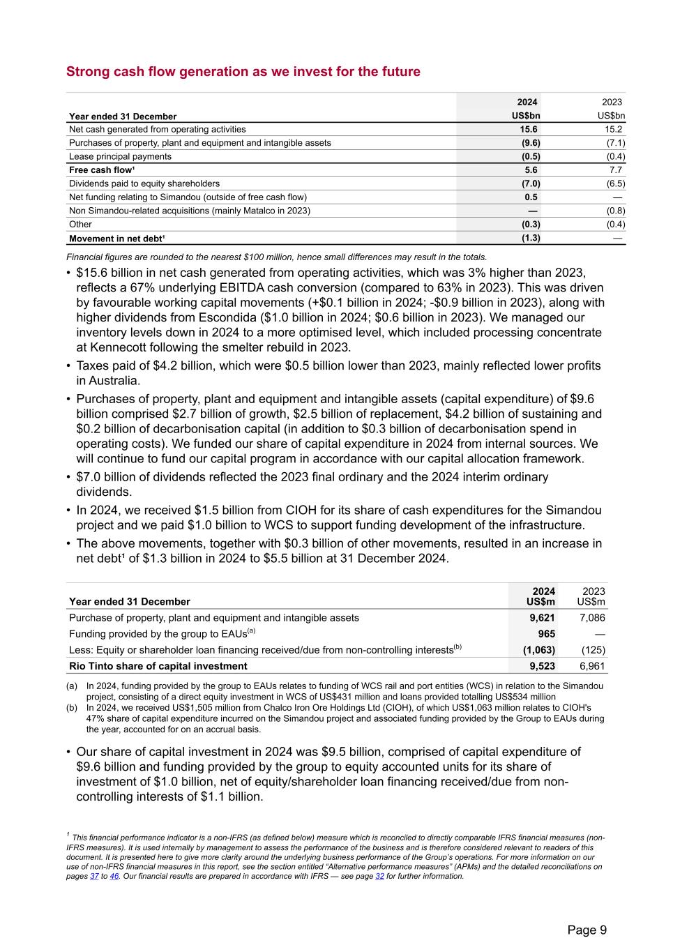 Strong cash flow generation as we invest for the future 2024 2023 Year ended 31 December US$bn US$bn Net cash generated from operating activities 15.6 15.2 Purchases of property, plant and equipment and intangible assets (9.6) (7.1) Lease principal payments (0.5) (0.4) Free cash flow¹ 5.6 7.7 Dividends paid to equity shareholders (7.0) (6.5) Net funding relating to Simandou (outside of free cash flow) 0.5 — Non Simandou-related acquisitions (mainly Matalco in 2023) — (0.8) Other (0.3) (0.4) Movement in net debt¹ (1.3) — Financial figures are rounded to the nearest $100 million, hence small differences may result in the totals. • $15.6 billion in net cash generated from operating activities, which was 3% higher than 2023, reflects a 67% underlying EBITDA cash conversion (compared to 63% in 2023). This was driven by favourable working capital movements (+$0.1 billion in 2024; -$0.9 billion in 2023), along with higher dividends from Escondida ($1.0 billion in 2024; $0.6 billion in 2023). We managed our inventory levels down in 2024 to a more optimised level, which included processing concentrate at Kennecott following the smelter rebuild in 2023. • Taxes paid of $4.2 billion, which were $0.5 billion lower than 2023, mainly reflected lower profits in Australia. • Purchases of property, plant and equipment and intangible assets (capital expenditure) of $9.6 billion comprised $2.7 billion of growth, $2.5 billion of replacement, $4.2 billion of sustaining and $0.2 billion of decarbonisation capital (in addition to $0.3 billion of decarbonisation spend in operating costs). We funded our share of capital expenditure in 2024 from internal sources. We will continue to fund our capital program in accordance with our capital allocation framework. • $7.0 billion of dividends reflected the 2023 final ordinary and the 2024 interim ordinary dividends. • In 2024, we received $1.5 billion from CIOH for its share of cash expenditures for the Simandou project and we paid $1.0 billion to WCS to support funding development of the infrastructure. • The above movements, together with $0.3 billion of other movements, resulted in an increase in net debt¹ of $1.3 billion in 2024 to $5.5 billion at 31 December 2024. Year ended 31 December 2024 US$m 2023 US$m Purchase of property, plant and equipment and intangible assets 9,621 7,086 Funding provided by the group to EAUs(a) 965 — Less: Equity or shareholder loan financing received/due from non-controlling interests(b) (1,063) (125) Rio Tinto share of capital investment 9,523 6,961 (a) In 2024, funding provided by the group to EAUs relates to funding of WCS rail and port entities (WCS) in relation to the Simandou project, consisting of a direct equity investment in WCS of US$431 million and loans provided totalling US$534 million (b) In 2024, we received US$1,505 million from Chalco Iron Ore Holdings Ltd (CIOH), of which US$1,063 million relates to CIOH's 47% share of capital expenditure incurred on the Simandou project and associated funding provided by the Group to EAUs during the year, accounted for on an accrual basis. • Our share of capital investment in 2024 was $9.5 billion, comprised of capital expenditure of $9.6 billion and funding provided by the group to equity accounted units for its share of investment of $1.0 billion, net of equity/shareholder loan financing received/due from non- controlling interests of $1.1 billion. 1 This financial performance indicator is a non-IFRS (as defined below) measure which is reconciled to directly comparable IFRS financial measures (non- IFRS measures). It is used internally by management to assess the performance of the business and is therefore considered relevant to readers of this document. It is presented here to give more clarity around the underlying business performance of the Group’s operations. For more information on our use of non-IFRS financial measures in this report, see the section entitled “Alternative performance measures” (APMs) and the detailed reconciliations on pages 37 to 46. Our financial results are prepared in accordance with IFRS — see page 32 for further information. Page 9