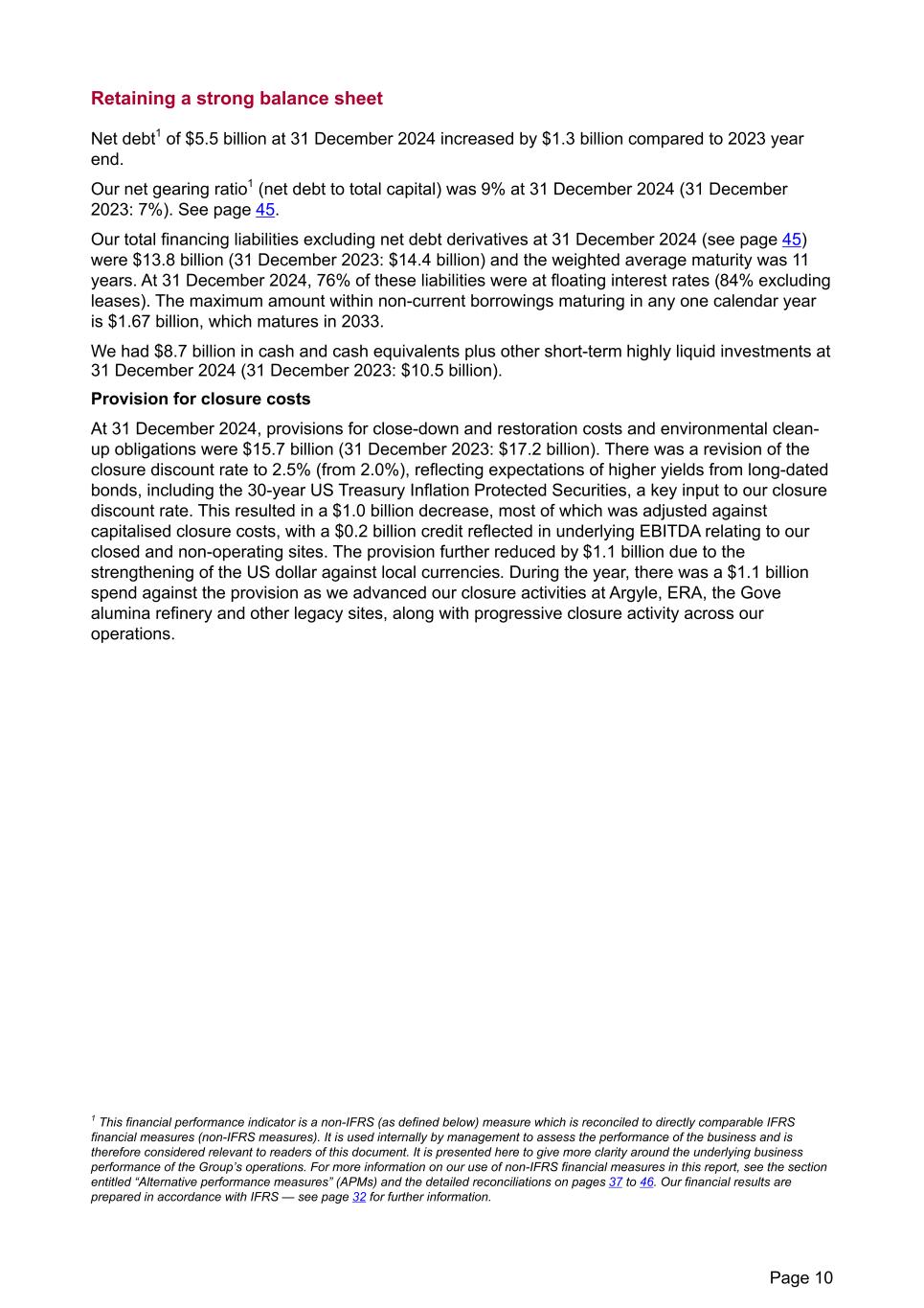 Retaining a strong balance sheet Net debt1 of $5.5 billion at 31 December 2024 increased by $1.3 billion compared to 2023 year end. Our net gearing ratio1 (net debt to total capital) was 9% at 31 December 2024 (31 December 2023: 7%). See page 45. Our total financing liabilities excluding net debt derivatives at 31 December 2024 (see page 45) were $13.8 billion (31 December 2023: $14.4 billion) and the weighted average maturity was 11 years. At 31 December 2024, 76% of these liabilities were at floating interest rates (84% excluding leases). The maximum amount within non-current borrowings maturing in any one calendar year is $1.67 billion, which matures in 2033. We had $8.7 billion in cash and cash equivalents plus other short-term highly liquid investments at 31 December 2024 (31 December 2023: $10.5 billion). Provision for closure costs At 31 December 2024, provisions for close-down and restoration costs and environmental clean- up obligations were $15.7 billion (31 December 2023: $17.2 billion). There was a revision of the closure discount rate to 2.5% (from 2.0%), reflecting expectations of higher yields from long-dated bonds, including the 30-year US Treasury Inflation Protected Securities, a key input to our closure discount rate. This resulted in a $1.0 billion decrease, most of which was adjusted against capitalised closure costs, with a $0.2 billion credit reflected in underlying EBITDA relating to our closed and non-operating sites. The provision further reduced by $1.1 billion due to the strengthening of the US dollar against local currencies. During the year, there was a $1.1 billion spend against the provision as we advanced our closure activities at Argyle, ERA, the Gove alumina refinery and other legacy sites, along with progressive closure activity across our operations. 1 This financial performance indicator is a non-IFRS (as defined below) measure which is reconciled to directly comparable IFRS financial measures (non-IFRS measures). It is used internally by management to assess the performance of the business and is therefore considered relevant to readers of this document. It is presented here to give more clarity around the underlying business performance of the Group’s operations. For more information on our use of non-IFRS financial measures in this report, see the section entitled “Alternative performance measures” (APMs) and the detailed reconciliations on pages 37 to 46. Our financial results are prepared in accordance with IFRS — see page 32 for further information. Page 10