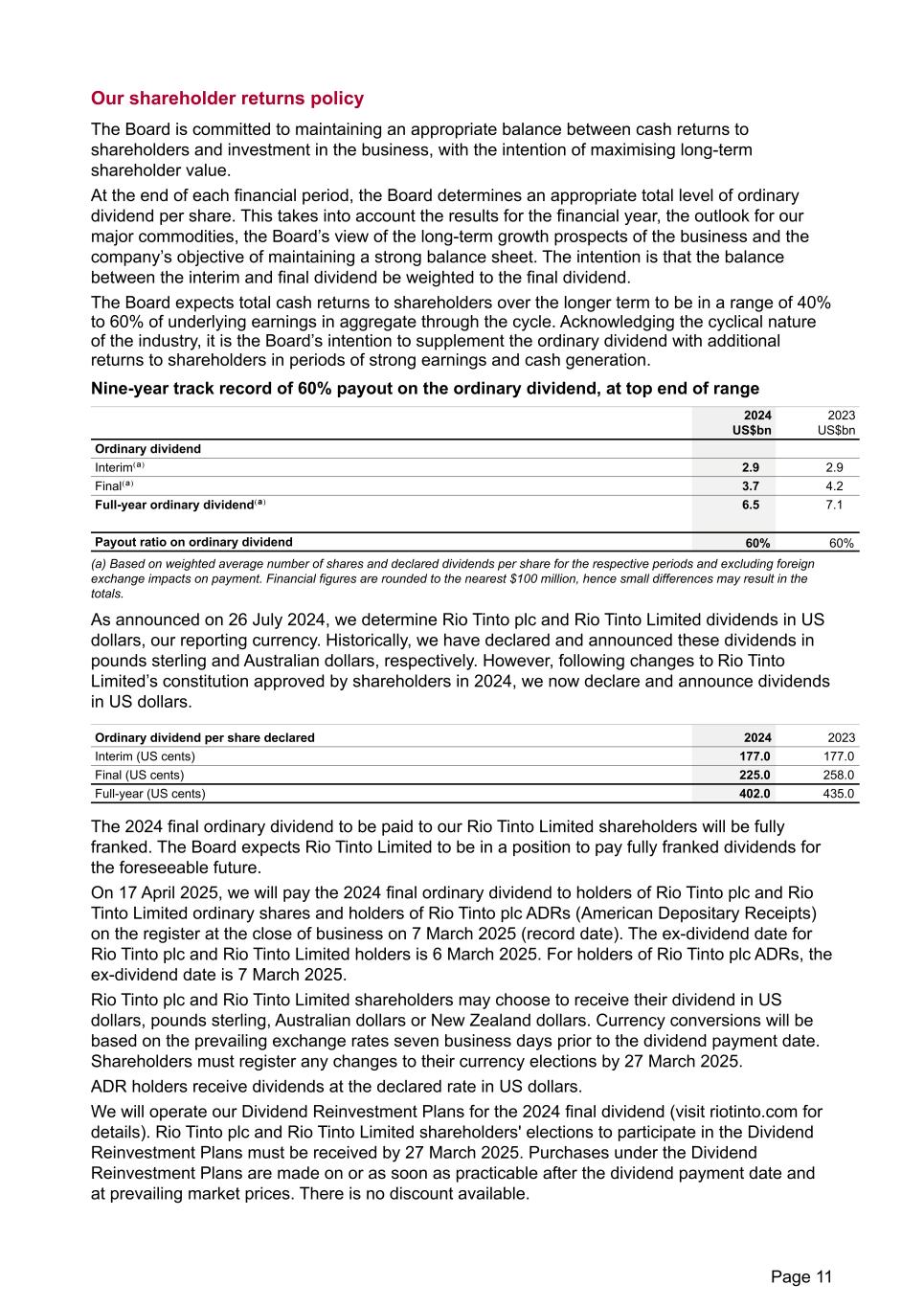 Our shareholder returns policy The Board is committed to maintaining an appropriate balance between cash returns to shareholders and investment in the business, with the intention of maximising long-term shareholder value. At the end of each financial period, the Board determines an appropriate total level of ordinary dividend per share. This takes into account the results for the financial year, the outlook for our major commodities, the Board’s view of the long-term growth prospects of the business and the company’s objective of maintaining a strong balance sheet. The intention is that the balance between the interim and final dividend be weighted to the final dividend. The Board expects total cash returns to shareholders over the longer term to be in a range of 40% to 60% of underlying earnings in aggregate through the cycle. Acknowledging the cyclical nature of the industry, it is the Board’s intention to supplement the ordinary dividend with additional returns to shareholders in periods of strong earnings and cash generation. Nine-year track record of 60% payout on the ordinary dividend, at top end of range 2024 US$bn 2023 US$bn Ordinary dividend Interim⁽ª⁾ 2.9 2.9 Final⁽ª⁾ 3.7 4.2 Full-year ordinary dividend⁽ª⁾ 6.5 7.1 Payout ratio on ordinary dividend 60% 60% (a) Based on weighted average number of shares and declared dividends per share for the respective periods and excluding foreign exchange impacts on payment. Financial figures are rounded to the nearest $100 million, hence small differences may result in the totals. As announced on 26 July 2024, we determine Rio Tinto plc and Rio Tinto Limited dividends in US dollars, our reporting currency. Historically, we have declared and announced these dividends in pounds sterling and Australian dollars, respectively. However, following changes to Rio Tinto Limited’s constitution approved by shareholders in 2024, we now declare and announce dividends in US dollars. Ordinary dividend per share declared 2024 2023 Interim (US cents) 177.0 177.0 Final (US cents) 225.0 258.0 Full-year (US cents) 402.0 435.0 The 2024 final ordinary dividend to be paid to our Rio Tinto Limited shareholders will be fully franked. The Board expects Rio Tinto Limited to be in a position to pay fully franked dividends for the foreseeable future. On 17 April 2025, we will pay the 2024 final ordinary dividend to holders of Rio Tinto plc and Rio Tinto Limited ordinary shares and holders of Rio Tinto plc ADRs (American Depositary Receipts) on the register at the close of business on 7 March 2025 (record date). The ex-dividend date for Rio Tinto plc and Rio Tinto Limited holders is 6 March 2025. For holders of Rio Tinto plc ADRs, the ex-dividend date is 7 March 2025. Rio Tinto plc and Rio Tinto Limited shareholders may choose to receive their dividend in US dollars, pounds sterling, Australian dollars or New Zealand dollars. Currency conversions will be based on the prevailing exchange rates seven business days prior to the dividend payment date. Shareholders must register any changes to their currency elections by 27 March 2025. ADR holders receive dividends at the declared rate in US dollars. We will operate our Dividend Reinvestment Plans for the 2024 final dividend (visit riotinto.com for details). Rio Tinto plc and Rio Tinto Limited shareholders' elections to participate in the Dividend Reinvestment Plans must be received by 27 March 2025. Purchases under the Dividend Reinvestment Plans are made on or as soon as practicable after the dividend payment date and at prevailing market prices. There is no discount available. Page 11