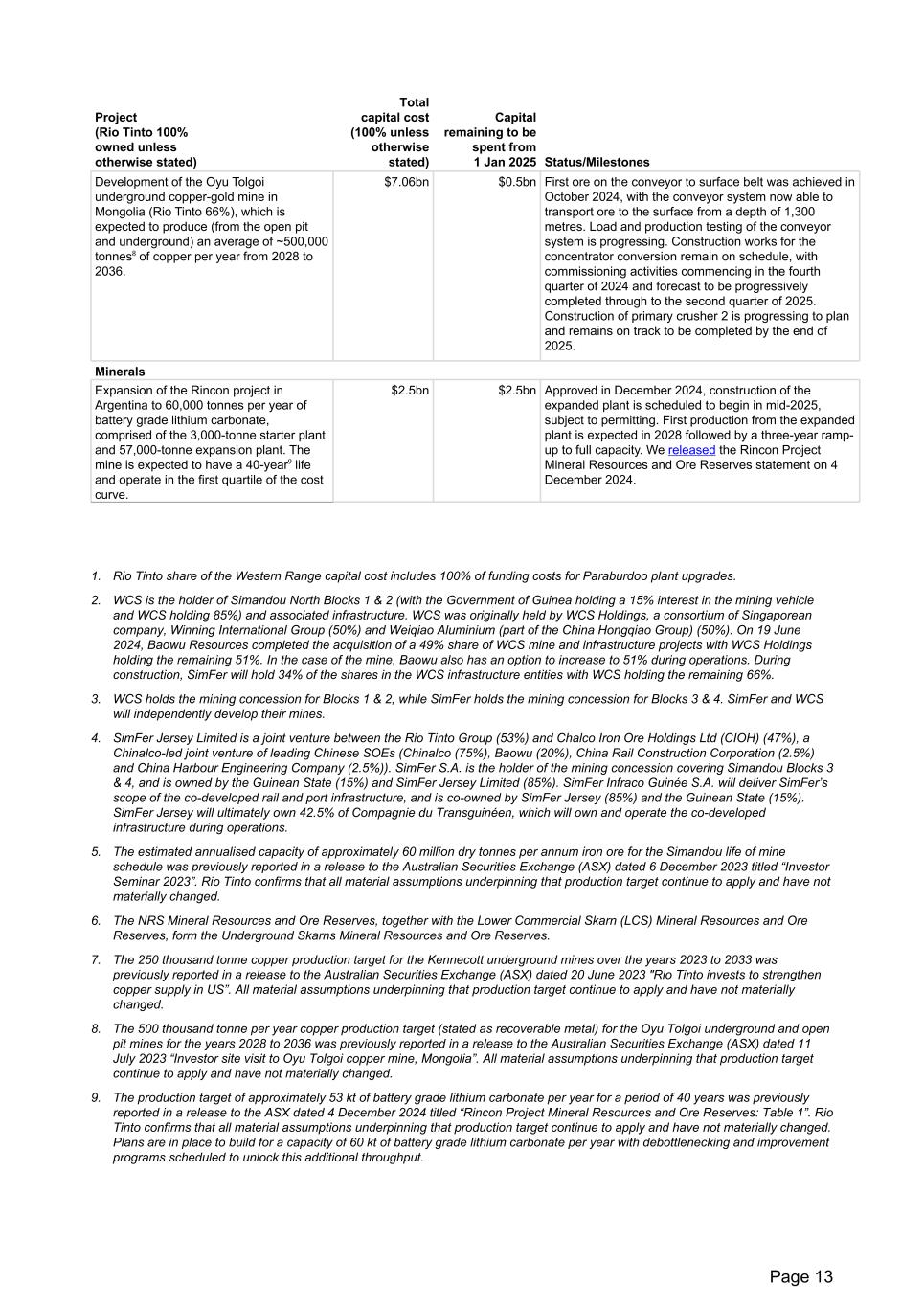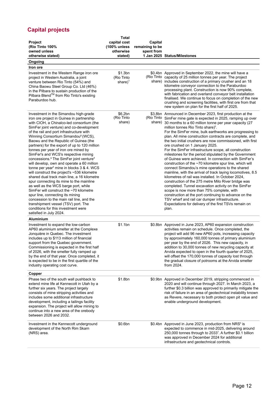 Capital projects Ongoing Iron ore Investment in the Western Range iron ore project in Western Australia, a joint venture between Rio Tinto (54%) and China Baowu Steel Group Co. Ltd (46%) in the Pilbara to sustain production of the Pilbara BlendTM from Rio Tinto's existing Paraburdoo hub. $1.3bn (Rio Tinto share)1 $0.4bn (Rio Tinto share) Approved in September 2022, the mine will have a capacity of 25 million tonnes per year. The project includes construction of a primary crusher and an 18 kilometre conveyor connection to the Paraburdoo processing plant. Construction is now 90% complete, with fabrication and overland conveyor belt installation finalised.  We continue to focus on completion of the new crushing and screening facilities, with first ore from that new system on plan for the first half of 2025. Investment in the Simandou high-grade iron ore project in Guinea in partnership with CIOH, a Chinalco-led consortium (the SimFer joint venture) and co-development of the rail and port infrastructure with Winning Consortium Simandou² (WCS), Baowu and the Republic of Guinea (the partners) for the export of up to 120 million tonnes per year of iron ore mined by SimFer's and WCS's respective mining concessions.³ The SimFer joint venture⁴ will develop, own and operate a 60 million tonne per year⁵ mine in blocks 3 & 4. WCS will construct the project's ~536 kilometre shared dual track main line, a 16 kilometre spur connecting its mine to the mainline as well as the WCS barge port, while SimFer will construct the ~70 kilometre spur line, connecting its mining concession to the main rail line, and the transhipment vessel (TSV) port. The conditions for this investment were satisfied in July 2024. $6.2bn (Rio Tinto share) $3.8bn (Rio Tinto share) Announced in December 2023, first production at the SimFer mine gate is expected in 2025, ramping up over 30 months to a 60 million tonne per year capacity (27 million tonnes Rio Tinto share)⁵. For the SimFer mine, bulk earthworks are progressing to plan. All mine construction contracts are complete, and the two initial crushers are now commissioned, with first ore crushed on 1 January 2025. For the SimFer infrastructure scope, all construction milestones for the period stipulated by the Government of Guinea were achieved. In connection with SimFer’s construction of the ~70 kilometre spur line, which will connect Simandou’s mine operations to the shared mainline, with the arrival of track laying locomotives, 8.5 kilometres of rail was installed. In October 2024, construction of the 275 metre Milo River bridge was completed. Tunnel excavation activity on the SimFer scope is now more than 75% complete, with construction at the port continuing to advance on the TSV wharf and rail car dumper infrastructure. Expectations for delivery of the first TSVs remain on plan. Aluminium Investment to expand the low-carbon AP60 aluminium smelter at the Complexe Jonquière in Quebec. The investment includes up to $113 million of financial support from the Quebec government. Commissioning is expected in the first half of 2026, with the smelter fully ramped up by the end of that year. Once completed, it is expected to be in the first quartile of the industry operating cost curve. $1.1bn $0.8bn Approved in June 2023, AP60 expansion construction activities remain on schedule. Once completed, the project will add 96 new AP60 pots, increasing capacity by approximately 160,000 tonnes of primary aluminium per year by the end of 2026. This new capacity, in addition to 30,000 tonnes of new recycling capacity at Arvida expected to open in the fourth quarter of 2025, will offset the 170,000 tonnes of capacity lost through the gradual closure of potrooms at the Arvida smelter from 2024. Copper Phase two of the south wall pushback to extend mine life at Kennecott in Utah by a further six years. The project largely consists of mine stripping activities and includes some additional infrastructure development, including a tailings facility expansion. The project will allow mining to continue into a new area of the orebody between 2026 and 2032. $1.8bn $0.9bn Approved in December 2019, stripping commenced in 2020 and will continue through 2027. In March 2023, a further $0.3 billion was approved to primarily mitigate the risk of failure in an area of geotechnical instability known as Revere, necessary to both protect open pit value and enable underground development. Investment in the Kennecott underground development of the North Rim Skarn (NRS) area. $0.6bn $0.4bn Approved in June 2023, production from NRS⁶ is expected to commence in mid-2025, delivering around 250,000 tonnes through to 2033⁷. A further $0.1 billion was approved in December 2024 for additional infrastructure and geotechnical controls. Project (Rio Tinto 100% owned unless otherwise stated) Total capital cost (100% unless otherwise stated) Capital remaining to be spent from 1 Jan 2025 Status/Milestones Page 12