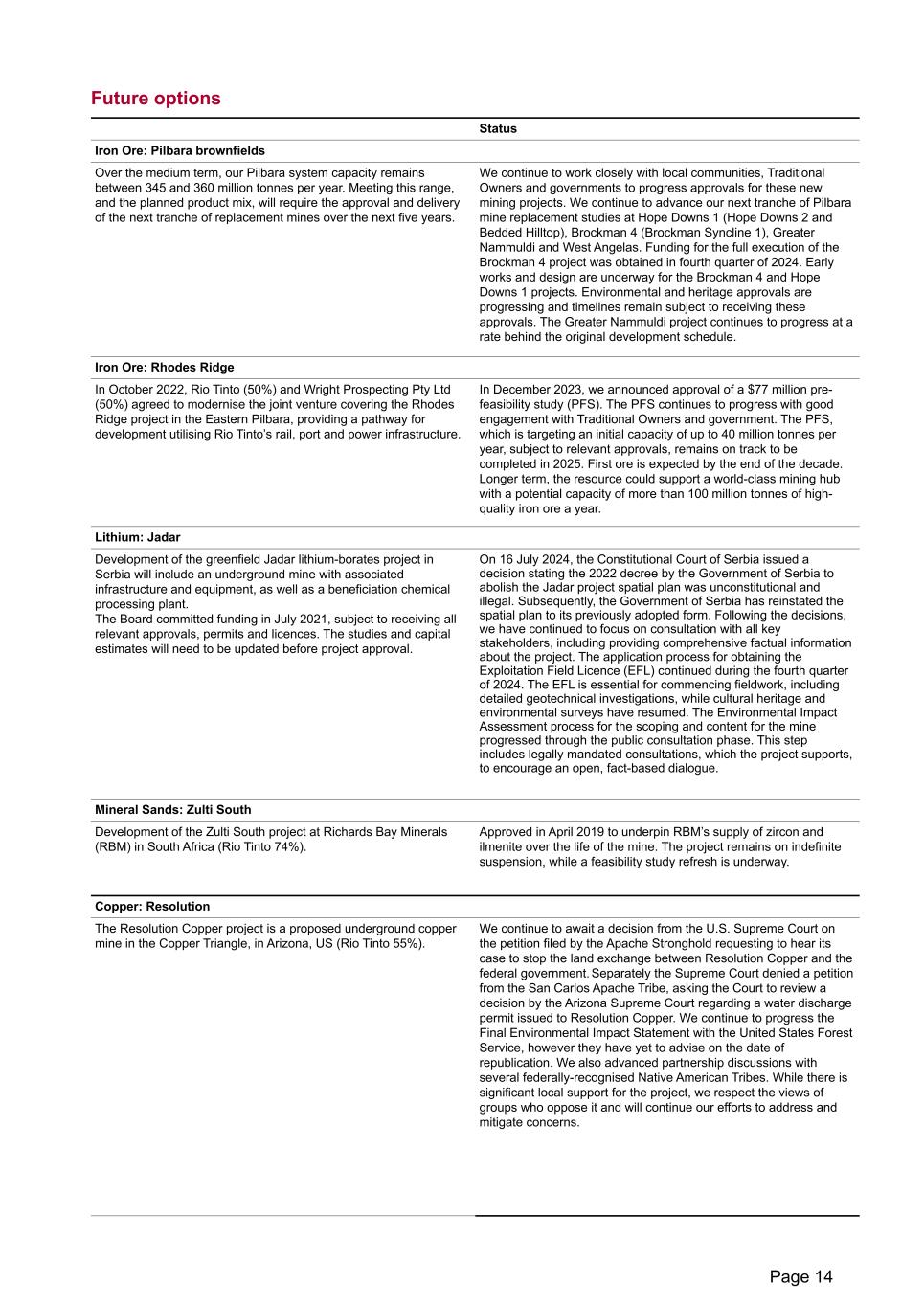 Future options Status Iron Ore: Pilbara brownfields Over the medium term, our Pilbara system capacity remains between 345 and 360 million tonnes per year. Meeting this range, and the planned product mix, will require the approval and delivery of the next tranche of replacement mines over the next five years. We continue to work closely with local communities, Traditional Owners and governments to progress approvals for these new mining projects. We continue to advance our next tranche of Pilbara mine replacement studies at Hope Downs 1 (Hope Downs 2 and Bedded Hilltop), Brockman 4 (Brockman Syncline 1), Greater Nammuldi and West Angelas. Funding for the full execution of the Brockman 4 project was obtained in fourth quarter of 2024. Early works and design are underway for the Brockman 4 and Hope Downs 1 projects. Environmental and heritage approvals are progressing and timelines remain subject to receiving these approvals. The Greater Nammuldi project continues to progress at a rate behind the original development schedule. Iron Ore: Rhodes Ridge In October 2022, Rio Tinto (50%) and Wright Prospecting Pty Ltd (50%) agreed to modernise the joint venture covering the Rhodes Ridge project in the Eastern Pilbara, providing a pathway for development utilising Rio Tinto’s rail, port and power infrastructure. In December 2023, we announced approval of a $77 million pre- feasibility study (PFS). The PFS continues to progress with good engagement with Traditional Owners and government. The PFS, which is targeting an initial capacity of up to 40 million tonnes per year, subject to relevant approvals, remains on track to be completed in 2025. First ore is expected by the end of the decade. Longer term, the resource could support a world-class mining hub with a potential capacity of more than 100 million tonnes of high- quality iron ore a year. Lithium: Jadar Development of the greenfield Jadar lithium-borates project in Serbia will include an underground mine with associated infrastructure and equipment, as well as a beneficiation chemical processing plant. The Board committed funding in July 2021, subject to receiving all relevant approvals, permits and licences. The studies and capital estimates will need to be updated before project approval. On 16 July 2024, the Constitutional Court of Serbia issued a decision stating the 2022 decree by the Government of Serbia to abolish the Jadar project spatial plan was unconstitutional and illegal. Subsequently, the Government of Serbia has reinstated the spatial plan to its previously adopted form. Following the decisions, we have continued to focus on consultation with all key stakeholders, including providing comprehensive factual information about the project. The application process for obtaining the Exploitation Field Licence (EFL) continued during the fourth quarter of 2024. The EFL is essential for commencing fieldwork, including detailed geotechnical investigations, while cultural heritage and environmental surveys have resumed. The Environmental Impact Assessment process for the scoping and content for the mine progressed through the public consultation phase. This step includes legally mandated consultations, which the project supports, to encourage an open, fact-based dialogue. Mineral Sands: Zulti South Development of the Zulti South project at Richards Bay Minerals (RBM) in South Africa (Rio Tinto 74%). Approved in April 2019 to underpin RBM’s supply of zircon and ilmenite over the life of the mine. The project remains on indefinite suspension, while a feasibility study refresh is underway. Copper: Resolution The Resolution Copper project is a proposed underground copper mine in the Copper Triangle, in Arizona, US (Rio Tinto 55%). We continue to await a decision from the U.S. Supreme Court on the petition filed by the Apache Stronghold requesting to hear its case to stop the land exchange between Resolution Copper and the federal government. Separately the Supreme Court denied a petition from the San Carlos Apache Tribe, asking the Court to review a decision by the Arizona Supreme Court regarding a water discharge permit issued to Resolution Copper. We continue to progress the Final Environmental Impact Statement with the United States Forest Service, however they have yet to advise on the date of republication. We also advanced partnership discussions with several federally-recognised Native American Tribes. While there is significant local support for the project, we respect the views of groups who oppose it and will continue our efforts to address and mitigate concerns. Page 14