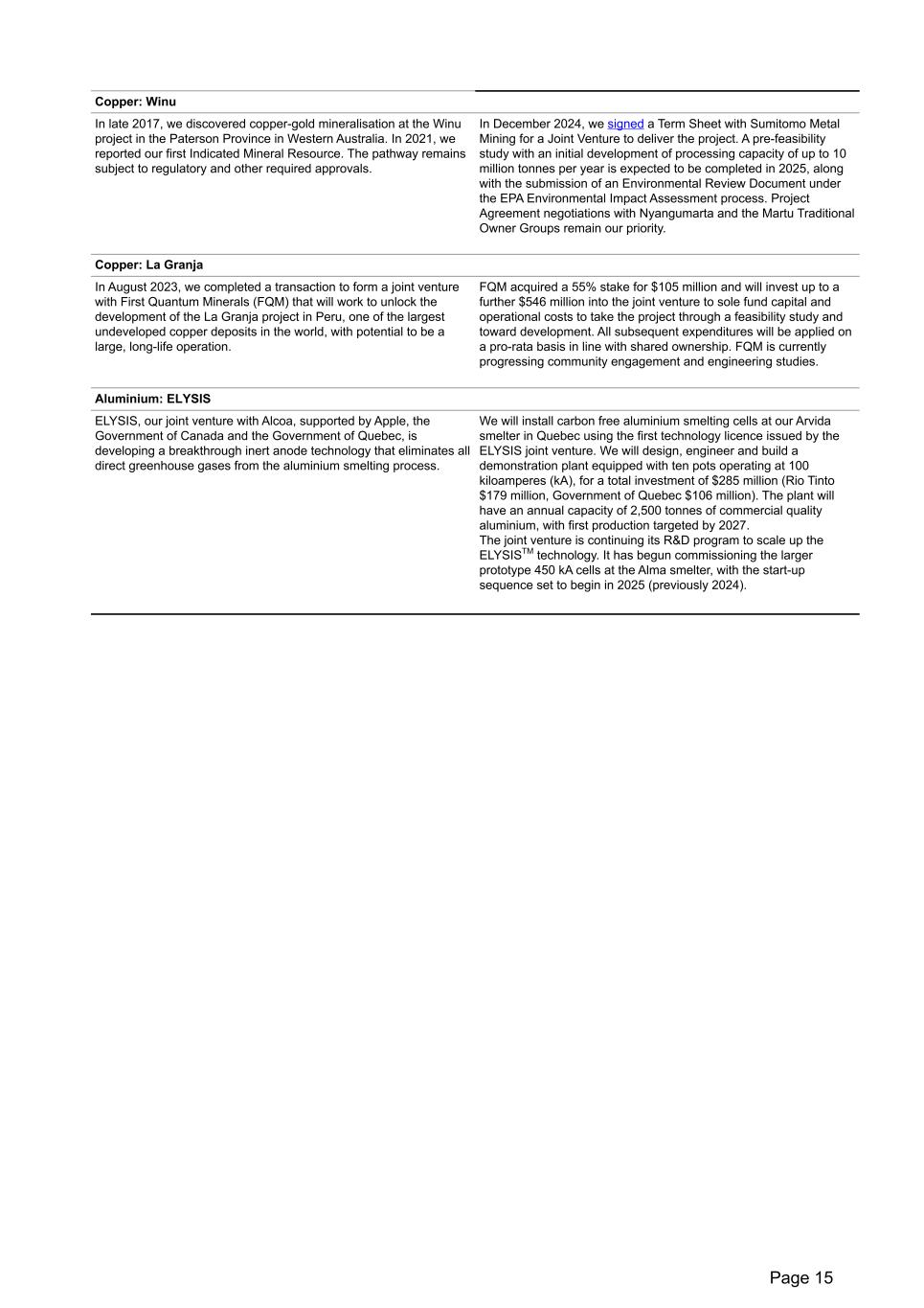 Copper: Winu In late 2017, we discovered copper-gold mineralisation at the Winu project in the Paterson Province in Western Australia. In 2021, we reported our first Indicated Mineral Resource. The pathway remains subject to regulatory and other required approvals. In December 2024, we signed a Term Sheet with Sumitomo Metal Mining for a Joint Venture to deliver the project. A pre-feasibility study with an initial development of processing capacity of up to 10 million tonnes per year is expected to be completed in 2025, along with the submission of an Environmental Review Document under the EPA Environmental Impact Assessment process. Project Agreement negotiations with Nyangumarta and the Martu Traditional Owner Groups remain our priority. Copper: La Granja In August 2023, we completed a transaction to form a joint venture with First Quantum Minerals (FQM) that will work to unlock the development of the La Granja project in Peru, one of the largest undeveloped copper deposits in the world, with potential to be a large, long-life operation. FQM acquired a 55% stake for $105 million and will invest up to a further $546 million into the joint venture to sole fund capital and operational costs to take the project through a feasibility study and toward development. All subsequent expenditures will be applied on a pro-rata basis in line with shared ownership. FQM is currently progressing community engagement and engineering studies. Aluminium: ELYSIS ELYSIS, our joint venture with Alcoa, supported by Apple, the Government of Canada and the Government of Quebec, is developing a breakthrough inert anode technology that eliminates all direct greenhouse gases from the aluminium smelting process. We will install carbon free aluminium smelting cells at our Arvida smelter in Quebec using the first technology licence issued by the ELYSIS joint venture. We will design, engineer and build a demonstration plant equipped with ten pots operating at 100 kiloamperes (kA), for a total investment of $285 million (Rio Tinto $179 million, Government of Quebec $106 million). The plant will have an annual capacity of 2,500 tonnes of commercial quality aluminium, with first production targeted by 2027. The joint venture is continuing its R&D program to scale up the ELYSISTM technology. It has begun commissioning the larger prototype 450 kA cells at the Alma smelter, with the start-up sequence set to begin in 2025 (previously 2024). Page 15
