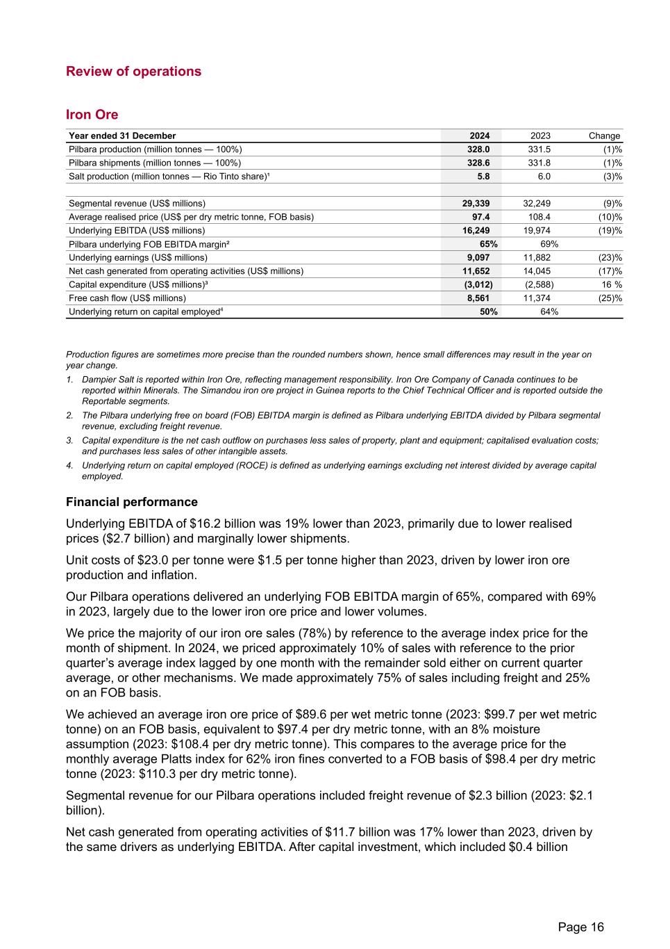 Review of operations Iron Ore Year ended 31 December 2024 2023 Change Pilbara production (million tonnes — 100%) 328.0 331.5 (1) % Pilbara shipments (million tonnes — 100%) 328.6 331.8 (1) % Salt production (million tonnes — Rio Tinto share)¹ 5.8 6.0 (3) % Segmental revenue (US$ millions) 29,339 32,249 (9) % Average realised price (US$ per dry metric tonne, FOB basis) 97.4 108.4 (10) % Underlying EBITDA (US$ millions) 16,249 19,974 (19) % Pilbara underlying FOB EBITDA margin² 65% 69% Underlying earnings (US$ millions) 9,097 11,882 (23) % Net cash generated from operating activities (US$ millions) 11,652 14,045 (17) % Capital expenditure (US$ millions)³ (3,012) (2,588) 16 % Free cash flow (US$ millions) 8,561 11,374 (25) % Underlying return on capital employed⁴ 50% 64% Production figures are sometimes more precise than the rounded numbers shown, hence small differences may result in the year on year change. 1. Dampier Salt is reported within Iron Ore, reflecting management responsibility. Iron Ore Company of Canada continues to be reported within Minerals. The Simandou iron ore project in Guinea reports to the Chief Technical Officer and is reported outside the Reportable segments. 2. The Pilbara underlying free on board (FOB) EBITDA margin is defined as Pilbara underlying EBITDA divided by Pilbara segmental revenue, excluding freight revenue. 3. Capital expenditure is the net cash outflow on purchases less sales of property, plant and equipment; capitalised evaluation costs; and purchases less sales of other intangible assets. 4. Underlying return on capital employed (ROCE) is defined as underlying earnings excluding net interest divided by average capital employed. Financial performance Underlying EBITDA of $16.2 billion was 19% lower than 2023, primarily due to lower realised prices ($2.7 billion) and marginally lower shipments. Unit costs of $23.0 per tonne were $1.5 per tonne higher than 2023, driven by lower iron ore production and inflation. Our Pilbara operations delivered an underlying FOB EBITDA margin of 65%, compared with 69% in 2023, largely due to the lower iron ore price and lower volumes. We price the majority of our iron ore sales (78%) by reference to the average index price for the month of shipment. In 2024, we priced approximately 10% of sales with reference to the prior quarter’s average index lagged by one month with the remainder sold either on current quarter average, or other mechanisms. We made approximately 75% of sales including freight and 25% on an FOB basis. We achieved an average iron ore price of $89.6 per wet metric tonne (2023: $99.7 per wet metric tonne) on an FOB basis, equivalent to $97.4 per dry metric tonne, with an 8% moisture assumption (2023: $108.4 per dry metric tonne). This compares to the average price for the monthly average Platts index for 62% iron fines converted to a FOB basis of $98.4 per dry metric tonne (2023: $110.3 per dry metric tonne). Segmental revenue for our Pilbara operations included freight revenue of $2.3 billion (2023: $2.1 billion). Net cash generated from operating activities of $11.7 billion was 17% lower than 2023, driven by the same drivers as underlying EBITDA. After capital investment, which included $0.4 billion Page 16