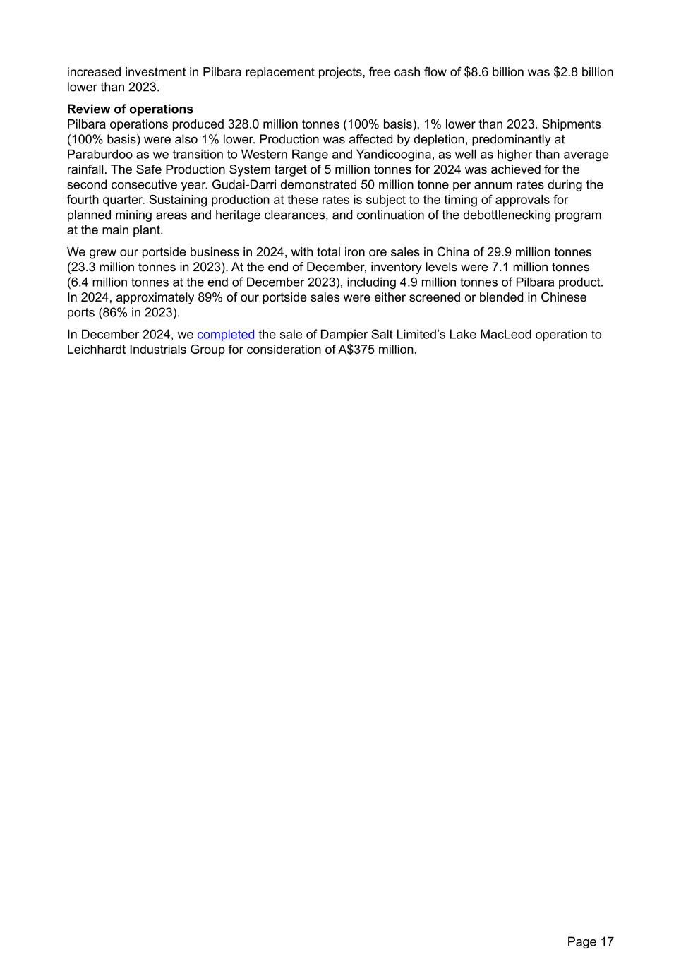 increased investment in Pilbara replacement projects, free cash flow of $8.6 billion was $2.8 billion lower than 2023. Review of operations Pilbara operations produced 328.0 million tonnes (100% basis), 1% lower than 2023. Shipments (100% basis) were also 1% lower. Production was affected by depletion, predominantly at Paraburdoo as we transition to Western Range and Yandicoogina, as well as higher than average rainfall. The Safe Production System target of 5 million tonnes for 2024 was achieved for the second consecutive year. Gudai-Darri demonstrated 50 million tonne per annum rates during the fourth quarter. Sustaining production at these rates is subject to the timing of approvals for planned mining areas and heritage clearances, and continuation of the debottlenecking program at the main plant. We grew our portside business in 2024, with total iron ore sales in China of 29.9 million tonnes (23.3 million tonnes in 2023). At the end of December, inventory levels were 7.1 million tonnes (6.4 million tonnes at the end of December 2023), including 4.9 million tonnes of Pilbara product. In 2024, approximately 89% of our portside sales were either screened or blended in Chinese ports (86% in 2023). In December 2024, we completed the sale of Dampier Salt Limited’s Lake MacLeod operation to Leichhardt Industrials Group for consideration of A$375 million. Page 17