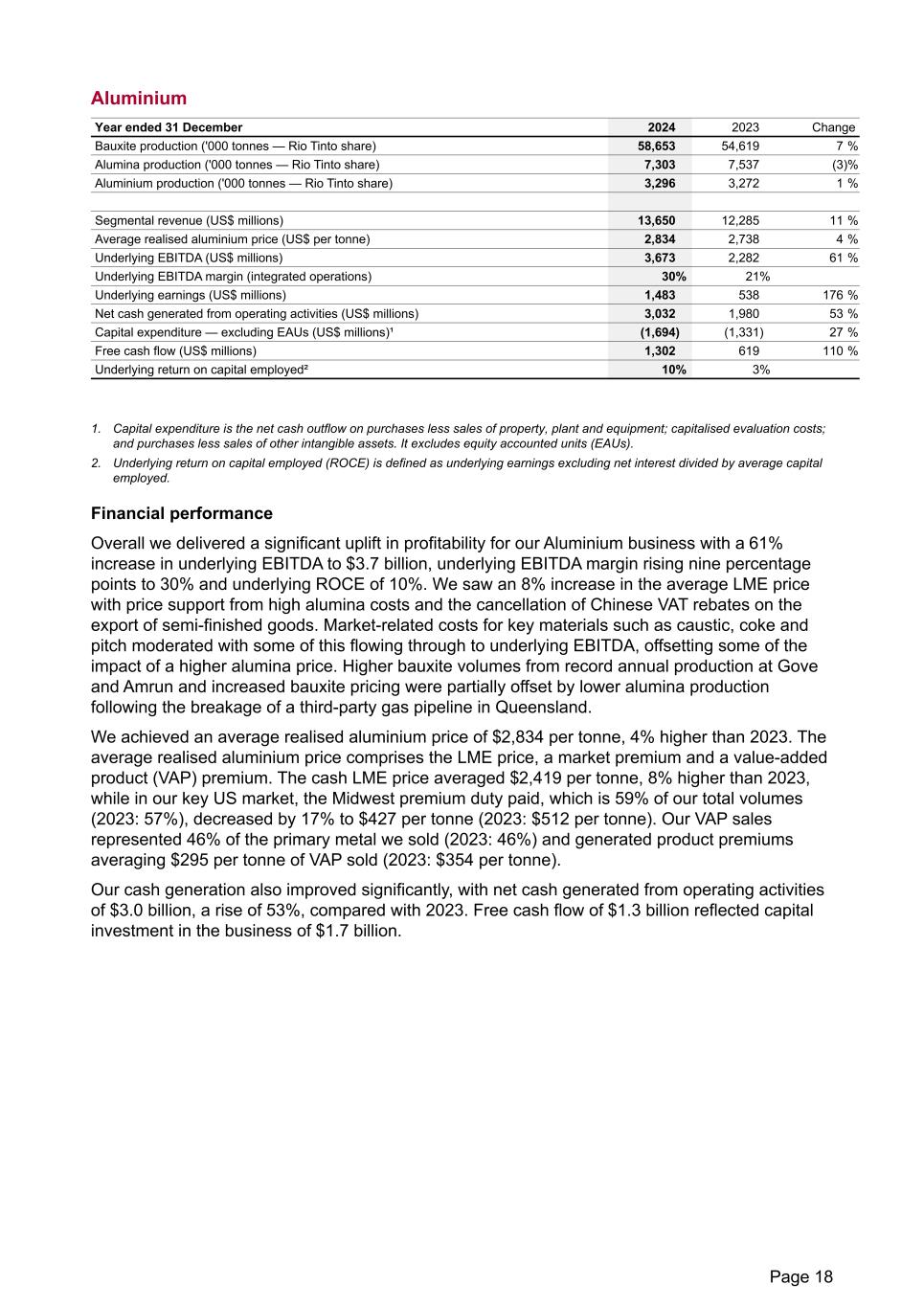 Aluminium Year ended 31 December 2024 2023 Change Bauxite production ('000 tonnes — Rio Tinto share) 58,653 54,619 7 % Alumina production ('000 tonnes — Rio Tinto share) 7,303 7,537 (3) % Aluminium production ('000 tonnes — Rio Tinto share) 3,296 3,272 1 % Segmental revenue (US$ millions) 13,650 12,285 11 % Average realised aluminium price (US$ per tonne) 2,834 2,738 4 % Underlying EBITDA (US$ millions) 3,673 2,282 61 % Underlying EBITDA margin (integrated operations) 30% 21% Underlying earnings (US$ millions) 1,483 538 176 % Net cash generated from operating activities (US$ millions) 3,032 1,980 53 % Capital expenditure — excluding EAUs (US$ millions)¹ (1,694) (1,331) 27 % Free cash flow (US$ millions) 1,302 619 110 % Underlying return on capital employed² 10% 3% 1. Capital expenditure is the net cash outflow on purchases less sales of property, plant and equipment; capitalised evaluation costs; and purchases less sales of other intangible assets. It excludes equity accounted units (EAUs). 2. Underlying return on capital employed (ROCE) is defined as underlying earnings excluding net interest divided by average capital employed. Financial performance Overall we delivered a significant uplift in profitability for our Aluminium business with a 61% increase in underlying EBITDA to $3.7 billion, underlying EBITDA margin rising nine percentage points to 30% and underlying ROCE of 10%. We saw an 8% increase in the average LME price with price support from high alumina costs and the cancellation of Chinese VAT rebates on the export of semi-finished goods. Market-related costs for key materials such as caustic, coke and pitch moderated with some of this flowing through to underlying EBITDA, offsetting some of the impact of a higher alumina price. Higher bauxite volumes from record annual production at Gove and Amrun and increased bauxite pricing were partially offset by lower alumina production following the breakage of a third-party gas pipeline in Queensland. We achieved an average realised aluminium price of $2,834 per tonne, 4% higher than 2023. The average realised aluminium price comprises the LME price, a market premium and a value-added product (VAP) premium. The cash LME price averaged $2,419 per tonne, 8% higher than 2023, while in our key US market, the Midwest premium duty paid, which is 59% of our total volumes (2023: 57%), decreased by 17% to $427 per tonne (2023: $512 per tonne). Our VAP sales represented 46% of the primary metal we sold (2023: 46%) and generated product premiums averaging $295 per tonne of VAP sold (2023: $354 per tonne). Our cash generation also improved significantly, with net cash generated from operating activities of $3.0 billion, a rise of 53%, compared with 2023. Free cash flow of $1.3 billion reflected capital investment in the business of $1.7 billion. Page 18