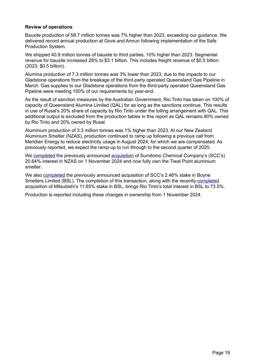 Review of operations Bauxite production of 58.7 million tonnes was 7% higher than 2023, exceeding our guidance. We delivered record annual production at Gove and Amrun following implementation of the Safe Production System. We shipped 40.9 million tonnes of bauxite to third parties, 10% higher than 2023. Segmental revenue for bauxite increased 28% to $3.1 billion. This includes freight revenue of $0.5 billion (2023: $0.5 billion). Alumina production of 7.3 million tonnes was 3% lower than 2023, due to the impacts to our Gladstone operations from the breakage of the third-party operated Queensland Gas Pipeline in March. Gas supplies to our Gladstone operations from the third-party operated Queensland Gas Pipeline were meeting 100% of our requirements by year-end. As the result of sanction measures by the Australian Government, Rio Tinto has taken on 100% of capacity of Queensland Alumina Limited (QAL) for as long as the sanctions continue. This results in use of Rusal’s 20% share of capacity by Rio Tinto under the tolling arrangement with QAL. This additional output is excluded from the production tables in this report as QAL remains 80% owned by Rio Tinto and 20% owned by Rusal. Aluminium production of 3.3 million tonnes was 1% higher than 2023. At our New Zealand Aluminium Smelter (NZAS), production continued to ramp up following a previous call from Meridian Energy to reduce electricity usage in August 2024, for which we are compensated. As previously reported, we expect the ramp-up to run through to the second quarter of 2025. We completed the previously announced acquisition of Sumitomo Chemical Company’s (SCC’s) 20.64% interest in NZAS on 1 November 2024 and now fully own the Tiwai Point aluminium smelter. We also completed the previously announced acquisition of SCC’s 2.46% stake in Boyne Smelters Limited (BSL). The completion of this transaction, along with the recently completed acquisition of Mitsubishi’s 11.65% stake in BSL, brings Rio Tinto’s total interest in BSL to 73.5%. Production is reported including these changes in ownership from 1 November 2024. Page 19