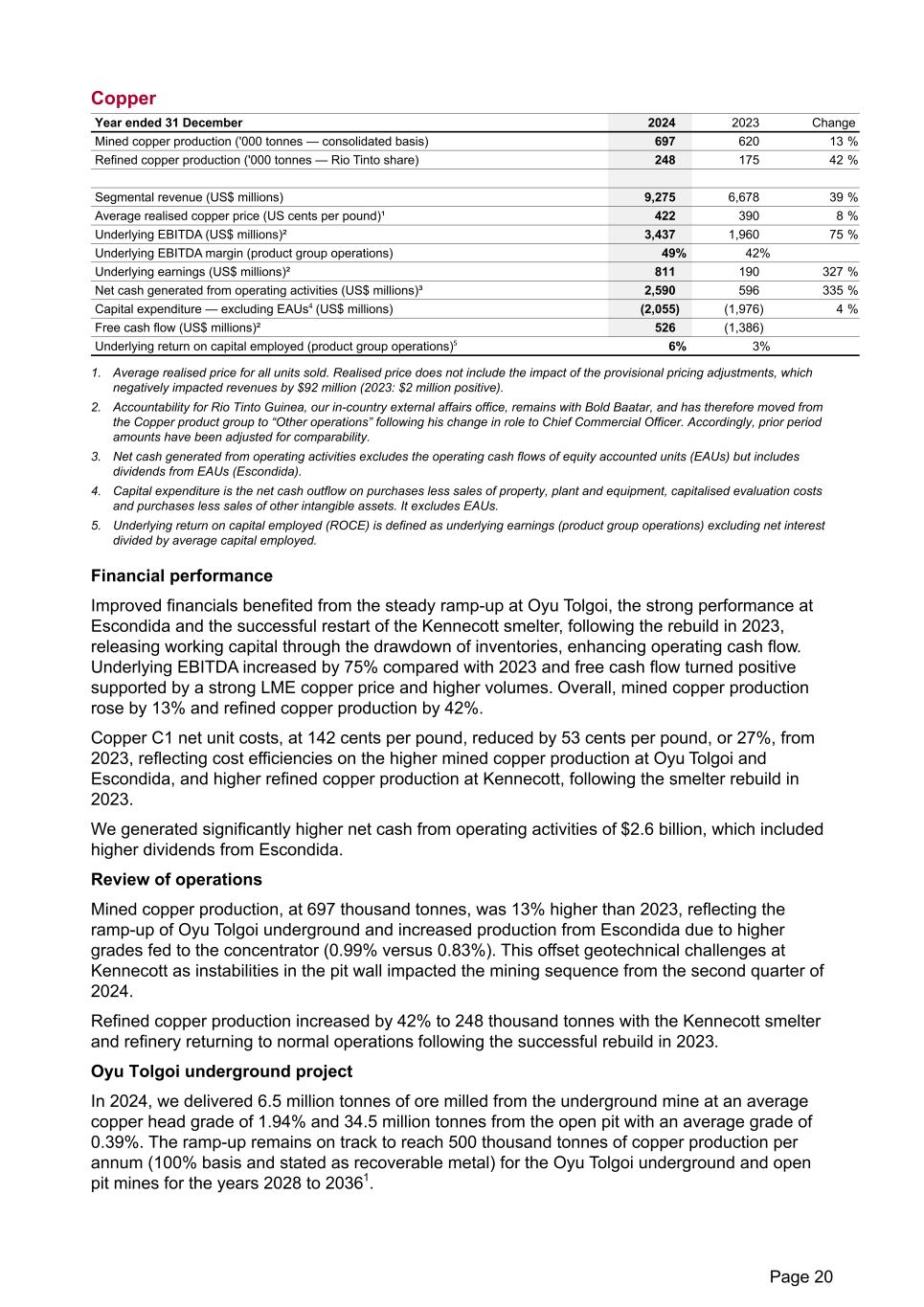 Copper Year ended 31 December 2024 2023 Change Mined copper production ('000 tonnes — consolidated basis) 697 620 13 % Refined copper production ('000 tonnes — Rio Tinto share) 248 175 42 % Segmental revenue (US$ millions) 9,275 6,678 39 % Average realised copper price (US cents per pound)¹ 422 390 8 % Underlying EBITDA (US$ millions)² 3,437 1,960 75 % Underlying EBITDA margin (product group operations) 49% 42% Underlying earnings (US$ millions)² 811 190 327 % Net cash generated from operating activities (US$ millions)³ 2,590 596 335 % Capital expenditure — excluding EAUs⁴ (US$ millions) (2,055) (1,976) 4 % Free cash flow (US$ millions)² 526 (1,386) Underlying return on capital employed (product group operations)⁵ 6% 3% 1. Average realised price for all units sold. Realised price does not include the impact of the provisional pricing adjustments, which negatively impacted revenues by $92 million (2023: $2 million positive). 2. Accountability for Rio Tinto Guinea, our in-country external affairs office, remains with Bold Baatar, and has therefore moved from the Copper product group to “Other operations” following his change in role to Chief Commercial Officer. Accordingly, prior period amounts have been adjusted for comparability. 3. Net cash generated from operating activities excludes the operating cash flows of equity accounted units (EAUs) but includes dividends from EAUs (Escondida). 4. Capital expenditure is the net cash outflow on purchases less sales of property, plant and equipment, capitalised evaluation costs and purchases less sales of other intangible assets. It excludes EAUs. 5. Underlying return on capital employed (ROCE) is defined as underlying earnings (product group operations) excluding net interest divided by average capital employed. Financial performance Improved financials benefited from the steady ramp-up at Oyu Tolgoi, the strong performance at Escondida and the successful restart of the Kennecott smelter, following the rebuild in 2023, releasing working capital through the drawdown of inventories, enhancing operating cash flow. Underlying EBITDA increased by 75% compared with 2023 and free cash flow turned positive supported by a strong LME copper price and higher volumes. Overall, mined copper production rose by 13% and refined copper production by 42%. Copper C1 net unit costs, at 142 cents per pound, reduced by 53 cents per pound, or 27%, from 2023, reflecting cost efficiencies on the higher mined copper production at Oyu Tolgoi and Escondida, and higher refined copper production at Kennecott, following the smelter rebuild in 2023. We generated significantly higher net cash from operating activities of $2.6 billion, which included higher dividends from Escondida. Review of operations Mined copper production, at 697 thousand tonnes, was 13% higher than 2023, reflecting the ramp-up of Oyu Tolgoi underground and increased production from Escondida due to higher grades fed to the concentrator (0.99% versus 0.83%). This offset geotechnical challenges at Kennecott as instabilities in the pit wall impacted the mining sequence from the second quarter of 2024. Refined copper production increased by 42% to 248 thousand tonnes with the Kennecott smelter and refinery returning to normal operations following the successful rebuild in 2023. Oyu Tolgoi underground project In 2024, we delivered 6.5 million tonnes of ore milled from the underground mine at an average copper head grade of 1.94% and 34.5 million tonnes from the open pit with an average grade of 0.39%. The ramp-up remains on track to reach 500 thousand tonnes of copper production per annum (100% basis and stated as recoverable metal) for the Oyu Tolgoi underground and open pit mines for the years 2028 to 20361. Page 20