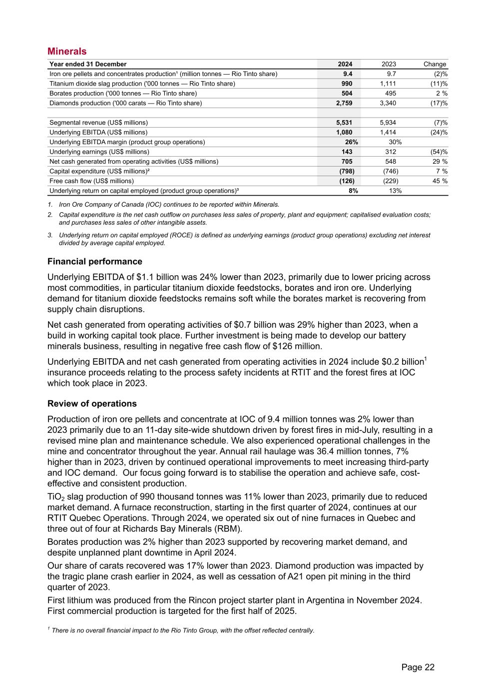 Minerals Year ended 31 December 2024 2023 Change Iron ore pellets and concentrates production¹ (million tonnes — Rio Tinto share) 9.4 9.7 (2) % Titanium dioxide slag production ('000 tonnes — Rio Tinto share) 990 1,111 (11) % Borates production ('000 tonnes — Rio Tinto share) 504 495 2 % Diamonds production ('000 carats — Rio Tinto share) 2,759 3,340 (17) % Segmental revenue (US$ millions) 5,531 5,934 (7) % Underlying EBITDA (US$ millions) 1,080 1,414 (24) % Underlying EBITDA margin (product group operations) 26% 30% Underlying earnings (US$ millions) 143 312 (54) % Net cash generated from operating activities (US$ millions) 705 548 29 % Capital expenditure (US$ millions)² (798) (746) 7 % Free cash flow (US$ millions) (126) (229) 45 % Underlying return on capital employed (product group operations)³ 8% 13% 1. Iron Ore Company of Canada (IOC) continues to be reported within Minerals. 2. Capital expenditure is the net cash outflow on purchases less sales of property, plant and equipment; capitalised evaluation costs; and purchases less sales of other intangible assets. 3. Underlying return on capital employed (ROCE) is defined as underlying earnings (product group operations) excluding net interest divided by average capital employed. Financial performance Underlying EBITDA of $1.1 billion was 24% lower than 2023, primarily due to lower pricing across most commodities, in particular titanium dioxide feedstocks, borates and iron ore. Underlying demand for titanium dioxide feedstocks remains soft while the borates market is recovering from supply chain disruptions. Net cash generated from operating activities of $0.7 billion was 29% higher than 2023, when a build in working capital took place. Further investment is being made to develop our battery minerals business, resulting in negative free cash flow of $126 million. Underlying EBITDA and net cash generated from operating activities in 2024 include $0.2 billion1 insurance proceeds relating to the process safety incidents at RTIT and the forest fires at IOC which took place in 2023. Review of operations Production of iron ore pellets and concentrate at IOC of 9.4 million tonnes was 2% lower than 2023 primarily due to an 11-day site-wide shutdown driven by forest fires in mid-July, resulting in a revised mine plan and maintenance schedule. We also experienced operational challenges in the mine and concentrator throughout the year. Annual rail haulage was 36.4 million tonnes, 7% higher than in 2023, driven by continued operational improvements to meet increasing third-party and IOC demand. Our focus going forward is to stabilise the operation and achieve safe, cost- effective and consistent production. TiO2 slag production of 990 thousand tonnes was 11% lower than 2023, primarily due to reduced market demand. A furnace reconstruction, starting in the first quarter of 2024, continues at our RTIT Quebec Operations. Through 2024, we operated six out of nine furnaces in Quebec and three out of four at Richards Bay Minerals (RBM). Borates production was 2% higher than 2023 supported by recovering market demand, and despite unplanned plant downtime in April 2024. Our share of carats recovered was 17% lower than 2023. Diamond production was impacted by the tragic plane crash earlier in 2024, as well as cessation of A21 open pit mining in the third quarter of 2023. First lithium was produced from the Rincon project starter plant in Argentina in November 2024. First commercial production is targeted for the first half of 2025. 1 There is no overall financial impact to the Rio Tinto Group, with the offset reflected centrally. Page 22