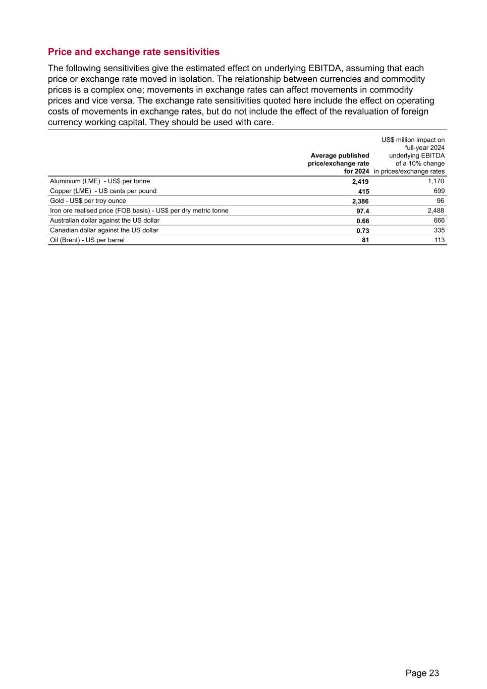 Price and exchange rate sensitivities The following sensitivities give the estimated effect on underlying EBITDA, assuming that each price or exchange rate moved in isolation. The relationship between currencies and commodity prices is a complex one; movements in exchange rates can affect movements in commodity prices and vice versa. The exchange rate sensitivities quoted here include the effect on operating costs of movements in exchange rates, but do not include the effect of the revaluation of foreign currency working capital. They should be used with care. Australian dollar against the US dollar 0.66 666 Canadian dollar against the US dollar 0.73 335 Oil (Brent) - US per barrel 81 113 Average published price/exchange rate for 2024 US$ million impact on full-year 2024 underlying EBITDA of a 10% change in prices/exchange rates Aluminium (LME) - US$ per tonne 2,419 1,170 Copper (LME) - US cents per pound 415 699 Gold - US$ per troy ounce 2,386 96 Iron ore realised price (FOB basis) - US$ per dry metric tonne 97.4 2,488 Page 23