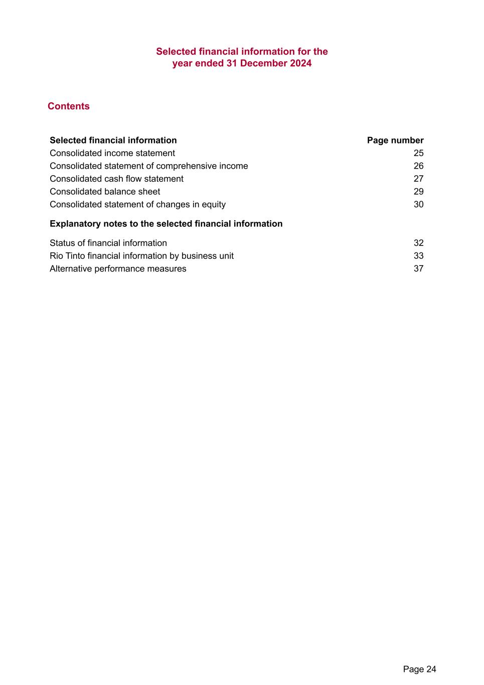 Selected financial information for the year ended 31 December 2024 Contents Selected financial information Page number Consolidated income statement 25 Consolidated statement of comprehensive income 26 Consolidated cash flow statement 27 Consolidated balance sheet 29 Consolidated statement of changes in equity 30 Explanatory notes to the selected financial information Status of financial information 32 Rio Tinto financial information by business unit 33 Alternative performance measures 37 Page 24