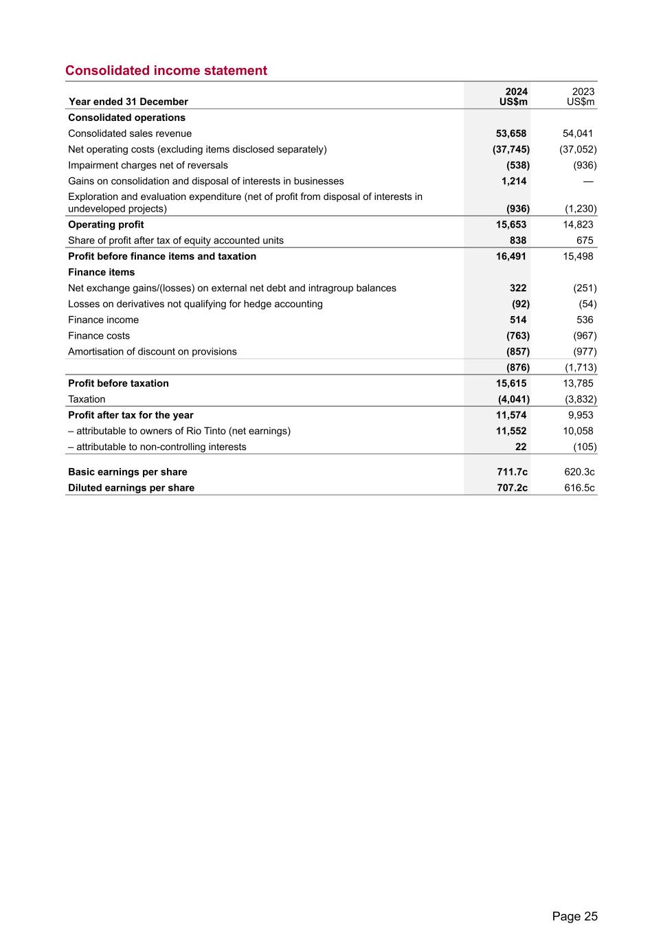 Consolidated income statement Year ended 31 December 2024 US$m 2023 US$m Consolidated operations Consolidated sales revenue 53,658 54,041 Net operating costs (excluding items disclosed separately) (37,745) (37,052) Impairment charges net of reversals (538) (936) Gains on consolidation and disposal of interests in businesses 1,214 — Exploration and evaluation expenditure (net of profit from disposal of interests in undeveloped projects) (936) (1,230) Operating profit 15,653 14,823 Share of profit after tax of equity accounted units 838 675 Profit before finance items and taxation 16,491 15,498 Finance items Net exchange gains/(losses) on external net debt and intragroup balances 322 (251) Losses on derivatives not qualifying for hedge accounting (92) (54) Finance income 514 536 Finance costs (763) (967) Amortisation of discount on provisions (857) (977) (876) (1,713) Profit before taxation 15,615 13,785 Taxation (4,041) (3,832) Profit after tax for the year 11,574 9,953 – attributable to owners of Rio Tinto (net earnings) 11,552 10,058 – attributable to non-controlling interests 22 (105) Basic earnings per share 711.7c 620.3c Diluted earnings per share 707.2c 616.5c Page 25