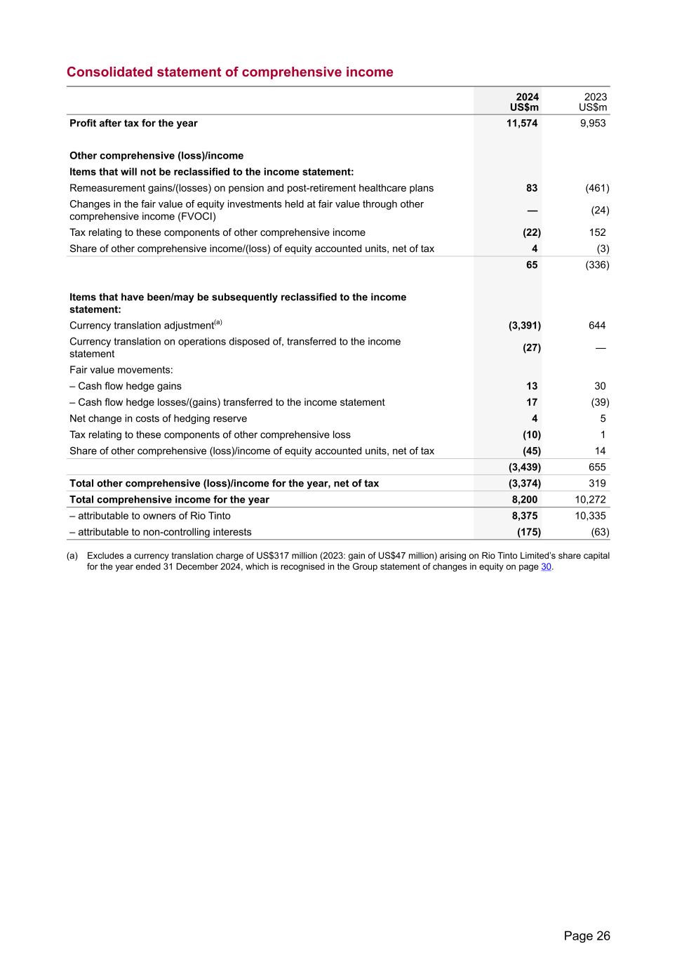 Consolidated statement of comprehensive income 2024 US$m 2023 US$m Profit after tax for the year 11,574 9,953 Other comprehensive (loss)/income Items that will not be reclassified to the income statement: Remeasurement gains/(losses) on pension and post-retirement healthcare plans 83 (461) Changes in the fair value of equity investments held at fair value through other comprehensive income (FVOCI) — (24) Tax relating to these components of other comprehensive income (22) 152 Share of other comprehensive income/(loss) of equity accounted units, net of tax 4 (3) 65 (336) Items that have been/may be subsequently reclassified to the income statement: Currency translation adjustment(a) (3,391) 644 Currency translation on operations disposed of, transferred to the income statement (27) — Fair value movements: – Cash flow hedge gains 13 30 – Cash flow hedge losses/(gains) transferred to the income statement 17 (39) Net change in costs of hedging reserve 4 5 Tax relating to these components of other comprehensive loss (10) 1 Share of other comprehensive (loss)/income of equity accounted units, net of tax (45) 14 (3,439) 655 Total other comprehensive (loss)/income for the year, net of tax (3,374) 319 Total comprehensive income for the year 8,200 10,272 – attributable to owners of Rio Tinto 8,375 10,335 – attributable to non-controlling interests (175) (63) (a) Excludes a currency translation charge of US$317 million (2023: gain of US$47 million) arising on Rio Tinto Limited’s share capital for the year ended 31 December 2024, which is recognised in the Group statement of changes in equity on page 30. Page 26